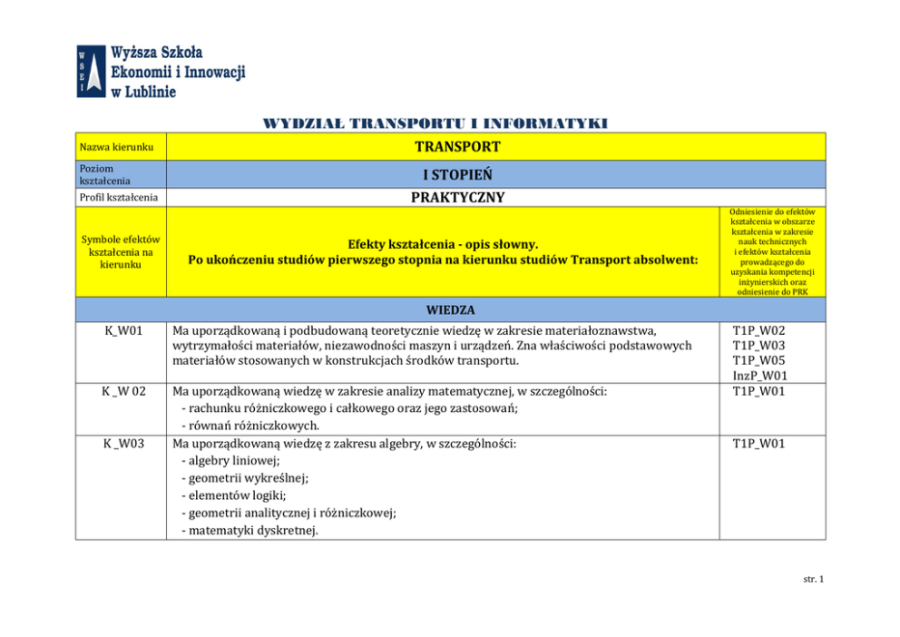 WYDZIAŁ TRANSPORTU I INFORMATYKI Nazwa kierunku Poziom kształcenia Profil kształcenia Symbole efektów kształcenia na kierunku TRANSPORT I STOPIEŃ PRAKTYCZNY Efekty kształcenia - opis słowny. Po ukończeniu studiów pierwszego stopnia na kierunku studiów Transport absolwent: Odniesienie do efektów kształcenia w obszarze kształcenia w zakresie nauk technicznych i efektów kształcenia prowadzącego do uzyskania kompetencji inżynierskich oraz odniesienie do PRK WIEDZA K_W01 Ma uporządkowaną i podbudowaną teoretycznie wiedzę w zakresie materiałoznawstwa, wytrzymałości materiałów, niezawodności maszyn i urządzeń. Zna właściwości podstawowych materiałów stosowanych w konstrukcjach środków transportu. K _W 02 Ma uporządkowaną wiedzę w zakresie analizy matematycznej, w szczególności: - rachunku różniczkowego i całkowego oraz jego zastosowań; - równań różniczkowych. Ma uporządkowaną wiedzę z zakresu algebry, w szczególności: - algebry liniowej; - geometrii wykreślnej; - elementów logiki; - geometrii analitycznej i różniczkowej; - matematyki dyskretnej. K _W03 T1P_W02 T1P_W03 T1P_W05 InzP_W01 T1P_W01 T1P_W01 str. 1 K _W04 Ma wiedzę w zakresie ekonomii oraz organizacji i zarządzania umożliwiającą prowadzenie działalności gospodarczej, kierowania przedsiębiorstwem transportowym oraz zarządzania finansami przedsiębiorstwa. K _W05 Ma uporządkowaną wiedzę w zakresie fizyki, termodynamiki, mechaniki zużycia elementów maszyn niezbędną do zrozumienia wybranych procesów fizyko-chemicznych. K _W06 Ma uporządkowaną wiedze ogólną i związaną z dziedziną, którą studiuje, znajomość struktur gramatycznych i słownictwa dotyczących rozumienia i tworzenia różnych rodzajów tekstów pisanych i mówionych. Ma podstawową wiedzę z metrologii, zna i rozumie metody badań, zasady projektowania eksperymentu, ich prowadzenia oraz dokumentowania wyników pomiarów łącznie z graficznym przedstawieniem zadań inżynierskich. K _W07 K _W08 Ma podstawową wiedzę z zakresu budowy, napędów, zasad działania i eksploatacji środków transportu oraz organizacji baz transportowych, otoczenia usług serwisowych i materiałów eksploatacyjnych. Orientuje się w obecnym stanie i trendach rozwojowych budowy i eksploatacji środków transportu. K _W09 Ma uporządkowaną, podbudowaną teoretycznie wiedzę w zakresie projektowania, wytwarzania i budowy środków transportu. Zna typowe programy do tworzenia dokumentacji konstrukcyjnej oraz modelowania bryłowego elementów konstrukcyjnych środków transportu. K _W10 Ma podstawową wiedzę w zakresie systemów i urządzeń telematyki transportu, elementów, układów automatyki i sterowania oraz układów wykonawczych. Zna możliwości wykorzystania systemów telematycznych do optymalizowania łańcuchów transportowych. K _W11 Ma elementarną wiedzę w zakresie inżynierii bezpieczeństwa drogowego. T1P_W02 T1P_W08 T1P_W09 InzP_W05 InzP_W06 T1P_W01 T1P_W06 InzP_W02 InzP_W06 T1P_W01 T1P_W03 T1P_W04 T1P_W01 T1P_W02 T1P_W03 T1P_W04 T1P_W02 T1P_W03 T1P_W05 T1P_W06 InzP_W01 InzP_W02 InzP_W03 T1P_W03 T1P_W04 T1P_W06 InzP_W02 T1P_W02 T1P_W03 T1P_W06 InzP_W02 T1P_W03 str. 2 K _W12 K _W13 Ma uporządkowana wiedzę z zakresu podstawowych praw elektrotechniki, obwodów prądu stałego i przemiennego, zna właściwości podstawowych elementów obwodów elektrycznych, projektuje proste układy elektryczne. Ma podstawową wiedzę z zakresu regulacji prawnych w transporcie, spedycji i obsłudze celnej. Zna zasady wypełniania dokumentów transportowych. K _W14 Ma podstawową wiedzę z obszaru planowania i organizacji przepływu osób i ładunków, uwzględniających warunki i mechanizmy funkcjonowania przedsiębiorstw, zasady marketingu i podstawową wiedzę z zakresu gospodarowania, zarządzania, planowania, realizowania i kontrolowania przepływu dóbr i informacji. K _W15 Ma uporządkowaną i podbudowaną teoretycznie wiedzę z teorii ruchu, metod i technik organizacji, zarządzania i sterowania, modelowania i optymalizacji potoków transportowych; w stopniu zaawansowanym zna złożone zależności funkcjonowania systemów transportowych w środowisku zurbanizowanym. K _W16 Ma podstawową wiedzę w zakresie planowania, projektowania, prognozowania, identyfikacji i pomiaru parametrów ilościowych i jakościowych systemów i procesów transportowych i infrastruktury, zna zasady utrzymania obiektów i systemów technicznych. K _W17 Ma wiedzę niezbędną do rozumienia pozatechnicznych uwarunkowań działalności inżynierskiej, w tym zagrożeń ekologicznych, zdrowotnych; zna podstawowe zasady bezpieczeństwa i higieny pracy obowiązujące w transporcie. Potrafi praktycznie stosować zasady recyklingu pojazdów. Rozumie złożone uwarunkowania prowadzenia przedsiębiorstwa transportowego Ma wiedzę z zakresu podstaw technologii informacyjnych, komputerowych, programistycznych, pozyskiwania i przetwarzania informacji. K _W18 T1P_W02 T1P_W03 T1P_W08 T1P_W09 T1P_W11 InzP_W06 T1P_W03 T1P_W08 T1P_W09 T1P_W10 T1P_W11 InzP_W05 InzP_W06 T1P_W03 T1P_W04 T1P_W07 InzP_W04 P6U_W T1P_W03 T1P_W04 T1P_W07 InzP_W03 InzP_W04 T1P_W02 T1P_W08 T1A_W02 T1A_W04 UMIEJĘTNOŚCI str. 3 K _U01 Potrafi obsługiwać przyrządy, urządzenia i maszyny zgodnie z zasadami zachowania bezpieczeństwa, ochrony środowiska, ergonomii i przepisów ppoż. K _U02 Umie posługiwać się regułami logiki matematycznej w zastosowaniach inżynierskich. K _U03 Potrafi wykorzystać poznane metody i modele matematyczne do analizy podstawowych zagadnień fizycznych i technicznych, w szczególności: - umie korzystać z rachunku różniczkowego w celu rozwijania zadań optymalizacyjnych i aproksymacyjnych; - umie korzystać z rachunku macierzowego, rozwiązywać układy równań liniowych; - umie rozwiązywać podstawowe typy równań różniczkowych opisujących zjawiska fizyczne. Potrafi zastosować wiedzę z zakresu teorii kolejek do oceny funkcjonowania s