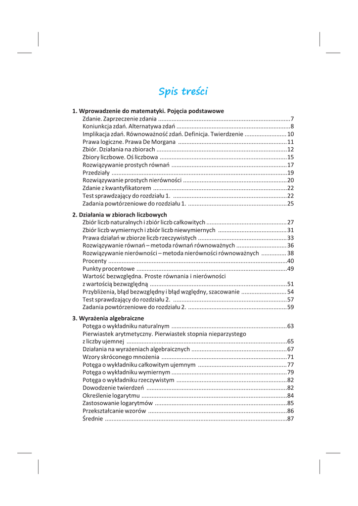 Spis treœci 1. Wprowadzenie do matematyki. Pojêcia podstawowe Zdanie. Zaprzeczenie zdania ...............................................................................7 Koniunkcja zdañ. Alternatywa zdañ ....................................................................8 Implikacja zdañ. Równowa¿noœæ zdañ. Definicja. Twierdzenie ......................... 10 Prawa logiczne. Prawa De Morgana .................................................................11 Zbiór. Dzia³ania na zbiorach ..............................................................................12 Zbiory liczbowe. Oœ liczbowa ............................................................................15 Rozwi¹zywanie prostych równañ .....................................................................17 Przedzia³y .........................................................................................................19 Rozwi¹zywanie prostych nierównoœci ..............................................................20 Zdanie z kwantyfikatorem ................................................................................22 Test sprawdzaj¹cy do rozdzia³u 1. ....................................................................22 Zadania powtórzeniowe do rozdzia³u 1. ...........................................................25 2. Dzia³ania w zbiorach liczbowych Zbiór liczb naturalnych i zbiór liczb ca³kowitych ................................................27 Zbiór liczb wymiernych i zbiór liczb niewymiernych .........................................31 Prawa dzia³añ w zbiorze liczb rzeczywistych .....................................................33 Rozwi¹zywanie równañ – metoda równañ równowa¿nych .............................. 36 Rozwi¹zywanie nierównoœci – metoda nierównoœci równowa¿nych ............... 38 Procenty ...........................................................................................................40 Punkty procentowe ..........................................................................................49 Wartoœæ bezwzglêdna. Proste równania i nierównoœci z wartoœci¹ bezwzglêdn¹ ..................................................................................51 Przybli¿enia, b³¹d bezwzglêdny i b³¹d wzglêdny, szacowanie ........................... 54 Test sprawdzaj¹cy do rozdzia³u 2. ....................................................................57 Zadania powtórzeniowe do rozdzia³u 2. ...........................................................59 3. Wyra¿enia algebraiczne Potêga o wyk³adniku naturalnym .....................................................................63 Pierwiastek arytmetyczny. Pierwiastek stopnia nieparzystego z liczby ujemnej ................................................................................................65 Dzia³ania na wyra¿eniach algebraicznych .........................................................67 Wzory skróconego mno¿enia ...........................................................................71 Potêga o wyk³adniku ca³kowitym ujemnym .....................................................77 Potêga o wyk³adniku wymiernym .....................................................................79 Potêga o wyk³adniku rzeczywistym ..................................................................82 Dowodzenie twierdzeñ ....................................................................................82 Okreœlenie logarytmu .......................................................................................84 Zastosowanie logarytmów ...............................................................................85 Przekszta³canie wzorów ...................................................................................86 Œrednie .............................................................................................................87 Test sprawdzaj¹cy do rozdzia³u 3. ....................................................................90 Zadania powtórzeniowe do rozdzia³u 3. ...........................................................92 4. Geometria p³aska – pojêcia wstêpne Punkt, prosta, odcinek, pó³prosta, k¹t, figura wypuk³a, figura ograniczona ............................................................................................96 Wzajemne po³o¿enie prostych na p³aszczyŸnie, odleg³oœæ punktu od prostej, odleg³oœæ miêdzy prostymi równoleg³ymi, symetralna odcinka, dwusieczna k¹ta ...............................................................................100 Dwie proste przeciête trzeci¹ prost¹ ..............................................................101 Twierdzenie Talesa .........................................................................................102 Okr¹g i ko³o .....................................................................................................105 K¹ty i ko³a .......................................................................................................107 Test sprawdzaj¹cy do rozdzia³u 4. ..................................................................108 Zadania powtórzeniowe do rozdzia³u 4. .........................................................111 5. Geometria p³aska – trójk¹ty Podzia³ trójk¹tów. Suma k¹tów w trójk¹cie. Nierównoœæ trójk¹ta. Odcinek ³¹cz¹cy œrodki dwóch boków w trójk¹cie ..........................................114 Twierdzenie Pitagorasa. Twierdzenie odwrotne do twierdzenia Pitagorasa ......................................................................................................117 Wysokoœci w trójk¹cie. Œrodkowe w trójk¹cie ................................................119 Symetralne boków trójk¹ta. Okr¹g opisany na trójk¹cie ................................ 122 Dwusieczne k¹tów trójk¹ta. Okr¹g wpisany w trójk¹t ....................................123 Przystawanie trójk¹tów