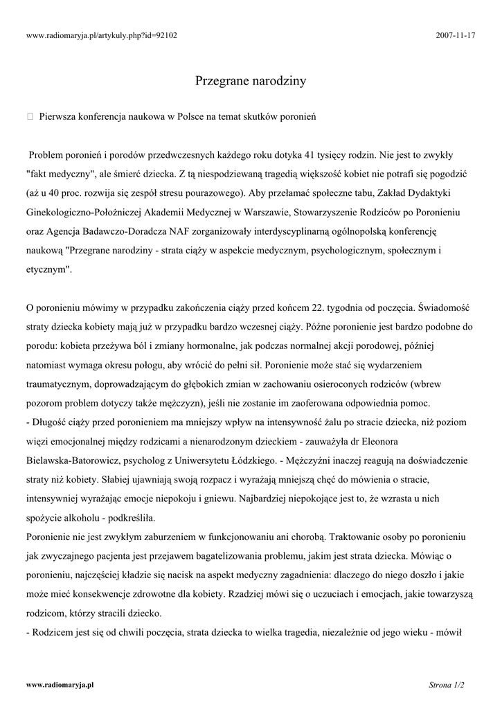 www.radiomaryja.pl/artykuly.php?id=92102 2007-11-17 Przegrane narodziny Pierwsza konferencja naukowa w Polsce na temat skutków poronień Problem poronień i porodów przedwczesnych każdego roku dotyka 41 tysięcy rodzin. Nie jest to zwykły "fakt medyczny", ale śmierć dziecka. Z tą niespodziewaną tragedią większość kobiet nie potrafi się pogodzić (aż u 40 proc. rozwija się zespół stresu pourazowego). Aby przełamać społeczne tabu, Zakład Dydaktyki Ginekologiczno-Położniczej Akademii Medycznej w Warszawie, Stowarzyszenie Rodziców po Poronieniu oraz Agencja Badawczo-Doradcza NAF zorganizowały interdyscyplinarną ogólnopolską konferencję naukową "Przegrane narodziny - strata ciąży w aspekcie medycznym, psychologicznym, społecznym i etycznym". O poronieniu mówimy w przypadku zakończenia ciąży przed końcem 22. tygodnia od poczęcia. Świadomość straty dziecka kobiety mają już w przypadku bardzo wczesnej ciąży. Późne poronienie jest bardzo podobne do porodu: kobieta przeżywa ból i zmiany hormonalne, jak podczas normalnej akcji porodowej, później natomiast wymaga okresu połogu, aby wrócić do pełni sił. Poronienie może stać się wydarzeniem traumatycznym, doprowadzającym do głębokich zmian w zachowaniu osieroconych rodziców (wbrew pozorom problem dotyczy także mężczyzn), jeśli nie zostanie im zaoferowana odpowiednia pomoc. - Długość ciąży przed poronieniem ma mniejszy wpływ na intensywność żalu po stracie dziecka, niż poziom więzi emocjonalnej między rodzicami a nienarodzonym dzieckiem - zauważyła dr Eleonora Bielawska-Batorowicz, psycholog z Uniwersytetu Łódzkiego. - Mężczyźni inaczej reagują na doświadczenie straty niż kobiety. Słabiej ujawniają swoją rozpacz i wyrażają mniejszą chęć do mówienia o stracie, intensywniej wyrażając emocje niepokoju i gniewu. Najbardziej niepokojące jest to, że wzrasta u nich spożycie alkoholu - podkreśliła. Poronienie nie jest zwykłym zaburzeniem w funkcjonowaniu ani chorobą. Traktowanie osoby po poronieniu jak zwyczajnego pacjenta jest przejawem bagatelizowania problemu, jakim jest strata dziecka. Mówiąc o poronieniu, najczęściej kładzie się nacisk na aspekt medyczny zagadnienia: dlaczego do niego doszło i jakie może mieć konsekwencje zdrowotne dla kobiety. Rzadziej mówi się o uczuciach i emocjach, jakie towarzyszą rodzicom, którzy stracili dziecko. - Rodzicem jest się od chwili poczęcia, strata dziecka to wielka tragedia, niezależnie od jego wieku - mówił www.radiomaryja.pl Strona 1/2 prof. Jan Wilczyński, przewodniczący Polskiego Towarzystwa Medycyny Perinatalnej. - Dlatego ważne jest, by już w szpitalu rodzice otrzymali niezbędną im pomoc i wsparcie - dodał. Organizatorom konferencji "Przegrane narodziny" zależy na określeniu wspólnej płaszczyzny porozumienia lekarzy, psychologów, socjologów oraz duchownych w odniesieniu do sposobów i jakości opieki medycznej, psychologicznej i duchowej oraz udzielania szeroko rozumianej pomocy kobietom i ich rodzinom po stracie dziecka w czasie ciąży lub krótko po narodzinach (dotyczy to zarówno poronień, porodów przedwczesnych, jak i martwych urodzeń). W tym celu zaplanowano m.in. zajęcia warsztatowe dla położnych, by przygotować je do profesjonalnego udzielania wsparcia kobietom, które dotknęła trauma poronienia. Maria Cholewińska www.radiomaryja.pl Strona 2/2
