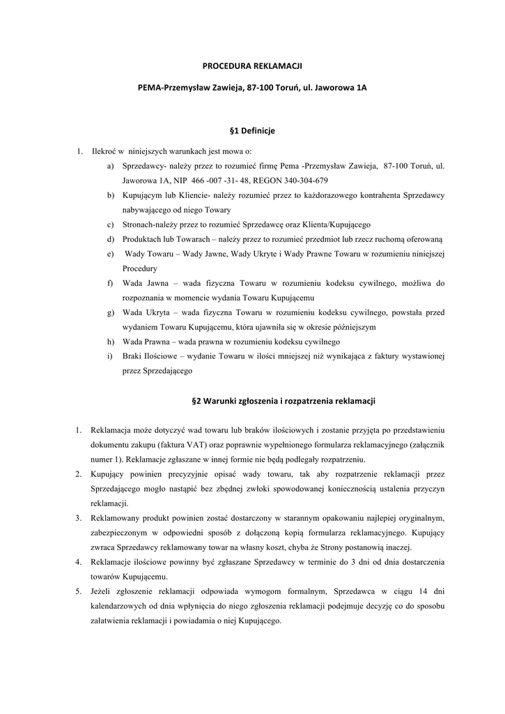 PROCEDURA REKLAMACJI PEMA-‐Przemysław Zawieja, 87-‐100 Toruń, ul. Jaworowa 1A §1 Definicje 1. Ilekroć w niniejszych warunkach jest mowa o: a) Sprzedawcy- należy przez to rozumieć firmę Pema -Przemysław Zawieja, 87-100 Toruń, ul. Jaworowa 1A, NIP 466 -007 -31- 48, REGON 340-304-679 b) Kupującym lub Kliencie- należy rozumieć przez to każdorazowego kontrahenta Sprzedawcy nabywającego od niego Towary c) Stronach-należy przez to rozumieć Sprzedawcę oraz Klienta/Kupującego d) Produktach lub Towarach – należy przez to rozumieć przedmiot lub rzecz ruchomą oferowaną e) Wady Towaru – Wady Jawne, Wady Ukryte i Wady Prawne Towaru w rozumieniu niniejszej Procedury f) Wada Jawna – wada fizyczna Towaru w rozumieniu kodeksu cywilnego, możliwa do rozpoznania w momencie wydania Towaru Kupującemu g) Wada Ukryta – wada fizyczna Towaru w rozumieniu kodeksu cywilnego, powstała przed wydaniem Towaru Kupującemu, która ujawniła się w okresie późniejszym h) Wada Prawna – wada prawna w rozumieniu kodeksu cywilnego i) Braki Ilościowe – wydanie Towaru w ilości mniejszej niż wynikająca z faktury wystawionej przez Sprzedającego §2 Warunki zgłoszenia i rozpatrzenia reklamacji 1. Reklamacja może dotyczyć wad towaru lub braków ilościowych i zostanie przyjęta po przedstawieniu dokumentu zakupu (faktura VAT) oraz poprawnie wypełnionego formularza reklamacyjnego (załącznik numer 1). Reklamacje zgłaszane w innej formie nie będą podlegały rozpatrzeniu. 2. Kupujący powinien precyzyjnie opisać wady towaru, tak aby rozpatrzenie reklamacji przez Sprzedającego mogło nastąpić bez zbędnej zwłoki spowodowanej koniecznością ustalenia przyczyn reklamacji. 3. Reklamowany produkt powinien zostać dostarczony w starannym opakowaniu najlepiej oryginalnym, zabezpieczonym w odpowiedni sposób z dołączoną kopią formularza reklamacyjnego. Kupujący zwraca Sprzedawcy reklamowany towar na własny koszt, chyba że Strony postanowią inaczej. 4. Reklamacje ilościowe powinny być zgłaszane Sprzedawcy w terminie do 3 dni od dnia dostarczenia towarów Kupującemu. 5. Jeżeli zgłoszenie reklamacji odpowiada wymogom formalnym, Sprzedawca w ciągu 14 dni kalendarzowych od dnia wpłynięcia do niego zgłoszenia reklamacji podejmuje decyzję co do sposobu załatwienia reklamacji i powiadamia o niej Kupującego. 6. W przypadku wad towaru w pierwszej kolejności Sprzedawca dokonuje usunięcia wad towaru. W sytuacji jeżeli usunięcie wad towaru jest niemożliwe, Sprzedawca dokonuje wymiany towaru na pozbawiony wad. 7. Jeżeli nie jest możliwe usunięcie wad tkwiących w nabytym przez Kupującego Towarze oraz nie jest możliwa wymiana towaru na wolny od wad, zaś wada towaru jest nieistotna, Kupującemu przysługuje prawo do żądania obniżenia ceny w stosunku, w jakim pozostaje wartość stwierdzonej wady do wartości nabytego przez Kupującego towaru. 8. Jeżeli nie jest możliwe usunięcie wad tkwiących w nabytym przez Kupującego towarze oraz nie jest możliwa wymiana towaru na wolny od wad, zaś wada towaru jest istotna, Kupującemu przysługuje prawo odstąpienia od umowy sprzedaży. W przypadku zwrotu towaru wskutek odstąpienia Kupującego od umowy, Sprzedawca wystawi fakturę korygującą. §3 Wyłączenie odpowiedzialności 1. Sprzedawca nie ponosi odpowiedzialności z tytułu rękojmi, jeżeli Kupujący w chwili wydania mu Towaru o wadach wiedział. 2. Sprzedawca nie ponosi odpowiedzialności za wady, które powstały po wydaniu Towaru Kupującemu, chyba że wady wynikły z przyczyny tkwiącej uprzednio w Towarze. §4 Postanowienia końcowe 1. Prawa i obowiązki stron reguluje treść postanowień ujętych w niniejszej Procedurze reklamacji, z którymi kupujący powinien się zapoznać przed dokonaniem zakupu. Niniejsza Procedura reklamacji stanowi integralną część każdej umowy sprzedaży Towaru.
