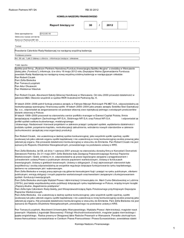 Rubicon Partners NFI SA RB 30 2012 KOMISJA NADZORU FINANSOWEGO Raport bieżący nr Data sporządzenia: 30 / 2012 2012-05-16 Skrócona nazwa emitenta Rubicon Partners NFI SA Temat Powołanie Członków Rady Nadzorczej na następną wspólną kadencję Podstawa prawna Art. 56 ust. 1 pkt 2 Ustawy o ofercie - informacje bieżące i okresowe Treść raportu: Spółka pod firmą: „Rubicon Partners Narodowy Fundusz Inwestycyjny Spółka Akcyjna” z siedzibą w Warszawie (dalej jako „Fundusz”), informuje, iż w dniu 16 maja 2012 roku Zwyczajne Walne Zgromadzenie Funduszu powołało Radę Nadzorczą na następną nową wspólną siódmą kadencję w następującym składzie: Pan Robert Ciszek Pani Zofia Bielecka Pan Tomasz Łuczyński Pan Artur Olszewski Pan Waldemar Wasiluk Pan Robert Ciszek, Absolwent Szkoły Głównej Handlowej w Warszawie. Od roku 2000 prowadzi działalność w zakresie M&A. Obecnie wspólnik w spółce RKR Investmenti Partnerzy Sp. K. W latach 2004–2006 pełnił funkcję prezesa zarządu w Fabryce Maszyn Rolniczych PILMET S.A., odpowiedzialny za restrukturyzację operacyjną i finansową spółki. W latach 2000–2004 jako prezes zarządu Sokółka Sieć Dystrybucji Sp. o.o., odpowiadał za zorganizowanie od podstaw własnej sieci dystrybucji jednego z wiodących producentów stolarki okiennej w Polsce. W latach 1999–2000 pracował na stanowisku senior portfolio manager w Everest Capital Polska, firmie zarządzającej majątkiem Zachodniego NFI S.A., Siódmego NFI S.A. oraz Foksal NFI S.A. i odpowiadał za portfel spółek sektora budowlanego, metalurgicznego i drzewnego. Nadzorował i kierował projektami w zakresie przejęć i połączeń spółek, wydzielania działalności i podziału spółek, pozyskania kapitału, restrukturyzacji zatrudnienia, wdrożenia nowych standardów w zakresie rachunkowości zarządczej oraz organizacji produkcji. Pan Robert Ciszek, nie uczestniczy w żadnej spółce konkurencyjnej jako wspólnik spółki cywilnej, spółki osobowej lub jako członek organu spółki kapitałowej i nie uczestniczy w innej konkurencyjnej osobie prawnej jako członek jej organu. Nie prowadzi działalności konkurencyjnej w stosunku do Emitenta. Pan Robert Ciszek nie jest wpisany do Rejestru Dłużników Niewypłacalnych, prowadzonego na podstawie ustawy o KRS. Pani Zofia Bielecka, lat 58, od dnia 1 czerwca 2001 pracuje na stanowisku doradcy firmy w Kancelarii Domański Zakrzewski Palinka. Do 31 maja 2001 Zofia Bielecka była Zastępcą Przewodniczącego Komisji Papierów Wartościowych i Giełd, w której m.in. odpowiedzialna za prace legislacyjne związane z przygotowaniem i uchwaleniem ustawy Prawo o publicznym obrocie papierami wartościowymi, Ustawy o funduszach inwestycyjnych, Ustawy o giełdach towarowych, Ustawy o obligacjach. Z racji zajmowanych stanowisk była współtwórcą i osobą odpowiedzialną za wszystkie regulacje dotyczące funkcjonowania rynku kapitałowego, zarówno na ustawowym jak i wykonawczym. Pani Zofia Bielecka w swojej pracy zajmuje się głównie transakcjami fuzji i przejęć na rynku publicznym, ofertami publicznymi, emisją obligacji i innych papierów wartościowych oraz kwestiami związanymi z funkcjonowaniem spółek i funduszy inwestycyjnych. Pani Zofia Bielecka ukończyła Wydział Prawa i Administracji Uniwersytetu im. Marii Curie-Skłodowskiej w Lublinie (1975r), jest także współautorką wielu publikacji dotyczących rynku kapitałowego w Polsce, między innymi książki „Papiery dłużne. Zagadnienia praktyczne”. Pani Zofia była Członkiem Rady Giełdy, jest Wiceprzewodniczącą Sądu Polubownego przy Krajowym Depozycie Papierów Wartościowych. Pani Zofia Bielecka, nie uczestniczy w żadnej spółce konkurencyjnej jako wspólnik spółki cywilnej, spółki osobowej lub jako członek organu spółki kapitałowej i nie uczestniczy w innej konkurencyjnej osobie prawnej jako członek jej organu. Nie prowadzi działalności konkurencyjnej w stosunku do Emitenta. Pani Zofia Bielecka nie jest wpisana do Rejestru Dłużników Niewypłacalnych, prowadzonego na podstawie ustawy o KRS. Pan Tomasz Łuczyński, Absolwent Uniwersytetu Warszawskiego, Wydziału Prawa i Administracji, magister nauk prawnych i Wydziału Lingwistyki Stosowanej i Filologii Wschodniosłowiańskich, magister języka niemieckiego i języka angielskiego. Radca prawny w Okręgowej Izbie Radców Prawnych w Warszawie. Ponadto ukończył kurs prawa francuskiego i europejskiego w Centrum Prawa Francuskiego i Prawa Europejskiego, powstałego dzięki Komisja Nadzoru Finansowego 1 Rubicon Partners NFI SA RB 30 2012 prawa francuskiego i europejskiego w Centrum Prawa Francuskiego i Prawa Europejskiego, powstałego dzięki współpracy Uniwersytetu w Poitiers i Uniwersytetu Warszawskiego; kurs prawa niemieckiego i europejskiego w Centrum Prawa Niemieckiego i Prawa Europejskiego, powstałego dzięki współpracy Uniwersytetu w Bonn i Uniwersytetu Warszawskiego; a także kurs prawa angielskiego i europejskiego w Centrum Prawa Angielskiego i Prawa Europejskiego, powstałego dzięki współpracy Uniwersytetu w Cambridge i Uniwersytetu Warszawskiego. Od listopada 2006 r. wspólnik zarządzający kancelarii prawniczej Łuczyński i Wspólnicy Sp.k. W latach 2000-2004 pracował w BRE Bank S.A., gdzie w okresie od listopada 2000 r. do września 2003 r. był prawnikiem w Departamencie Inwestycji Finansowych a następnie od października 2003 r. do sierpnia 2004 r. był radcą prawnym w Departamencie Prawnym. Jest aktualnie członkiem rad nadzorczych spółek PEPEES S.A. oraz Call Center Poland S.A. Wcześniej zasiadał w radach nadzorczych spółek: Vistula S.A., Optimus S.A., Unimil S.A., BRE.locum S.A., PKM DUDA S.A.,, Opoka TFI S.A., Amathus TFI SA, Dom Maklerski Navigator S.A. Pan Tomasz Łuczyński, nie uczestniczy w żadnej spółce konkurencyjnej jako wspólnik spółki cywilnej, spółki osobowej lub jako członek organu spółki kapitałowej i nie uczestni