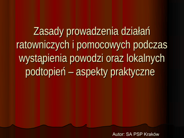 Zasady prowadzenia działań ratowniczych i pomocowych podczas wystąpienia powodzi oraz lokalnych podtopień – aspekty praktyczne Autor: SA PSP Kraków Zarządzanie kryzysowe – to działalność organów administracji publicznej będąca element kierowania bezpieczeństwem narodowym, która polega na: - zapobieganiu sytuacjom kryzysowym, - przygotowaniu do przejmowania nad nimi kontroli w drodze zaplanowanych działań, - reagowaniu w przypadku wystąpienia sytuacji kryzysowych - powodzi, - odtwarzaniu infrastruktury lub przywracaniu jej pierwotnego charakteru. Autor: SA PSP Kraków Reagowanie – działania ratownicze polega na podejmowaniu działań w celu udzielania pomocy poszkodowanym, zahamowaniu rozwoju występujących zagrożeń, ograniczeniu strat i zniszczeń. Wszystkie te przedsięwzięcia powinny mieć odniesienie w uprzednio opracowanych planach operacyjnych ochrony przed powodzią (Ust. O samorządach). Autor: SA PSP Kraków Kierowanie działaniami W czasie stanu klęski żywiołowej działaniami prowadzonymi w celu zapobieżenia skutkom klęski żywiołowej lub ich usunięcia kierują: 1) wójt (burmistrz, prezydent miasta) - jeżeli stan klęski żywiołowej wprowadzono tylko na obszarze gminy, 2) starosta - jeżeli stan klęski żywiołowej wprowadzono na obszarze więcej niż jednej gminy wchodzącej w skład powiatu, 3) wojewoda - jeżeli stan klęski żywiołowej wprowadzono na obszarze więcej niż jednego powiatu wchodzącego w skład województwa, 4) minister właściwy do spraw wewnętrznych - jeżeli stan klęski żywiołowej wprowadzono na obszarze więcej niż jednego województwa. Art. 8 Ust. O stanie klęski żywioł. Autor: SA PSP Kraków Główne przedsięwzięcia ostrzeganie i alarmowanie ludności, ewakuacja ludzi, zwierząt i mienia, zabezpieczanie i ochrona wałów przeciwpowodziowych oraz innych obiektów hydrotechnicznych, ochrona pozostawionego mienia na terenach zalanych, zapewnienie zastępczych miejsc pobytu, wypompowanie wody z zalanych obszarów lub obiektów, zapewnienie dostaw wody pitnej, lekarstw, żywności, środków higieny, zabezpieczenie przeciwepidemiologiczne, zapewnienie pasz dla zwierząt gospodarskich, materiały do zabezpieczenia uszkodzonych budynków, zapewnienie energii elektrycznej, (np. szpitale), paliwa. Autor: SA PSP Kraków Ostrzeganie i alarmowanie ludności Art. 34 Ust. prawo prasowe Redaktor naczelny jest obowiązany opublikować nieodpłatnie komunikat przekazywanych przez organy administracji rządowej i samorządu terytorialnego w zakresie sytuacji kryzysowych, o których mowa w ustawie z dnia 26 kwietnia 2007 r. o zarządzaniu kryzysowym (Dz. U. Nr89, poz. 590). Autor: SA PSP Kraków Ewakuacja ludzi, zwierząt i mienia • ILE JEST ZATOPIONYCH MIEJSCOWOŚCI • ILE OSÓB ZNAJDUJE SIĘ W ZALANYCH OBIEKTACH • ILE ZWIERZĄT GOSPODARSKICH NALEŻY EWAKUOWAĆ • ILE I JAKIE OBIEKTY ZOSTAŁY ZALANE • JAKA INFRASTRUKTURA JEST WYŁĄCZONA Z EKSPLOATACJI • ILE SZLAKÓW KOMUNIKACYJNYCH I NA JAKICH ODCINKACH JEST WYŁĄCZONE Z EKSPLOATACJI Autor: SA PSP Kraków Autor: SA PSP Kraków Znaki sygnalizacyjne, informacje Rozpoznanie w zalanym budynku ILE OSÓB PRZEBYWA WEWNĄTRZ BUDYNKU ILE OSÓB MOŻNA I TRZEBA PRZEKONAĆ DO EWAKUACJI W JAKIEJ SĄ KONDYCJI FIZYCZNEJ I PSYCHICZNEJ CZY WYSTĘPUJĄ JAKIEŚ ZAGROŻENIA W BUDYNKU NP: PĘKNIĘCIA ŚCIAN, ROZLANE PALIWA, ITP. JAKIE SĄ RZECZYWISTE POTRZEBY LUDZI, KTÓRZY POZOSTANĄ W BUDYNKU Autor: SA PSP Kraków ZASADY EWAKUACJI ZA POMOCĄ ŁODZI KAŻDEMU EWAKUOWANEMU ZAKŁADAMY KAMIZELKĘ RATUNKOWĄ KAŻDEMU POMAGAMY BEZPIECZNIE WEJŚĆ NA ŁÓDŹ PRZEPROWADZAMY KRÓTKI INSTRUKTAŻ O ZACHOWANIU SIĘ NA ŁODZI INFORMUJEMY O MIEJSCU, DO KTÓREGO WIEZIEMY EWAKUOWANYCH Autor: SA PSP Kraków EWAKUACJA ZWIERZĄT DUŻE ZWIERZĘTA GOSPODARSKIE MOŻNA EWAKUOWAĆ TRANSPORTERAMI PŁYWAJĄCYMI NAJLEPIEJ POD NADZOREM INSPEKCJI WETERYNARYJNEJ (KROWY, KONIE, TRZODA CHLEWNA) ZAŁADUNKU MOŻNA DOKONAĆ JEŻELI TRANSPORTER STOI NA TWARDYM GRUNCIE MAŁE ZWIERZĘTA EWAKUUJEMY NA ŁODZIACH RATOWNICZYCH ZAMKNIĘTE W KLATKACH LUB WORKACH Autor: SA PSP Kraków DOSTARCZANIE ZAOPATRZENIA DLA ZWIERZĄT ZWIERZĘTOM DOSTARCZAMY WODĘ PITNĄ PRZEWOŻONĄ W ZBIORNIKACH ODKAŻONYCH I SPRAWDZONYCH PRZEZ INSPEKCJĘ SANITARNĄ SUCHE MIESZANKI PASZOWE LUB PRASOWANE SIANO MUSI BYĆ W TRANSPORCIE ZABEZPIECZONE PRZED ZAMOCZENIEM BRUDNĄ WODĄ POWODZIOWĄ Autor: SA PSP Kraków Ochrona pozostawionego mienia na terenach zalanych Należy zadbać o prowadzenie patroli przez służby porządkowe oraz wprowadzić zakaz poruszania się po obszarze zalanym przez osoby postronne. Autor: SA PSP Kraków Zapewnienie dostaw wody pitnej, lekarstw, żywności, środków higieny WODA PITNA W FABRYCZNYCH PAKOWANYCH POJEMNIKACH (BUTELKI PET, POJEMNIKI 5 l) ŻYWNOŚĆ W SZCZELNYCH OPAKOWANIACH (KONSERWY, SŁOIKI, POJEMNIKI PLASTIKOWE) CHLEB W WORKACH FOLIOWYCH, ZAPAKOWANY W NIEPRZEMAKALNE POJEMNIKI Autor: SA PSP Kraków Zabezpieczanie i ochrona wałów przeciwpowodziowych oraz innych obiektów hydrotechnicznych Autor: SA PSP Kraków Autor: SA PSP Kraków Podwyższenie korony wału workami z piaskiem (max 1,0 m) Autor: SA PSP Kraków Podwyższenie korony wału folią i workami z piaskiem Podwyższenie korony wału przenośnymi zaporami Autor: SA PSP Kraków przeciwpowodziowymi (wymiary standardowe) Autor: SA PSP Kraków Podwyższenie korony wału pojedynczą ścianka drewnianą Autor: SA PSP Kraków Podwyższenie korony wału grodzą drewniano – ziemną Autor: SA PSP Kraków Zabezpieczenie przed przeciekami poprzez ułożenie folii na skarpie odwodnej Autor: SA PSP Kraków Zabezpieczenie przed przeciekami poprzez ułożenie folii na skarpie odwodnej wraz z podwyższeniem korony wału Autor: SA PSP Kraków Zabezpieczenie przed przeciekami przez korpus wału za pomocą grodzy z worków lub bali drewnianych Autor: SA PSP Kraków Zabezpieczenie przed przesiąkami i przebiciami przy stopie wału Autor: SA PSP Kraków Zabezpieczenie przed