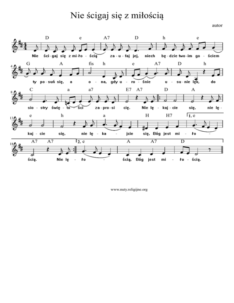 Nie ścigaj się z miłością autor D 4 8 e A7 D h e 4 13 18 G A C a e A7 fis a7 h A7 h e E7 A7 a 2. e A7 D D H A www.nuty.religijne.org A H7 A7 h 1. e D