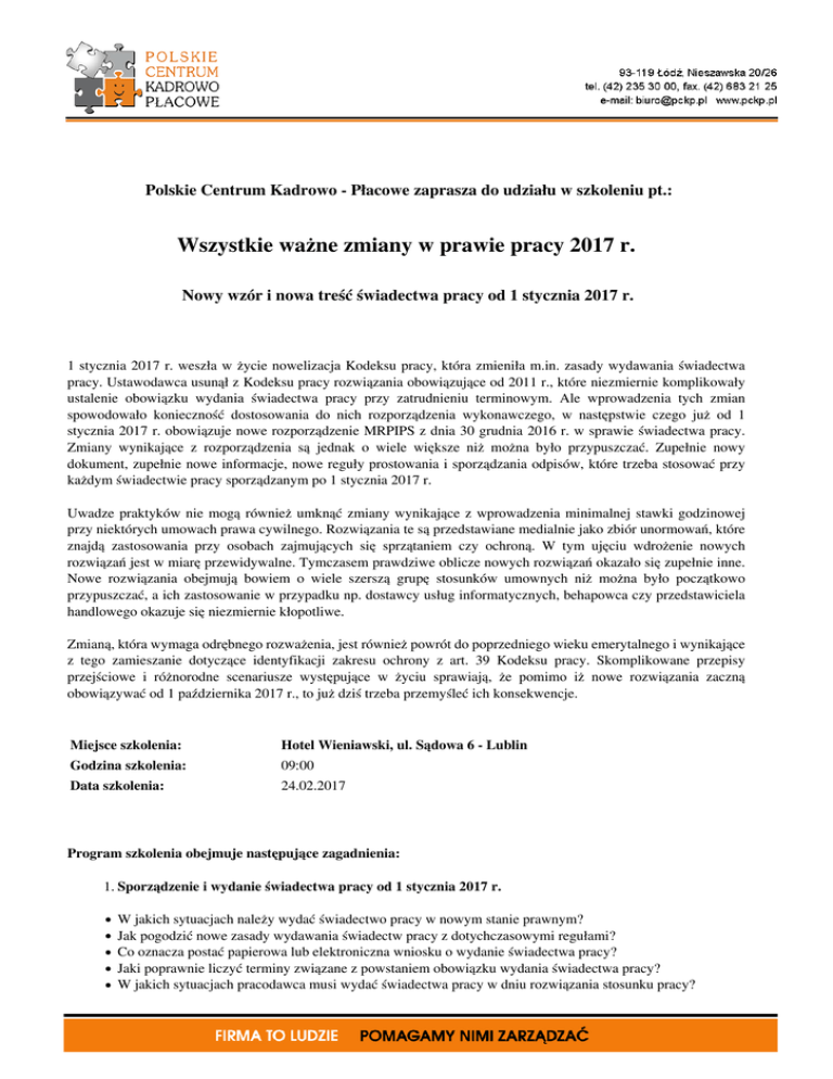 Polskie Centrum Kadrowo - Płacowe zaprasza do udziału w szkoleniu pt.: Wszystkie ważne zmiany w prawie pracy 2017 r. Nowy wzór i nowa treść świadectwa pracy od 1 stycznia 2017 r. 1 stycznia 2017 r. weszła w życie nowelizacja Kodeksu pracy, która zmieniła m.in. zasady wydawania świadectwa pracy. Ustawodawca usunął z Kodeksu pracy rozwiązania obowiązujące od 2011 r., które niezmiernie komplikowały ustalenie obowiązku wydania świadectwa pracy przy zatrudnieniu terminowym. Ale wprowadzenia tych zmian spowodowało konieczność dostosowania do nich rozporządzenia wykonawczego, w następstwie czego już od 1 stycznia 2017 r. obowiązuje nowe rozporządzenie MRPIPS z dnia 30 grudnia 2016 r. w sprawie świadectwa pracy. Zmiany wynikające z rozporządzenia są jednak o wiele większe niż można było przypuszczać. Zupełnie nowy dokument, zupełnie nowe informacje, nowe reguły prostowania i sporządzania odpisów, które trzeba stosować przy każdym świadectwie pracy sporządzanym po 1 stycznia 2017 r. Uwadze praktyków nie mogą również umknąć zmiany wynikające z wprowadzenia minimalnej stawki godzinowej przy niektórych umowach prawa cywilnego. Rozwiązania te są przedstawiane medialnie jako zbiór unormowań, które znajdą zastosowania przy osobach zajmujących się sprzątaniem czy ochroną. W tym ujęciu wdrożenie nowych rozwiązań jest w miarę przewidywalne. Tymczasem prawdziwe oblicze nowych rozwiązań okazało się zupełnie inne. Nowe rozwiązania obejmują bowiem o wiele szerszą grupę stosunków umownych niż można było początkowo przypuszczać, a ich zastosowanie w przypadku np. dostawcy usług informatycznych, behapowca czy przedstawiciela handlowego okazuje się niezmiernie kłopotliwe. Zmianą, która wymaga odrębnego rozważenia, jest również powrót do poprzedniego wieku emerytalnego i wynikające z tego zamieszanie dotyczące identyfikacji zakresu ochrony z art. 39 Kodeksu pracy. Skomplikowane przepisy przejściowe i różnorodne scenariusze występujące w życiu sprawiają, że pomimo iż nowe rozwiązania zaczną obowiązywać od 1 października 2017 r., to już dziś trzeba przemyśleć ich konsekwencje. Miejsce szkolenia: Hotel Wieniawski, ul. Sądowa 6 - Lublin Godzina szkolenia: 09:00 Data szkolenia: 24.02.2017 Program szkolenia obejmuje następujące zagadnienia: 1. Sporządzenie i wydanie świadectwa pracy od 1 stycznia 2017 r. W jakich sytuacjach należy wydać świadectwo pracy w nowym stanie prawnym? Jak pogodzić nowe zasady wydawania świadectw pracy z dotychczasowymi regułami? Co oznacza postać papierowa lub elektroniczna wniosku o wydanie świadectwa pracy? Jaki poprawnie liczyć terminy związane z powstaniem obowiązku wydania świadectwa pracy? W jakich sytuacjach pracodawca musi wydać świadectwa pracy w dniu rozwiązania stosunku pracy? W jakich sytuacjach wydanie świadectwa pracy może nastąpić w ciągu 7 dni od dnia ustania stosunku pracy? Czy świadectwo pracy można wydać za pośrednictwem firmy kurierskiej? Jakie konsekwencje niesie nadanie charakteru pomocniczego wzorowi świadectwa pracy? Czy świadectwo pracy może zostać sporządzone w sposób zupełnie odmienny od wzoru stanowiącego załącznik do rozporządzenia? Jakie dokumenty związane z wydaniem świadectwa pracy mogą być sporządzone w postaci papierowej lub elektronicznej, a jakie wymagają zastosowania formy pisemnej? Czy pracownik może wystąpić za pomocą poczty elektronicznej o sprostowanie treści świadectwa pracy? W jaki sposób w nowym stanie prawnym określić w świadectwie pracy rodzaj pracy wykonywanej przez pracownika oraz wymiar czasu pracy? W jakich sytuacjach i w jaki sposób należy wskazać w świadectwie pracy podstawę prawną rozwiązania stosunku pracy (np. art. 52 Kodeksu pracy)? W jakich sytuacjach należy w świadectwie pracy zawrzeć informację o wykorzystaniu urlopu ojcowskiego bądź urlopu rodzicielskiego? W jakich sytuacjach należy w świadectwie pracy wskazać imię i nazwisko dziecka, na który udzielono urlopu ojcowskiego, rodzicielskiego bądź wychowawczego? W jakim zakresie obowiązek wskazania korzystania z urlopów związanych z rodzicielstwem odnosi się do urlopów wykorzystanych przed 1 stycznia 2017 r.? W jakim sposób należy wykazać w świadectwie pracy wykorzystanie ochrony przysługującej pracownikowi korzystającemu z uprawnienia do obniżenia wymiaru czasu pracy w okresie, w którym był uprawniony do urlopu wychowawczego? W jaki sposób należy wykazać korzystanie przez pracownika ze zwolnienia, o którym mowa w art. 188 KP? W jaki sposób wpływa na treść świadectwa pracy łączenie urlopu rodzicielskiego z pracą w niepełnym wymiarze czasu pracy? W jaki sposób należy ująć w treści świadectwa pracy obniżenie wymiaru czasu pracy w okresie, w którym pracownik był uprawniony do urlopu wychowawczego? Jakie informacje należy zawrzeć w części świadectwa pracy dotyczącej wykorzystania dodatkowego urlopu albo innych uprawnień i świadczeń w nowym stanie prawnym? Jakie informacje należy zawrzeć w świadectwie pracy, gdy wynagrodzenie pracownika podlegało zajęciu? 2. Ochrona przedemerytalna po obniżeniu wieku emerytalnego Jaki jest zakres ochrony określonej w art. 39 kodeksu pracy? Czy ochrona wynikająca z art. 39 kodeksu pracy może trwać dłużej niż 4 lata? Do jakich sytuacji należy stosować przepisy przejściowe? Jakie przepisy stosować do pracowników, którzy w dacie wejścia w życie nowelizacji podlegają ochronie, a jakie do pracowników, którzy w takiej ochronie znajdą się dopiero po wejściu w życie zmian? W jakich sytuacjach ochrona będzie przysługiwała do ukończenia przez kobietę 60 lat a przez mężczyznę 65 lat? W jakich sytuacjach ochrona będzie przysługiwać do ukończenia aż 67 lat? 3. Pułapki i niespodzianki przy stosowaniu przepisów o minimalnej stawce godzinowej Jakie podmioty są zobowiązane do wypłacania wynagrodzenia