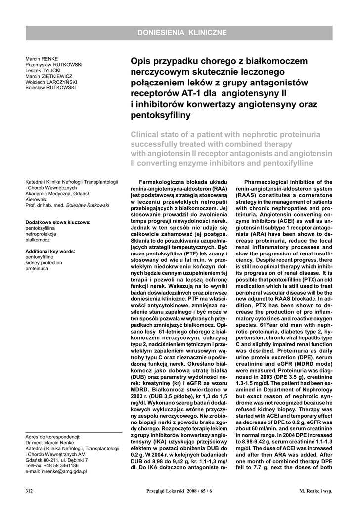 DONIESIENIA KLINICZNE Marcin RENKE Przemys³aw RUTKOWSKI Leszek TYLICKI Marcin ZIÊTKIEWICZ Wojciech LARCZYÑSKI Boles³aw RUTKOWSKI Opis przypadku chorego z bia³komoczem nerczycowym skutecznie leczonego po³¹czeniem leków z grupy antagonistów receptorów AT-1 dla angiotensyny II i inhibitorów konwertazy angiotensyny oraz pentoksyfiliny Clinical state of a patient with nephrotic proteinuria successfully treated with combined therapy with angiotensin II receptor antagonists and angiotensin II converting enzyme inhibitors and pentoxifylline Katedra i Klinika Nefrologii Transplantologii i Chorób Wewnêtrznych Akademia Medyczna, Gdañsk Kierownik: Prof. dr hab. med. Boles³aw Rutkowski Dodatkowe s³owa kluczowe: pentoksyfilina nefroprotekcja bia³komocz Additional key words: pentoxyfilline kidney protection proteinuria Adres do korespondencji: Dr med. Marcin Renke Katedra i Klinika Nefrologii, Transplantologii i Chorób Wewnêtrznych AM Gdañsk 80-211, ul. Dêbinki 7 Tel/Fax: +48 58 3461186 e-mail: [email protected] 312 Farmakologiczna blokada uk³adu renina-angiotensyna-aldosteron (RAA) jest podstawow¹ strategi¹ stosowan¹ w leczeniu przewlek³ych nefropatii przebiegaj¹cych z bia³komoczem. Jej stosowanie prowadzi³ do zwolnienia tempa progresji niewydolnoci nerek. Jednak w ten sposób nie udaje siê ca³kowicie zahamowaæ jej postêpu. Sk³ania to do poszukiwania uzupe³niaj¹cych strategii terapeutycznych. Byæ mo¿e pentoksyfilina (PTF) lek znany i stosowany od wielu lat m.in. w przewlek³ym niedokrwieniu koñczyn dolnych bêdzie cennym uzupe³nieniem tej terapii i pozwoli na lepsz¹ ochronê funkcji nerek. Wskazuj¹ na to wyniki badañ dowiadczalnych oraz pierwsze doniesienia kliniczne. PTF ma w³aciwoci antycytokinowe, zmniejsza nasilenie stanu zapalnego i byæ mo¿e w ten sposób pozwala w wybranych przypadkach zmniejszyæ bia³komocz. Opisano losy 61-letniego chorego z bia³komoczem nerczycowym, cukrzyc¹ typu 2, nadcinieniem têtniczym i przewlek³ym zapaleniem wirusowym w¹troby typu C oraz nieznacznie upoledzon¹ funkcj¹ nerek. Okrelano bia³komocz jako dobow¹ utratê bia³ka (DUB) oraz parametry wydolnoci nerek: kreatyninê (kr) i eGFR ze wzoru MDRD. Bia³komocz stwierdzono w 2003 r. (DUB 3,5 g/dobê), kr 1,3 do 1,5 mg/dl. Wykonano szereg badañ dodatkowych wykluczaj¹c wtórne przyczyny zespo³u nerczycowego. Nie zrobiono biopsji nerki z powodu braku zgody chorego. Rozpoczêto terapiê lekiem z grupy inhibitorów konwertazy angiotensyny (IKA) uzyskuj¹c przejciowy efektem w postaci obni¿enia DUB do 0,2 g. W 2004 r. w kolejnych badaniach DUB od 8,98 do 9,42 g, kr. 1,1-1,3 mg/ dl. Do IKA do³¹czono antagonistê re- Przegl¹d Lekarski 2008 / 65 / 6 Pharmacological inhibition of the renin-angiotensin-aldosteron system (RAAS) constitutes a cornerstone strategy in the management of patients with chronic nephropaties and proteinuria. Angiotensin converting enzyme inhibitors (ACEI) as well as angiotensin II subtype 1 receptor antagonists (ARA) have been shown to decrease proteinuria, reduce the local renal inflammatory processes and slow the progression of renal insufficiency. Despite recent progress, there is still no optimal therapy which inhibits progression of renal disease. It is possible that pentoxifilline (PTX) an old medication which is still used to treat peripheral vascular disease will be the new adjunct to RAAS blockade. In addition, PTX has been shown to decrease the production of pro inflammatory cytokines and reactive oxygen species. 61Year old man with nephrotic proteinuria, diabetes type 2, hypertension, chronic viral hepatitis type C and slightly impaired renal function was desribed. Proteinuria as daily urine protein excretion (DPE), serum creatinine and eGFR (MDRD mode) were measured. Proteinuria was diagnosed in 2003 (DPE 3.5 g), creatinine 1.3-1.5 mg/dl. The patient had been examined in Department of Nephrology but exact reason of nephrotic syndrome was not recognized because he refused kidney biopsy. Therapy was started with ACEI and temporary effect as decrease of DPE to 0.2 g, eGFR was about 60 ml/min. and serum creatinine in normal range. In 2004 DPE increased to 8.98-9.42 g, serum creatinine 1.1-1.3 mg/dl. The dose of ACEI was increased and after then ARA was added. After one month of combined therapy DPE fell to 7.7 g, next the doses of both M. Renke i wsp. ceptora AT-1 dla Angiotensyny II (ARA). Po miesi¹cu DUB wynosi³ 7,7 g. Zalecono dawki maksymalne obu leków (losartan 100 mg i lisiniopril 40 mg) co pozwoli³o na obni¿enie DUB do 6,8 g, kr 1,4 mg/dl, potas 5,4 mmol/l. Nastêpnie do³¹czono PTF w dawce 800 mg/dobê. W badaniach po 2 miesi¹cach wartoci DUB obni¿y³y siê do 0,55g. Efekt utrzymywa³ siê po 6 miesi¹cach (DUB 0,53 g, kr 1,29 mg/dl). eGFR i kreatynina nie uleg³y istotnym zmianom. W opisanym przypadku uzupe³nienie standardowej terapii ³¹czonej IKA+ARB przez PTF pozwoli³o na znaczne obni¿enie DUB. Wstêp Uk³ad renina-angiotensyna-aldosteron (RAA) odgrywa g³ówn¹ rolê w regulacji cinienia têtniczego, utrzymaniu homeostazy wodno-elektrolitowej oraz procesach zwi¹zanych z wzrostem i proliferacj¹ komórek. Istotnym zadaniem uk³adu RAA jest utrzymanie sta³ej objêtoci p³ynu wewn¹trznaczyniowego oraz systemowego cinienia krwi. Angiotensyna II (Ang II) jest g³ównym efektorem uk³adu RAA. Przewlek³e pobudzenie tego uk³adu mo¿e prowadziæ do niekorzystnych nastêpstw w uk³adzie sercowo naczyniowym. Wykazano, ¿e Ang II odgrywa kluczow¹ rolê w procesach zwi¹zanych z uszkodzeniem nerek oraz rozwojem i progresj¹ przewlek³ej ich niewydolnoci. Udzia³ uk³adu RAA w procesach chorobowych w obrêbie nerek nie ogranicza siê wy³¹cznie do dzia³ania Ang II. Wykazano, ¿e aldosteron mo¿e równie¿ bezporednio stymulowaæ procesy w³óknienia w nerkach na drodze aktywacji TGF-b1. Istniej¹ dwie podstawowe grupy leków, które zmniejszaj¹ efekty dzia³ania uk³adu RAA. Ograniczaj¹ one efekty biologiczne zwi¹zane