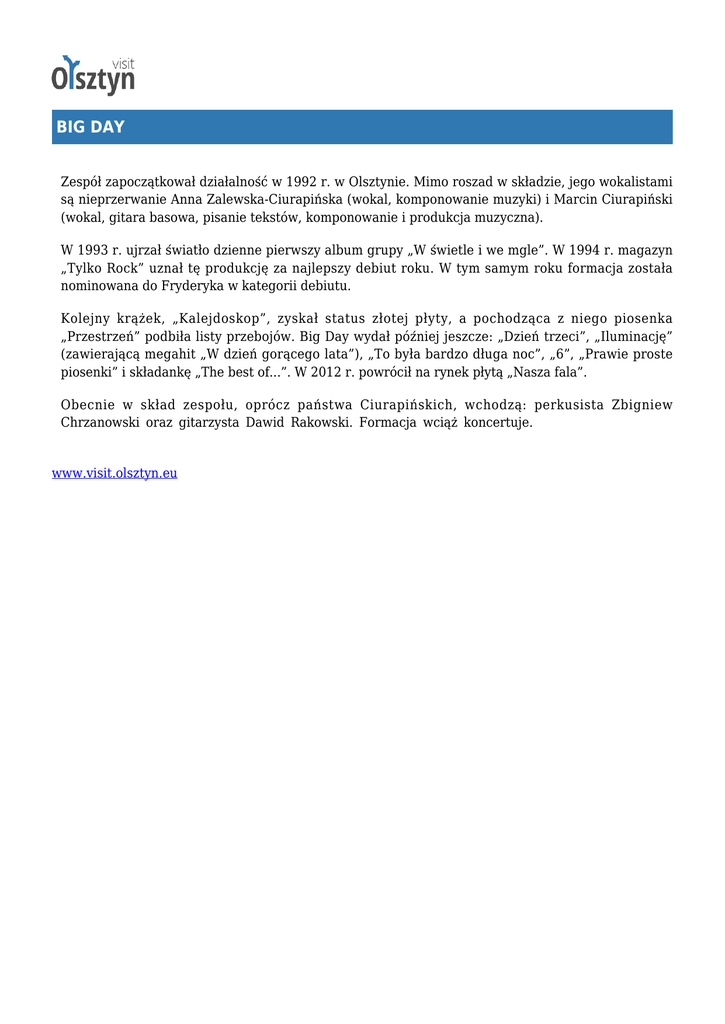 BIG DAY Zespół zapoczątkował działalność w 1992 r. w Olsztynie. Mimo roszad w składzie, jego wokalistami są nieprzerwanie Anna Zalewska-Ciurapińska (wokal, komponowanie muzyki) i Marcin Ciurapiński (wokal, gitara basowa, pisanie tekstów, komponowanie i produkcja muzyczna). W 1993 r. ujrzał światło dzienne pierwszy album grupy „W świetle i we mgle”. W 1994 r. magazyn „Tylko Rock” uznał tę produkcję za najlepszy debiut roku. W tym samym roku formacja została nominowana do Fryderyka w kategorii debiutu. Kolejny krążek, „Kalejdoskop”, zyskał status złotej płyty, a pochodząca z niego piosenka „Przestrzeń” podbiła listy przebojów. Big Day wydał później jeszcze: „Dzień trzeci”, „Iluminację” (zawierającą megahit „W dzień gorącego lata”), „To była bardzo długa noc”, „6”, „Prawie proste piosenki” i składankę „The best of...”. W 2012 r. powrócił na rynek płytą „Nasza fala”. Obecnie w skład zespołu, oprócz państwa Ciurapińskich, wchodzą: perkusista Zbigniew Chrzanowski oraz gitarzysta Dawid Rakowski. Formacja wciąż koncertuje. www.visit.olsztyn.eu
