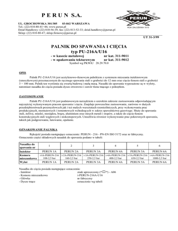 P E R U N S.A. UL. GROCHOWSKA 301/305 03-842 WARSZAWA Tel.: (22) 810-80-41÷46; www.perun.pl Dział Handlowy: (22) 810-56-39, fax: (22) 813-52-33; [email protected] Sklep: (22) 810-80-47; [email protected] UT 31-3/99 PALNIK DO SPAWANIA I CIĘCIA typ PU-216A/U16 - w kasecie metalowej - w opakowaniu tekturowym nr kat. 311-9011 nr kat. 311-9012 Symbol wg PKWiU 28.29.70.0 OPIS Palnik PU-216A/U16 jest acetylenowo-tlenowym palnikiem z systemem mieszania inżektorowym (smoczkowym) przeznaczonym do ręcznego spawania stali o grubości do 12 mm oraz cięcia tlenem stali o grubości 3 ÷ 100 mm. Palnik ten wyróżnia się zwartą budową i małą masą. Nasadki do spawania wyposażone są w wyloty, natomiast nasadka do cięcia posiada dysze otworowe i zawór tlenu tnącego z pokrętłem. ZASTOSOWANIE Palnik PU-216A/U16 jest podstawowym narzędziem o szerokim zakresie zastosowania odpowiadającym najczęściej wykonywanym pracom spawania i cięcia. Znajduje powszechne zastosowanie, zarówno w dużych przedsiębiorstwach przemysłowych jak i też małych warsztatach rzemieślniczych, przy wykonywaniu prac produkcyjnych, montażowych i remontowych wchodzących w zakres spawalnictwa gazowego. Służy do spawania stali, żeliwa, miedzi, mosiądzu, brązu, aluminium oraz innych metali i stopów, a także do cięcia tlenem konstrukcyjnych stali węglowych i niskostopowych. Umożliwia również wykonywanie prac pokrewnych spawaniu, takich jak podgrzewanie, lutowanie, opalanie. OZNAKOWANIE PALNIKA Rękojeść posiada następujące oznaczenie: PERUN - 216 - PN-EN ISO 5172 oraz nr fabryczny. Oznaczenie części składowych nasadek do spawania podano w tabeli: Nasadka do spawania nr Inżektor Komora mieszankowa Wylot 1 2 3 4 5 6 PERUN 1A PERUN 2A PERUN 3A PERUN 4A PERUN 5A PERUN 6A i-lA-PERUN-216 100-2,5 bar PERUN 1A i-2A-PERUN-216 i-3A-PERUN-216 i-4A-PERUN-216 i-5A-PERUN-216 i-6A-PERUN-216 160-2,5 bar 250-2,5 bar 400-2,5 bar 630-2,5 bar 1000-2,5 bar PERUN 2A PERUN 3A Nasadka do cięcia posiada następujące oznaczenia: - Inżektor znak uproszczony ( - Komora mieszankowa i-PERUN-216A-U16 - Główka nr fabryczny - Dysze tnące oznaczenie wg tabeli PERUN 4A ) - A06 PERUN 5A PERUN 6A 2 UT 31-3/99 DANE TECHNICZNE Dane do spawania Grubość materiału spawanego Nasadka Ciśnienie tlenu Ciśnienie acetylenu Zużycie tlenu Zużycie acetylenu mm do l 1÷2 2÷3 nr bar (MPa) bar (MPa) dm3/h dm3/h 1 2 3 120 100 185 160 3÷5 4 2,5 (0,25) 0,1÷0,3 (0,01÷0,03) 280 450 250 400 5÷8 8÷12 5 6 730 630 1150 1000 Masa palnika do spawania w zależności od nr nasadki wynosi 0,7÷0,9 kg. Dane do cięcia mm 3÷10 10÷30 30÷60 60÷100 Oznaczenie (nr) U16A 3-10 (1) U16A 10-30 (2) U16A 30-60 (3) U16A 60-100 (4) Ciśnienie tlenu bar (MPa) 1,5÷3 (0,15÷0,3) 2,5÷4 (0,25÷0,4) 3,5÷5 (0,35÷0,5) 4,5÷6 (0,45÷0,6) Ciśnienie acetylenu bar (MPa) Grubość cięcia Dysza Odległość dyszy od materiału Prędkość cięcia Zużycie tlenu Zużycie acetylenu 0,1÷0,4 (0,01÷0,04) 0,2÷0,4 (0,02÷0,04) mm mm/min m3/h m3/h 3÷8 600÷450 1,5÷2,5 0,3÷0,5 450÷350 2,5÷4 0,4÷0,7 350÷250 4÷8 0,6÷0,9 Są to wartości dla stali niskowęglowej o zawartości do 0,3 % C oraz dla tlenu o czystości 99,5 %. Masa palnika do cięcia - 1,30 kg. SKŁAD KOMPLETU W skład kompletu palnika PU-216 A/U16 (wg nr kat.): - Rękojeść typ 216 z nakrętką - Nasadki do spawania nr 1÷6 - Nasadka do cięcia - Dysze typ U16A - Przystawka do cięcia - Klucz* - Wałeczki do czyszczenia otworów - Uszczelki zapasowe - Opakowanie: kaseta metalowa - Opakowanie: pudełko tekturowe 311-9011 1 szt. 6 szt. 1 szt. 4 szt. 1 szt. 1 szt. 1 kpl. 1 kpl. 1 szt. - 311-9012 1 szt. 6 szt. 1 szt. 4 szt. 1 szt. 1 szt. 1 kpl. 1 kpl. 1 szt. * W miejsce klucza dopuszcza się stosowanie kluczy handlowych RWPd 10x12 Ni, RWPd 14x17 Ni i RWPd 19x22 Ni w opakowaniu. 250÷150 8÷11 0,8÷1 3 UT 31-3/99 Poz. 1. 2. 3. 4. 5. 6. 7. 8. 9. 10. 11. 12. 13. 14. Elementy palnika Nasadka do spawania nr 1 Nasadka do spawania nr 2 Nasadka do spawania nr 3 Nasadka do spawania nr 4 Nasadka do spawania nr 5 Nasadka do spawania nr 6 Rękojeść typ 216 Nakrętka do rękojeści typ 216 Nasadka do cięcia bez dysz Dysza nr 1 U16A 3-10 Dysza nr 2 U16A 10-30 Dysza nr 3 U16A 30-60 Dysza nr 4 U16A 60-100 Śruba dociskowa Nr kat. 153-2912 153-2922 153-2932 153-2942 153-2952 153-2962 190-1001 153-1801 157-3001 192-3011 192-3021 192-3031 192-3041 163-3101 INFORMACJE DODATKOWE 1. 2. Do kompletu palnika załączane są "Przepisy obsługi palników smoczkowych (inżektorowych)" wg nr 3D-1/98. Dla każdego kompletu palnika udzielana jest gwarancja na okres 12 miesięcy od daty sprzedaży (z wyjątkiem części szybko zużywających się), jednak nie dłużej niż 18 miesięcy od daty produkcji.