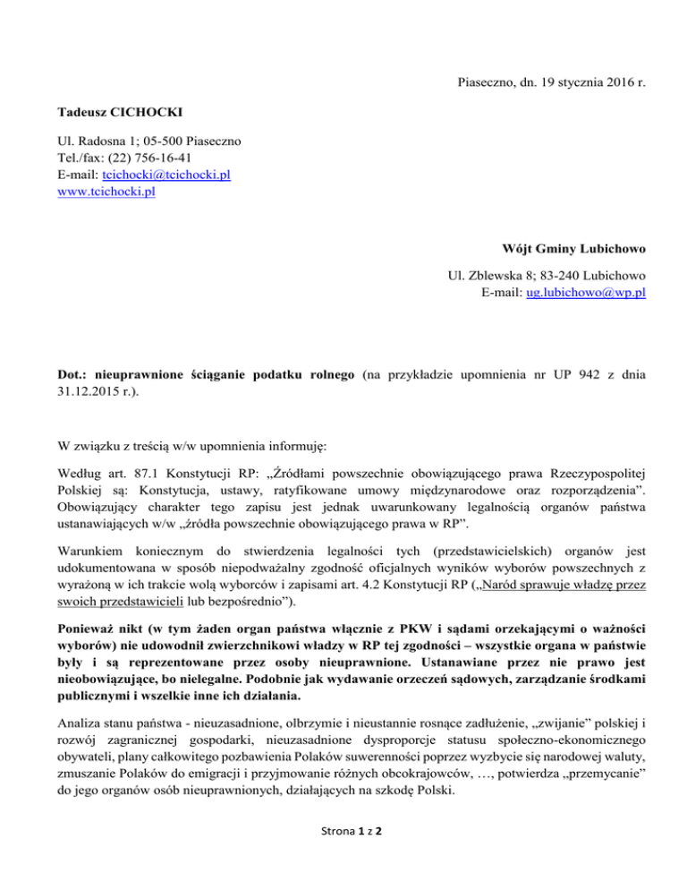 Piaseczno, dn. 19 stycznia 2016 r. Tadeusz CICHOCKI Ul. Radosna 1; 05-500 Piaseczno Tel./fax: (22) 756-16-41 E-mail: [email protected] www.tcichocki.pl Wójt Gminy Lubichowo Ul. Zblewska 8; 83-240 Lubichowo E-mail: [email protected] Dot.: nieuprawnione ściąganie podatku rolnego (na przykładzie upomnienia nr UP 942 z dnia 31.12.2015 r.). W związku z treścią w/w upomnienia informuję: Według art. 87.1 Konstytucji RP: „Źródłami powszechnie obowiązującego prawa Rzeczypospolitej Polskiej są: Konstytucja, ustawy, ratyfikowane umowy międzynarodowe oraz rozporządzenia”. Obowiązujący charakter tego zapisu jest jednak uwarunkowany legalnością organów państwa ustanawiających w/w „źródła powszechnie obowiązującego prawa w RP”. Warunkiem koniecznym do stwierdzenia legalności tych (przedstawicielskich) organów jest udokumentowana w sposób niepodważalny zgodność oficjalnych wyników wyborów powszechnych z wyrażoną w ich trakcie wolą wyborców i zapisami art. 4.2 Konstytucji RP („Naród sprawuje władzę przez swoich przedstawicieli lub bezpośrednio”). Ponieważ nikt (w tym żaden organ państwa włącznie z PKW i sądami orzekającymi o ważności wyborów) nie udowodnił zwierzchnikowi władzy w RP tej zgodności – wszystkie organa w państwie były i są reprezentowane przez osoby nieuprawnione. Ustanawiane przez nie prawo jest nieobowiązujące, bo nielegalne. Podobnie jak wydawanie orzeczeń sądowych, zarządzanie środkami publicznymi i wszelkie inne ich działania. Analiza stanu państwa - nieuzasadnione, olbrzymie i nieustannie rosnące zadłużenie, „zwijanie” polskiej i rozwój zagranicznej gospodarki, nieuzasadnione dysproporcje statusu społeczno-ekonomicznego obywateli, plany całkowitego pozbawienia Polaków suwerenności poprzez wyzbycie się narodowej waluty, zmuszanie Polaków do emigracji i przyjmowanie różnych obcokrajowców, …, potwierdza „przemycanie” do jego organów osób nieuprawnionych, działających na szkodę Polski. Strona 1 z 2 W tej sytuacji na podstawie prawa naturalnego i art. 4.1 Konstytucji RP („Władza zwierzchnia w Rzeczypospolitej Polskiej należy do Narodu”) oraz art. 4.2 Konstytucji RP („Naród sprawuje władzę przez swoich przedstawicieli lub bezpośrednio”) zwierzchnik władzy wydał w zgodzie z polską racją stanu/polskim interesem narodowym powszechnie obowiązujące i najwyższej rangi źródło prawa – Dekret z dn. 02.04.2015 r. „Wypowiedzenie posłuszeństwa wszystkim organom państwa” (http://www.tcichocki.pl/20150402_Wypowiedzenie_posluszenstwa_organom_panstwa.pdf). Fakt, że nigdy wcześniej suweren nie korzystał w ten sposób z przysługujących mu uprawnień zwierzchnika również ustawodawczej władzy nikogo nie zwalnia ani z obowiązku stosowania się do jego decyzji ani też z odpowiedzialności karnej za uporczywe i niczym nieuzasadnione uchylanie się od ich stosowania. W związku z powyższymi faktami działając w interesie społecznym Narodu Polskiego na podstawie prawa naturalnego, art. 4.1 i 4.2 Konstytucji RP oraz art. 3, 5 i 6 Dekretu zwierzchnika władzy w RP z dn. 02.04. 2015 r. WZYWAM WÓJTA GMINY LUBICHOWO DO: 1. Przedstawienia niepodważalnych dowodów potwierdzających zgodność oficjalnych wyników odpowiednich wyborów powszechnych z wyrażoną w ich trakcie wolą wyborców i zapisami art. 4.2 Konstytucji RP a co za tym idzie legalności: a. Organów władzy w Rzeczypospolitej Polskiej. W szczególności przedstawicielskich organów władzy ustawodawczej oraz samorządowej w Gminie Lubichowo. b. Prawa i jego obowiązującego charakteru. W szczególności wskazywanego przez Wójta, jako podstawę do ściągania różnego rodzaju podatków i opłat. 2. W przypadku braku dowodów, o których mowa w punkcie 1. (powyżej): a. Zwrotu wszystkich nielegalnie pobranych kwot podatków, opłat, kosztów upomnień, odsetek za zwłokę, … po dacie wejścia w życie Dekretu (art. 2.1) to jest po 31.05. 2015 r. b. Odstąpienia od nielegalnego pełnienia funkcji w organach władzy samorządowej. Tadeusz Cichocki Do wiadomości: - Kancelaria Prezydenta Rzeczypospolitej Polskiej - [email protected]; - Kancelaria Prezesa Rady Ministrów - [email protected]; - Ministerstwo Finansów - [email protected]; - Ministerstwo Rolnictwa i Rozwoju Wsi - [email protected]; - Rzecznik Praw Obywatelskich - [email protected] Strona 2 z 2