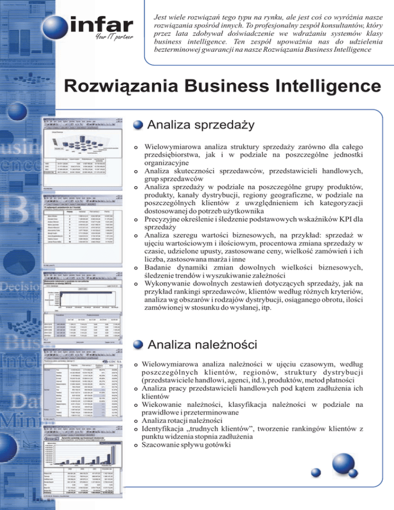 infar Your IT partner Jest wiele rozwi¹zañ tego typu na rynku, ale jest coœ co wyró¿nia nasze rozwi¹zania spoœród innych. To profesjonalny zespó³ konsultantów, który przez lata zdobywa³ doœwiadczenie we wdra¿aniu systemów klasy business intelligence. Ten zespó³ upowa¿nia nas do udzielenia bezterminowej gwarancji na nasze Rozwi¹zania Business Intelligence Rozwi¹zania Business Intelligence Analiza sprzeda¿y # Wielowymiarowa analiza struktury sprzeda¿y zarówno dla ca³ego przedsiêbiorstwa, jak i w podziale na poszczególne jednostki organizacyjne # Analiza skutecznoœci sprzedawców, przedstawicieli handlowych, grup sprzedawców # Analiza sprzeda¿y w podziale na poszczególne grupy produktów, produkty, kana³y dystrybucji, regiony geograficzne, w podziale na poszczególnych klientów z uwzglêdnieniem ich kategoryzacji dostosowanej do potrzeb u¿ytkownika # Precyzyjne okreœlenie i œledzenie podstawowych wskaŸników KPI dla sprzeda¿y # Analiza szeregu wartoœci biznesowych, na przyk³ad: sprzeda¿ w ujêciu wartoœciowym i iloœciowym, procentowa zmiana sprzeda¿y w czasie, udzielone upusty, zastosowane ceny, wielkoœæ zamówieñ i ich liczba, zastosowana mar¿a i inne # Badanie dynamiki zmian dowolnych wielkoœci biznesowych, œledzenie trendów i wyszukiwanie zale¿noœci # Wykonywanie dowolnych zestawieñ dotycz¹cych sprzeda¿y, jak na przyk³ad rankingi sprzedawców, klientów wed³ug ró¿nych kryteriów, analiza wg obszarów i rodzajów dystrybucji, osi¹ganego obrotu, iloœci zamówionej w stosunku do wys³anej, itp. Analiza nale¿noœci # Wielowymiarowa analiza nale¿noœci w ujêciu czasowym, wed³ug poszczególnych klientów, regionów, struktury dystrybucji (przedstawiciele handlowi, agenci, itd.), produktów, metod p³atnoœci # Analiza pracy przedstawicieli handlowych pod k¹tem zad³u¿enia ich klientów # Wiekowanie nale¿noœci, klasyfikacja nale¿noœci w podziale na prawid³owe i przeterminowane # Analiza rotacji nale¿noœci # Identyfikacja „trudnych klientów”, tworzenie rankingów klientów z punktu widzenia stopnia zad³u¿enia # Szacowanie sp³ywu gotówki Analiza rentownoœci sprzeda¿y # Wielowymiarowa analiza sprzeda¿y pod k¹tem jej rentownoœci na poziomie ca³ego przedsiêbiorstwa, poszczególnych jednostek organizacyjnych, produktów i ich grup, poszczególnych klientów # Analiza rentownoœci sprzeda¿y na poziomie poszczególnych klientów, grup produktów, produktów, w uk³adzie klient/produkt, segmentów rynku, typów klientów, itd. # Monitorowanie poziomu osi¹ganego zysku, ponoszonych kosztów (wytworzenia, reklamy, obs³ugi serwisowej), porównanie wielkoœci sprzeda¿y z ponoszonymi nak³adami, # Analiza dynamiki zmian # Monitorowanie wielu wielkoœci biznesowych, np.: wielkoœæ sprzeda¿y (wartoœciowo, iloœciowo), udzielone upusty i rabaty (procentowo i wartoœciowo), osi¹gany zysk, mar¿a, prowizja, koszty wytworzenia i sprzeda¿y, koszy marketingowe, koszty produktu procentowo w stosunku do ceny, zysk procentowo w odniesieniu do wielkoœci sprzeda¿y i inne. Analiza realizacji planu sprzeda¿y # Wielowymiarowa analiza prognozy oraz planów sprzeda¿y w porównaniu do wykonania # Analiza realizacji za³o¿onego planu sprzeda¿y w czasie # Dowolna iloœæ planów sprzeda¿y, wersjonowanie planów # Monitorowanie odchyleñ od za³o¿onego planu sprzeda¿y, wyszukiwanie przyczyn powstania odchyleñ, identyfikacja opóŸnieñ # Analiza wielu wartoœci biznesowych, np.: sprzeda¿ planowana (wartoœciowo, iloœciowo), sprzeda¿ wykonana (wartoœciowo, iloœciowo), sprzeda¿ wykonana procentowo do planu sprzeda¿y, odchylenia procentowo i inne Analiza marketingowa # Wielowymiarowa analiza marketingowa pod k¹tem skutecznoœci prowadzonych akcji marketingowych # Porównanie kosztów realizowanych kampanii reklamowych w stosunku do osi¹ganych zysków ze sprzeda¿y, porównanie okresów przed kampani¹, w trakcie kampanii i po kampanii marketingowej # Analiza liczby sk³adanych ofert pod k¹tem otrzymanej liczby zamówieñ w ujêciu czasu, regionu, struktury organizacyjnej przedsiêbiorstwa # Identyfikacja najbardziej efektywnych narzêdzi marketingowych w zale¿noœci od segmentu rynku, okreœlenie najbardziej zyskownych segmentów rynku w zale¿noœci od produktów b¹dŸ grup produktów # Analiza wielu wielkoœci biznesowych, np.: wielkoœæ sprzeda¿y (wartoœciowo, iloœciowo), liczba klientów, zysk brutto ze sprzeda¿y, liczba zamówieñ, liczba ofert, nak³ady na reklamê, i inne infar Your IT partner Infar Sp. z o. o. 65-775 Zielona Góra, ul. Zacisze 28 tel: +48 68 453 51 91, fax: +48 68 328 19 12 [email protected] www.infar.com.pl