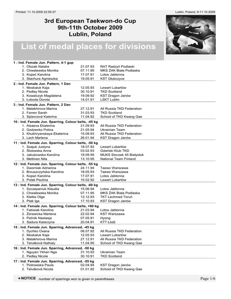 Printed: 11.10.2009 22:55:27 Lublin, Poland, 9-11.10.2009 3rd European Taekwon-do Cup 9th-11th October 2009 Lublin, Poland List of medal places for divisions 1 : Ind. Female Jun. Pattern, 4-1 gup 1. Olszak Natalia 2. Chwalewska Monika 3. Kopeć Karolina 3. Stachura Agnieszka 21.07.93 07.11.95 17.07.91 19.05.91 RAT Radzyń Podlaski MKS śAK Biała Podlaska Lotos Jabłonna KST Głubczyce 2 : Ind. Female Jun. Pattern, 1 Dan 1. Moskaluk Kaja 2. Pedley Nicole 3. Kowalczyk Magdalena 3. Łoboda Dorota 12.05.93 30.10.91 19.09.92 14.01.91 Lewart Lubartów TKD Scotland KST Dragon Janów LSKT Lublin 3 : Ind. Female Jun. Pattern, 2 Dan 1. Malakhirova Marina 2. Farren Sarah 3. Splavcová Katerina 27.12.91 31.03.93 11.04.92 All Russia TKD Federation TKD Scotland School of TKD Kwang Gae 10 : Ind. Female Jun. Sparring, Colour belts, -45 kg 1. Alsaeva Ekaterina 21.09.93 2. Godzenko Polina 21.05.94 3. Khukhryanskaya Ekaterina 15.09.93 3. Lech Marlena 26.01.94 All Russia TKD Federation Ukrainian Team All Russia TKD Federation KST Dragon Janów 11 : Ind. Female Jun. Sparring, Colour belts, -50 kg 1. Szajuk Justyna 18.07.93 2. Ślizewska Anna 03.02.93 3. Jakubowska Karolina 19.09.95 3. Mettinen Nita 13.10.95 Lewart Lubartów Gdański Klub TKD MUKS Stoczek 45 Białystok National Team Finland 12 : Ind. Female Jun. Sparring, Colour belts, -55 kg 1. Dworniak Adrianna 24.11.94 2. Brzuszczyńska Karolina 18.05.93 3. Kopeć Karolina 17.07.91 3. Polak Paulina 10.02.92 Taewo Warszawa Taewo Warszawa Lotos Jabłonna Lewart Lubartów 13 : Ind. Female Jun. Sparring, Colour belts, -60 kg 1. Szczepaniuk Klaudia 15.06.94 2. Chwalewska Monika 07.11.95 3. Kletke Olga 13.12.93 3. Ptak Iga 17.10.93 Lotos Jabłonna MKS śAK Biała Podlaska TKT Lechmed Toruń KST Dragon Janów 14 : Ind. Female Jun. Sparring, Colour belts, +60 kg 1. Fabisiak Karolina 21.03.94 2. śórawicka Marlena 22.02.94 3. Pečnik Nastasja 07.05.91 3. Sadura Katarzyna 20.04.91 Lotos Jabłonna KST Warszawa Hyong KTT Łódź 15 : Ind. Female Jun. Sparring, Advanced, -45 kg 1. Dychko Oxana 06.07.92 2. Moskaluk Kaja 12.05.93 3. Malakhirova Marina 27.12.91 3. Telváková Nathaly 11.04.95 All Russia TKD Federation Lewart Lubartów All Russia TKD Federation School of TKD Kwang Gae 16 : Ind. Female Jun. Sparring, Advanced, -50 kg 1. Nguyen Ykhan Nga 31.10.93 2. Pedley Nicole 30.10.91 Ukrainian Team TKD Scotland 17 : Ind. Female Jun. Sparring, Advanced, -55 kg 1. Piotrowska Paula 02.04.94 2. Telváková Nicola 01.01.92 KST Dragon Janów School of TKD Kwang Gae * NOTICE number of sparrings won is given in parentheses Page 1/6 17 : Ind. Female Jun. Sparring, Advanced, -55 kg 3. Dąbrowska Anna. 02.06.92 3. Taylor Roxanne 28.06.94 SKS Start Olsztyn GMAC TKD 18 : Ind. Female Jun. Sparring, Advanced, -60 kg 1. Farren Sarah 31.03.93 2. Łoboda Dorota 14.01.91 3. Mitraka Anna 29.03.93 3. Morozova Ksenia 18.06.93 TKD Scotland LSKT Lublin Athletic Association TKD MA All Russia TKD Federation 19 : Ind. Female Jun. Sparring, Advanced, +60 kg 1. Lódi Vivien 16.01.92 2. Kowalczyk Magdalena 19.09.92 3. Morning Rachael 10.09.93 3. Splavcová Katerina 11.04.92 Hungarian TKD Team KST Dragon Janów TKD Scotland School of TKD Kwang Gae 50 : Ind. Male Jun. Pattern, 4-1 gup 1. Leszczyński Iwo 2. Piątek Mariusz 3. Marzęda Mateusz 3. Walaszczyk Krystian 08.03.91 13.07.92 01.01.93 30.10.92 KS TAEKWON Kolbudy Lewart Lubartów Lewart Lubartów Łódzki Sportowy Klub TKD 51 : Ind. Male Jun. Pattern, 1 Dan 1. Dąbrowski Paweł 2. Rizmayer Norbert 3. Schmidt Márton 3. Sochocki Daniel 20.06.91 18.10.93 07.11.94 29.04.92 LKT Legnica Hungarian TKD Team Hungarian TKD Team Lotos Jabłonna 52 : Ind. Male Jun. Pattern, 2 Dan 1. Kotyra Hubert 2. Khushitsa Igor 3. Forde Richard 3. Nikulin Mikhail 19.07.91 30.11.93 25.09.92 26.05.92 MKS śAK Biała Podlaska All Russia TKD Federation North Mon Taekwon-Do All Russia TKD Federation 59 : Ind. Male Jun. Sparring, Colour belts, -52 kg 1. Guz Bartosz 21.06.93 2. Cur Tomasz 04.07.91 3. Kakareko Mateusz 09.04.93 3. Kostromins Dmitrijs 14.01.95 Lewart Lubartów Lewart Lubartów MUKS Stoczek 45 Białystok Sport Club TKD 60 : Ind. Male Jun. Sparring, Colour belts, -58 kg 1. Sajda Piotr 14.07.92 2. Chernyavskiy Mykyta 18.10.94 3. Koco Benjámin 02.09.94 3. Korobko Anatolii 18.06.95 Lewart Lubartów Ukrainian Team Hungarian TKD Team Ukrainian Team 61 : Ind. Male Jun. Sparring, Colour belts, -63 kg 1. Stefanik Łukasz 02.08.93 2. Bęben Mateusz 03.03.93 3. Jakubowski Konrad 02.08.94 3. Matysiak Michał 27.07.93 KST Dragon Janów LKS Viktoria Działoszyn Lotos Jabłonna Taewo Warszawa 62 : Ind. Male Jun. Sparring, Colour belts, -70 kg 1. Cybul Bartłomiej 24.08.93 2. Lalovs Arturs 30.08.91 3. Nieczajew Aleksander 24.02.93 3. Piątek Mariusz 13.07.92 GSC Lublin Sport Club TKD MUKS Stoczek 45 Białystok Lewart Lubartów 63 : Ind. Male Jun. Sparring, Colour belts, +70 kg 1. Senkovs Aleksandrs 22.02.93 2. Zarickis Maksims 21.03.92 3. Bokros Tamás 18.02.91 3. Lubiński Patryk 15.08.92 Viktorija-T Viktorija-T Hungarian TKD Team SKT An-Do Pruszcz Gd. 64 : Ind. Male Jun. Sparring, Advanced, -52 kg 1. Vihrov Dmytro 28.11.95 2. Khushitsa Igor 30.11.93 3. Miloudi Johnathan 29.01.94 3. Tytarenko Oleksiy 09.07.92 Ukrainian Team All Russia TKD Federation North Mon Taekwon-Do Ukrainian Team 65 : Ind. Male Jun. Sparring, Advanced, -58 kg 1. Sultanau Emil 22.08.93 2. Rizmayer Norbert 18.10.93 3. Finko Denys 28.04.93 Belarusian Public Association Hungarian TKD Team Ukrainian Team * NOTICE number of sparrings won is given in parentheses Page 2/6 65 : Ind. Male Jun. Sparring, Advanced, -58 kg 3. Schmidt Márton 07.11.94 Hungarian TKD Team 66 : Ind. Male Jun. Sparring, Advanced, -63 kg 1. Tserashonak Maksim 05.01.92 2. Szulc Adam 29.04.93 3. Ampatzidis Stylianos 21.05.93 3. Gudziak Mariusz 09.11.92 Belarusian Public Association WSKT Wrocław Athletic Association TKD MA Gdański Klub TKD 67 : Ind. Male Jun. Sparring, Advanced, -70 kg 1. Gryshchuk Mykola 09.11.91 2. Aleksejevs Jevgenijs 06