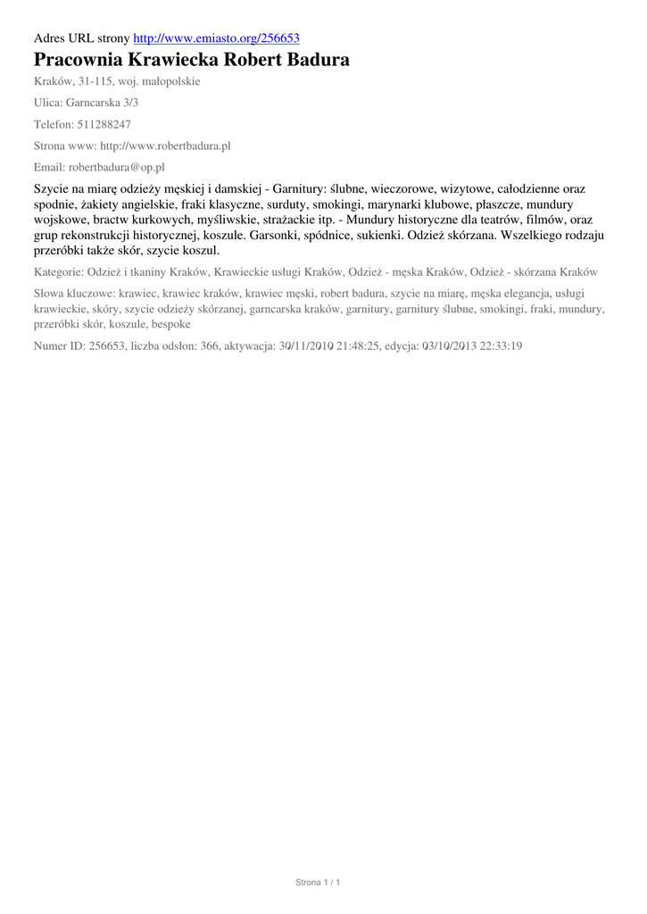 Adres URL strony http://www.emiasto.org/256653 Pracownia Krawiecka Robert Badura Kraków, 31-115, woj. małopolskie Ulica: Garncarska 3/3 Telefon: 511288247 Strona www: http://www.robertbadura.pl Email: [email protected] Szycie na miarę odzieży męskiej i damskiej - Garnitury: ślubne, wieczorowe, wizytowe, całodzienne oraz spodnie, żakiety angielskie, fraki klasyczne, surduty, smokingi, marynarki klubowe, płaszcze, mundury wojskowe, bractw kurkowych, myśliwskie, strażackie itp. - Mundury historyczne dla teatrów, filmów, oraz grup rekonstrukcji historycznej, koszule. Garsonki, spódnice, sukienki. Odzież skórzana. Wszelkiego rodzaju przeróbki także skór, szycie koszul. Kategorie: Odzież i tkaniny Kraków, Krawieckie usługi Kraków, Odzież - męska Kraków, Odzież - skórzana Kraków Słowa kluczowe: krawiec, krawiec kraków, krawiec męski, robert badura, szycie na miarę, męska elegancja, usługi krawieckie, skóry, szycie odzieży skórzanej, garncarska kraków, garnitury, garnitury ślubne, smokingi, fraki, mundury, przeróbki skór, koszule, bespoke Numer ID: 256653, liczba odsłon: 366, aktywacja: 30/11/2010 21:48:25, edycja: 03/10/2013 22:33:19 Strona 1 / 1