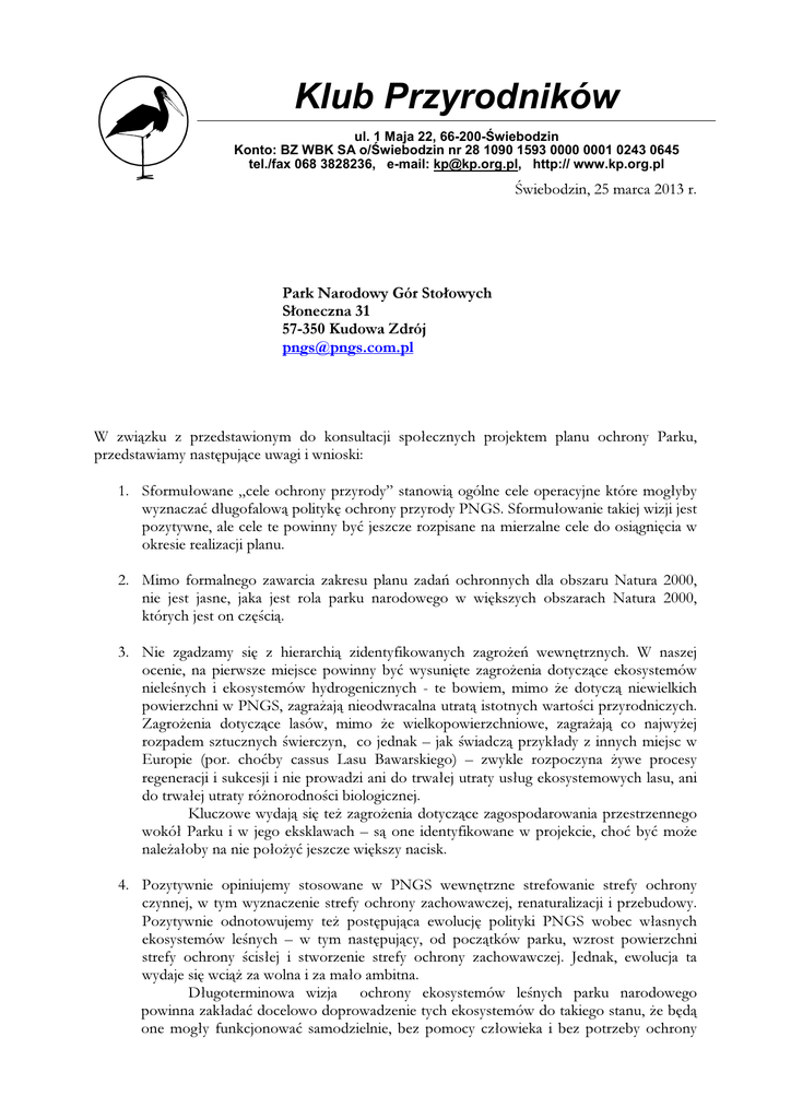 Klub Przyrodników ul. 1 Maja 22, 66-200-Świebodzin Konto: BZ WBK SA o/Świebodzin nr 28 1090 1593 0000 0001 0243 0645 tel./fax 068 3828236, e-mail: [email protected], http:// www.kp.org.pl Świebodzin, 25 marca 2013 r. Park Narodowy Gór Stołowych Słoneczna 31 57-350 Kudowa Zdrój [email protected] W związku z przedstawionym do konsultacji społecznych projektem planu ochrony Parku, przedstawiamy następujące uwagi i wnioski: 1. Sformułowane „cele ochrony przyrody” stanowią ogólne cele operacyjne które mogłyby wyznaczać długofalową politykę ochrony przyrody PNGS. Sformułowanie takiej wizji jest pozytywne, ale cele te powinny być jeszcze rozpisane na mierzalne cele do osiągnięcia w okresie realizacji planu. 2. Mimo formalnego zawarcia zakresu planu zadań ochronnych dla obszaru Natura 2000, nie jest jasne, jaka jest rola parku narodowego w większych obszarach Natura 2000, których jest on częścią. 3. Nie zgadzamy się z hierarchią zidentyfikowanych zagrożeń wewnętrznych. W naszej ocenie, na pierwsze miejsce powinny być wysunięte zagrożenia dotyczące ekosystemów nieleśnych i ekosystemów hydrogenicznych - te bowiem, mimo że dotyczą niewielkich powierzchni w PNGS, zagrażają nieodwracalna utratą istotnych wartości przyrodniczych. Zagrożenia dotyczące lasów, mimo że wielkopowierzchniowe, zagrażają co najwyżej rozpadem sztucznych świerczyn, co jednak – jak świadczą przykłady z innych miejsc w Europie (por. choćby cassus Lasu Bawarskiego) – zwykle rozpoczyna żywe procesy regeneracji i sukcesji i nie prowadzi ani do trwałej utraty usług ekosystemowych lasu, ani do trwałej utraty różnorodności biologicznej. Kluczowe wydają się też zagrożenia dotyczące zagospodarowania przestrzennego wokół Parku i w jego eksklawach – są one identyfikowane w projekcie, choć być może należałoby na nie położyć jeszcze większy nacisk. 4. Pozytywnie opiniujemy stosowane w PNGS wewnętrzne strefowanie strefy ochrony czynnej, w tym wyznaczenie strefy ochrony zachowawczej, renaturalizacji i przebudowy. Pozytywnie odnotowujemy też postępująca ewolucję polityki PNGS wobec własnych ekosystemów leśnych – w tym następujący, od początków parku, wzrost powierzchni strefy ochrony ścisłej i stworzenie strefy ochrony zachowawczej. Jednak, ewolucja ta wydaje się wciąż za wolna i za mało ambitna. Długoterminowa wizja ochrony ekosystemów leśnych parku narodowego powinna zakładać docelowo doprowadzenie tych ekosystemów do takiego stanu, że będą one mogły funkcjonować samodzielnie, bez pomocy człowieka i bez potrzeby ochrony czynnej. Choć wymaga to czasu, celem długofalowym powinien być park narodowy rozumiany jako obszar kształtowany przez naturalne procesy, z wyjątkiem tylko stref kulturowych i pólnaturalnych. Sugerujemy, by taka wizja została wyraźnie sformułowana i wyrażona, zarówno w operacie ekosystemów leśnych, jak i wśród celów ochrony parku w rozporządzeniu. Sugerujemy więc, by odpowiedni generalny cel ochrony PNGS przeformułować jako: „utrzymanie oraz zapewnienie niezakłóconego przebiegu procesów ekologicznych, utrzymanie trwałości ekosystemów i docelowa minimalizacja ingerencji w funkcjonowanie ekosystemów 9z wyjątkiem ekosystemów pólnaturalnych)”. Sugerujemy także, by cele dla ekosystemów leśnych przeformułować: 1. Zapewnie warunków naturalnego rozwoju ekosystemów leśnych w maksymalnym możliwym stopniu niesprzecznym z pozostałymi celami, 2. Doprowadzeniem ekosystemów leśnych do stanu umożliwiającego pozostawienie ich dalszego funkcjonowania naturalnym procesom przyrodniczym, 3. Pilne odtworzenie kluczowych dla różnorodności biologicznej i dla stanu ekosystemu, elementów struktury ekosystemów leśnych, w tym zróżnicowanej struktury pionowej i poziomej oraz zasobów rozkładającego się drewna, jak to ma miejsce w naturalnych niezaburzonych ekosystemach leśnych,. 4. Przeciwdziałanie wszelkim przekształceniom i zaburzeniom pochodzenia antropogenicznego, 5. Zachowanie bioróżnorodności i trwałości zbiorowisk i zespołów leśnych; 6. Doprowadzenie ekosystemów leśnych, w tym stanowiących chronione siedliska Natura 2000 oraz ich składników (gatunków roślin, grzybów i zwierząt) do właściwego stanu ochrony i zapobieganie wszelkim pogorszeniom ich stanu; 5. W ramach postulowanej wyżej ścieżki dochodzenia do docelowo biernej ochrony ekosystemów leśnych PNGS, celowe wydają się obecnie kroki nieco dalej idące, niż zaproponowane w planie. Sugerujemy generalne ponowne rozważenie poszczególnych drzewostanów, pod kątem możliwości objęcia ich ochroną ścisłą lub zachowawczą, w celu zwiększenia udziału tych form ochrony. Obecnie proponuje się objecie nimi zaledwie 25% powierzchni leśnej Parku. W szczególności: a) Sugerujemy ochronę zachowawczą wszystkich drzewostanów bukowych > 20 lat. 20 lat istnienia parku narodowego i dotychczasowego wykonywania ochrony w parku narodowym w każdym przypadku powinno wystarczyć do ukształtowania struktury takich drzewostanów w sposób umożliwiający ich dalszy spotkaniczny rozwój. b) Sugerujemy rozważenie, czy strefa ochrony zachowawczej nie mogłaby zostać jeszcze zwiększona, tak by generalnie ‘bierne’ podejście do ochrony ekosystemów leśnych (strefa ścisła + zachowawcza) dominowało powierzchniowo w Parku, a minimalnie dotyczyło co najmniej ok. 35-40% jego powierzchni leśnej. Zwracamy tu uwagę, że w wielu przypadkach unaturalnienie ekosystemu leśnego można z dobrym skutkiem osiągnąć przez dopuszczenie do rozpadu monokultury świerkowej i procesy naturalnej sukcesji. Wymaga to oczywiście dłuższego czasu – trwa wiele lat; jednak gdyby w chwili powstania Parku w 1993 r. takie podejście szerzej zaakceptowano, to dziś szata roślinna PNGS byłaby znacznie bardziej naturalna, niż jest. c) Sugerujemy, by plan na 20 lat dla PNGS z góry zakładał zmianę przyjęteg