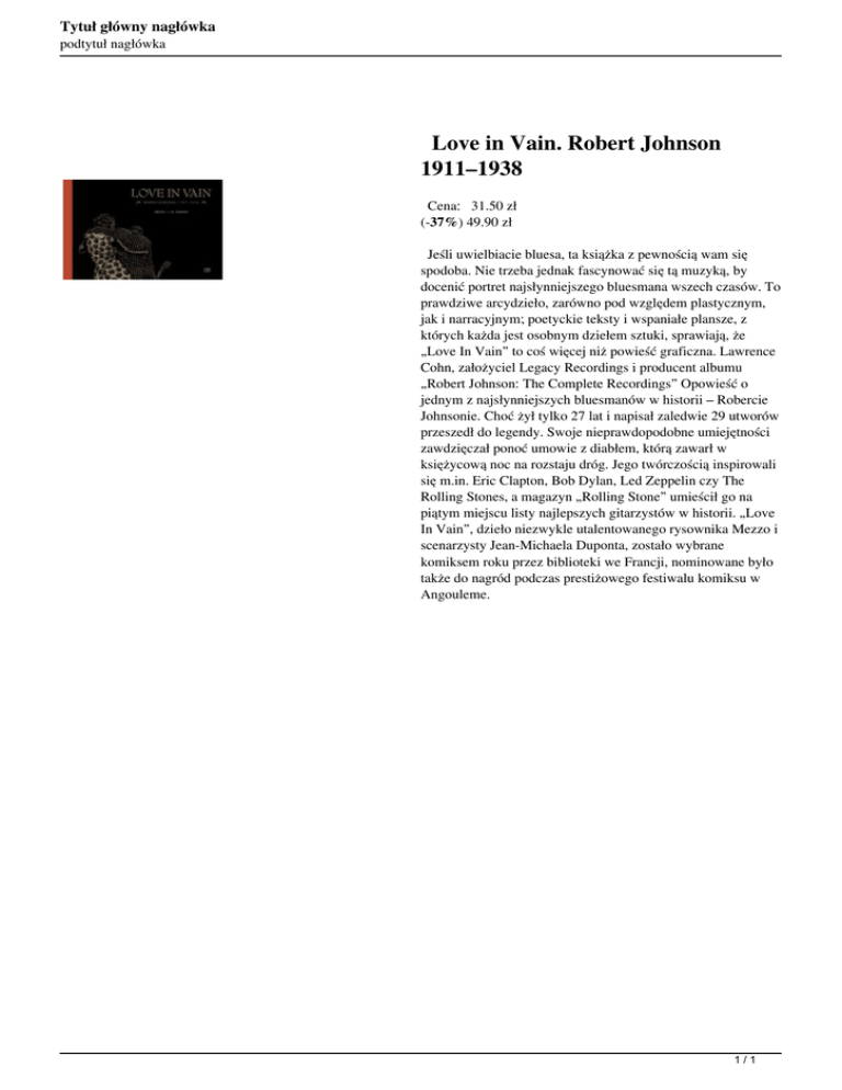 Tytuł główny nagłówka podtytuł nagłówka Love in Vain. Robert Johnson 1911–1938 Cena: 31.50 zł (-37%) 49.90 zł Jeśli uwielbiacie bluesa, ta książka z pewnością wam się spodoba. Nie trzeba jednak fascynować się tą muzyką, by docenić portret najsłynniejszego bluesmana wszech czasów. To prawdziwe arcydzieło, zarówno pod względem plastycznym, jak i narracyjnym; poetyckie teksty i wspaniałe plansze, z których każda jest osobnym dziełem sztuki, sprawiają, że „Love In Vain” to coś więcej niż powieść graficzna. Lawrence Cohn, założyciel Legacy Recordings i producent albumu „Robert Johnson: The Complete Recordings” Opowieść o jednym z najsłynniejszych bluesmanów w historii – Robercie Johnsonie. Choć żył tylko 27 lat i napisał zaledwie 29 utworów przeszedł do legendy. Swoje nieprawdopodobne umiejętności zawdzięczał ponoć umowie z diabłem, którą zawarł w księżycową noc na rozstaju dróg. Jego twórczością inspirowali się m.in. Eric Clapton, Bob Dylan, Led Zeppelin czy The Rolling Stones, a magazyn „Rolling Stone” umieścił go na piątym miejscu listy najlepszych gitarzystów w historii. „Love In Vain”, dzieło niezwykle utalentowanego rysownika Mezzo i scenarzysty Jean-Michaela Duponta, zostało wybrane komiksem roku przez biblioteki we Francji, nominowane było także do nagród podczas prestiżowego festiwalu komiksu w Angouleme. 1/1 Powered by TCPDF (www.tcpdf.org)