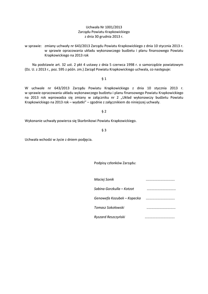 Uchwała Nr 1001/2013 Zarządu Powiatu Krapkowickiego z dnia 30 grudnia 2013 r. w sprawie: zmiany uchwały nr 643/2013 Zarządu Powiatu Krapkowickiego z dnia 10 stycznia 2013 r. w sprawie opracowania układu wykonawczego budżetu i planu finansowego Powiatu Krapkowickiego na 2013 rok Na podstawie art. 32 ust. 2 pkt 4 ustawy z dnia 5 czerwca 1998 r. o samorządzie powiatowym (Dz. U. z 2013 r., poz. 595 z późn. zm.) Zarząd Powiatu Krapkowickiego uchwala, co następuje: §1 W uchwale nr 643/2013 Zarządu Powiatu Krapkowickiego z dnia 10 stycznia 2013 r. w sprawie opracowania układu wykonawczego budżetu i planu finansowego Powiatu Krapkowickiego na 2013 rok wprowadza się zmiany w załączniku nr 2 „Układ wykonawczy budżetu Powiatu Krapkowickiego na 2013 rok – wydatki” – zgodnie z załącznikiem do niniejszej uchwały. §2 Wykonanie uchwały powierza się Skarbnikowi Powiatu Krapkowickiego. §3 Uchwała wchodzi w życie z dniem podjęcia. Podpisy członków Zarządu: Maciej Sonik .............................. Sabina Gorzkulla – Kotzot .............................. Genowefa Kozubek – Kopecka .............................. Tomasz Sokołowski .............................. Ryszard Reszczyński ............................... Załącznik do Uchwały Nr 1001/2013 Zarządu Powiatu Krapkowickiego z dnia 30 grudnia 2013 r. ZMIANA UKŁADU WYKONAWCZEGO WYDATKÓW POWIATU KRAPKOWICKIEGO NA 2013 ROK DZIAŁ ROZDZIAŁ PARAGRAF TREŚĆ 1. Starostwo Powiatowe w Krapkowicach ZADANIA WŁASNE 600 Transport i łączność 60014 Drogi publiczne powiatowe 4210 Zakup materiałów i wyposażenia 4300 Zakup usług pozostałych 2. Dom Pomocy Społecznej "ANNA" w Krapkowicach ZADANIA WŁASNE 852 Pomoc społeczna 85202 Domy pomocy społecznej 4040 Dodatkowe wynagrodzenie roczne 4110 Składki na ubezpieczenia społeczne 4120 Składki na Fundusz Pracy 4210 Zakup materiałów i wyposażenia 4. Powiatowy Urząd Pracy w Krapkowicach ZADANIA WŁASNE Pozostałe zadania w zakresie polityki 853 społecznej 85333 Powiatowe urzędy pracy Zakup materiałów i wyposażenia 4210 4270 Zakup usług remontowych 4300 Zakup usług pozostałych 4410 Podróże służbowe krajowe OGÓŁEM Zmniejszenie Zwiększenie wydatków wydatków w zł w zł 1.500 1.500 1.500 1.500 1.500 1.500 1.500 1.500 1.500 0 0 1.500 1.012 1.012 1.012 1.012 1.012 1.012 1.012 1.012 215 0 387 0 410 0 0 1.012 946 946 946 946 946 946 946 0 246 560 140 946 946 0 0 0 3.458 3.458