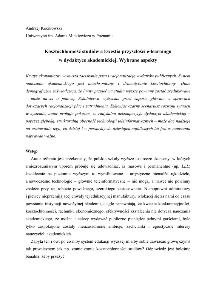 Andrzej Kocikowski Uniwersytet im. Adama Mickiewicza w Poznaniu Kosztochłonność studiów a kwestia przyszłości e-learningu w dydaktyce akademickiej. Wybrane aspekty Kryzys ekonomiczny wymusza zaciskanie pasa i racjonalizację wydatków publicznych. System nauczania akademickiego jest anachroniczny i dramatycznie kosztochłonny. Dane demograficzne zaświadczają, że limity przyjęć na studia wyższe powinny zostać zredukowane – może nawet o połowę. Szkolnictwu wyższemu grozi zapaść, głównie w sprawach dotyczących racjonalizacji płac i zatrudnienia. Szkicując czarny scenariusz rozwoju sytuacji w systemie, autor próbuje pokazać, że radykalna dekompozycja dydaktyki akademickiej – poprzez głęboką, strukturalną obecność technologii teleinformatycznych – może dać nadzieję na uratowanie tego, co dzisiaj i w perspektywie dziesiątek najbliższych lat jest w nauczaniu naprawdę ważne. Wstęp Autor referatu jest przekonany, że polskie szkoły wyższe to urocze skanseny, w których z niezrozumiałym uporem próbuje się udowadniać, iż masowe i permanentne (np. LLL) kształcenie na poziomie wyższym to wyrafinowane – artystyczne niemalże rękodzieło, a nowoczesne technologie – głównie teleinformatyczne – nie mogą, a nawet nie powinny znaleźć przy tej robocie poważnego, szerokiego zastosowania. Niepoprawni admiratorzy i piewcy nieprzemijającej chwały tej edukacyjnej manufaktury, wlokącej się za nami od czasu powstania instytucji nowożytnej akademii, ciągle zapewniają, że kwestie konkurencyjności, kosztochłonności, rachunku ekonomicznego, efektywności kształcenia nie dotyczą nauczania akademickiego, że można i należy wydawać publiczne pieniądze pełnymi garściami, byle tylko zaspokojone zostały nieuzasadnione ambicje, zachcianki i egoistyczne interesy nauczycieli akademickich. Zapyta ten i ów: po co niby system edukacji wyższej miałby sobie zawracać głowę czymś tak prozaicznym jak np. zmniejszanie kosztochłonności studiów? Odpowiedź jest boleśnie banalna: żeby przeżyć! Teza I: żeby przeżyć, należy koniecznie zmniejszyć kosztochłonność systemu Kryzys ekonomiczny, którego dotkliwe i dramatyczne skutki społeczne mamy dopiero przed sobą, bardzo wyraźnie ujawnia konieczność radykalnej i trwałej poprawy konkurencyjności we wszystkich sektorach gospodarki. Ponieważ instytucje naukowodydaktyczne są immanentną częścią każdego systemu gospodarczego (szerzej: społecznego), przedmiotowy problem dotyczy ich w taki sam sposób jak przemysłu czy rolnictwa. Rynek usług edukacyjnych topnieje w bardzo szybkim tempie. W ciekawym opracowaniu z marca 2010 roku prof. Wodecki przytacza dane demograficzne bezlitośnie przemawiające za tezą, iż obecne limity przyjęć w systemie polskiego szkolnictwa wyższego będą w coraz wyższym stopniu trwale niewykorzystane – wskaźnik niewykorzystania zbliży się za jakiś czas do 50%. Nie sposób nie zapytać, kogo i czego zamierzają uczyć setki manufaktur pod szyldem „polskie szkoły wyższe”? Czy nauczyciele akademiccy ze zrozumieniem zaakceptują np. 50-procentową redukcję zatrudnienia w systemie? W roku 2007 nieznacznie wzrosła liczba urodzeń – urodziło się 388 tys. dzieci [...]. Jeśli wszystkie te dzieci w r. 2026 rozpoczną studia (to już za 16 lat), a przed nimi roczniki, które przecież były mniej liczne, to wszyscy – pięć kompletnych populacji (roczniki od 2002 do 2007) mogłyby zostać zapisane w jakimś przyszłym opracowaniu GUS jako ok 1 mln 900 tys. studentów na wszystkich typach studiów. Rachunkowo jest to możliwe, ale nie sposób nie zapytać, czy jest to możliwe realnie? Czy prawdopodobieństwo uzyskania matury przez pięć kolejnych kompletnych populacji wynosi 100%? Czy prawdopodobieństwo przebrnięcia kolejnych kompletnych populacji przez wszystkie lata studiów wynosi 100%? Powyższe pytania, co oczywiste, są pytaniami retorycznymi. Kandydatów na studia nie wystarczy nawet dla najpoważniejszych jednostek, a wyścig po „pojedyncze sztuki” już ruszył. Kto przeżyje? Kto upadnie? Powtórzmy odpowiedź proponowaną już wcześniej: przeżyją ci, którzy wypracują najlepszą ofertę edukacyjną, trwale i radykalnie zmniejszając koszt tego szczególnego produktu. Przypomnijmy sobie kilka banałów: poprawie konkurencyjności na rynku usług edukacyjnych sprzyjają ilościowy i jakościowy walor oferty edukacyjnej, a przede wszystkim jej koszt. Jeśli dana jednostka (instytucja naukowo-dydaktyczna) zaproponuje więcej interesujących programów studiów, prowadzonych na wysokim poziomie i uwzględniających realia rynku pracy, a na ich realizację zużyje znacznie mniej pieniędzy niż inni – jej oferta edukacyjna będzie bardziej konkurencyjna. Można też przy tej okazji przypomnieć, że na całkowity koszt wykształcenia absolwenta, poza kosztem ponoszonym przez instytucję edukacyjną, składa się również koszt ponoszony przez studenta (np. papierowe podręczniki, dojazdy, zakwaterowanie). Zatem każda oferta edukacyjna, która z uwagi na swój unikatowy kształt prowadzi do wyraźnego zmniejszania kosztów zdobywania wykształcenia (ponoszonych przez studenta), wzmacnia pozycję danej szkoły na rynku usług edukacyjnych, Konkurencyjność oferty edukacyjnej determinowana jest przez jeszcze jeden czynnik. Wielu młodych ludzi – niektórzy już w szkole średniej, inni tuż po podjęciu studiów – rozpoczęło pracę zarobkową, bardzo często poza granicami kraju. Zatem każda oferta edukacyjna, która z uwagi na swój unikatowy kształt pozwala zdobywać wysokiej jakości wykształcenie w czasie i miejscu odpowiadającym wymaganiom (możliwościom) współczesnego studenta, wzmacnia konkurencyjność danej szkoły na rynku usług edukacyjnych. Pojawia się pytanie, w jaki sposób i przy pomocy czego można osiągać dyskutowany rezultat. Zanim odpowiemy, pofolgujmy przez chwilę wyobraźni: wyobr