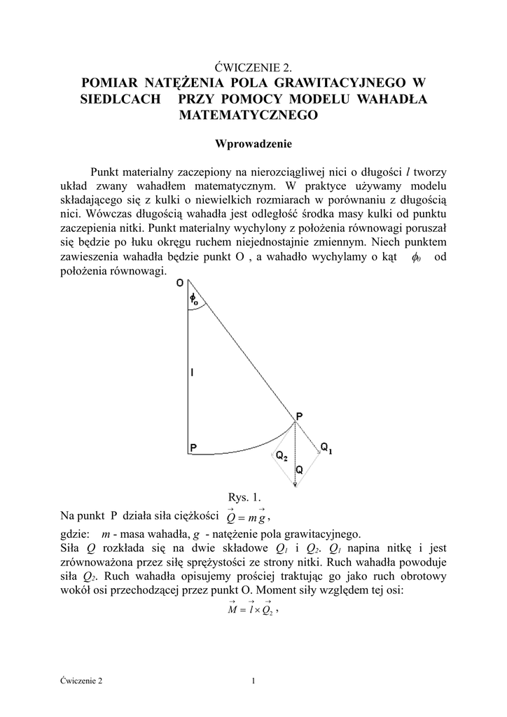 ĆWICZENIE 2. POMIAR NATĘŻENIA POLA GRAWITACYJNEGO W SIEDLCACH PRZY POMOCY MODELU WAHADŁA MATEMATYCZNEGO Wprowadzenie Punkt materialny zaczepiony na nierozciągliwej nici o długości l tworzy układ zwany wahadłem matematycznym. W praktyce używamy modelu składającego się z kulki o niewielkich rozmiarach w porównaniu z długością nici. Wówczas długością wahadła jest odległość środka masy kulki od punktu zaczepienia nitki. Punkt materialny wychylony z położenia równowagi poruszał się będzie po łuku okręgu ruchem niejednostajnie zmiennym. Niech punktem zawieszenia wahadła będzie punkt O , a wahadło wychylamy o kąt φ0 od położenia równowagi. Rys. 1. → → Na punkt P działa siła ciężkości Q = m g , gdzie: m - masa wahadła, g - natężenie pola grawitacyjnego. Siła Q rozkłada się na dwie składowe Q1 i Q2. Q1 napina nitkę i jest zrównoważona przez siłę sprężystości ze strony nitki. Ruch wahadła powoduje siła Q2. Ruch wahadła opisujemy prościej traktując go jako ruch obrotowy wokół osi przechodzącej przez punkt O. Moment siły względem tej osi: → → → M = l × Q2 , Ćwiczenie 2 1 → gdzie: l - ma kierunek wyznaczony przez napiętą nitkę, a zwrot od punktu zaczepienia w kierunku masy m. Równanie ruchu wahadła możemy zapisać następująco: → d 2φ M = l × Q2 = J 2 , dt → → → /1/ gdzie: J - oznacza moment bezwładności punktu P względem osi przechodzącej przez punkt O, a φ - kąt o jaki w danej chwili wahadło zostało wychylone. Łatwo zauważyć, że przyspieszenie styczne ma zawsze zwrot przeciwny do kierunku wychylenia. Ponieważ J = m l2 a M = - m g l sin φ , to równanie /1/ możemy zapisać w postaci 2 2 d φ ml = −mgl sin φ , dt 2 lub prościej d 2φ l 2 = − g sin φ , dt lub d 2φ g + sin φ = 0 . /2 / dt 2 l Wykorzystaliśmy tutaj fakt, że ruch odbywa się w jednej płaszczyźnie i wystarczy rozważyć moment siły w funkcji kąta wychylenia. Różniczkowe równanie ruchu /2/ w przypadku dowolnego wychylenia nie należy do równań elementarnych. Pomnóżmy obie strony równania /2/ przez dφ / dt, wówczas dφ d 2φ dφ g =− sin φ . 2 dt dt dt l Scałkujmy je względem czasu, wówczas otrzymamy: 2 1 dφ g /3/ = cosφ + C . 2 dt l Załóżmy, że w chwili t = 0 , φ = φ 0 a dφ dt = 0 (dla t = 0). Po podstawieniu do /3/ dostajemy g 0 = cosφ 0 + C , l stąd g C = − cosφ 0 . l Wracając do /3/ mamy: Ćwiczenie 2 2 2 1 dφ g g = cos φ − cosφ 0 . 2 dt l l Po przekształceniu: dφ 2g =± cos φ − cos φ 0 . dt l Znak minus bierzemy wtedy, gdy kąt φ maleje od φ 0 do −φ 0 , ponieważ pochodna dφ dt wtedy jest ujemna, a znak plus, gdy kąt φ rośnie od wartości −φ 0 do φ 0 ponieważ pochodna wtedy jest dodatnia. Zatem dφ 2g =− cosφ − cosφ 0 , dt l gdy φ zmienia się od φ 0 do −φ 0 , i dφ 2g = cosφ − cosφ 0 , dt l gdy φ zmienia się od −φ 0 do φ 0 . Rozdzielamy zmienne 2g dφ − = dt l cosφ − cosφ 0 i 2g dφ = dt . l cosφ − cosφ 0 Wykonujemy całkowania l −φ dφ − = t1 , ∫ 2 g φ cosφ − cosφ 0 oraz l φ dφ = t2 . ∫ 2 g − φ cosφ − cosφ 0 Łatwo zauważyć, że t1 = t2 , a zatem okres wahań T = t1 + t2 = 2 t. Po podstawieniu l φ dφ T=2 . ∫ 2 g − φ cosφ − cosφ 0 Z uwagi na symetrię wychyleń dφ 2l φ T= . /4/ ∫ g 0 cos φ − cos φ 0 0 0 0 0 0 0 0 Wprowadźmy podstawienie Ćwiczenie 2 3 sin φ φ = sin 0 sin u . 2 2 /5/ Po zróżniczkowaniu /5/ mamy φ φ 1 cos dφ = sin 0 cos udu , 2 2 2 stąd φ 2 sin 0 2 cos udu , dφ = φ cos 2 φ 2 sin 0 cos udu 2 dφ = . /6/ 2 φ0 2 1 − sin sin u 2 Wiemy, że φ φ cos φ − cos φ 0 = 2 sin 2 0 sin 2 . /7/ 2 2 Uwzględniając /5/, wyrażenie /7/ możemy zapisać w postaci φ φ cos φ − cos φ 0 = 2 sin 2 0 ( 1 − sin 2 u) = 2 sin 2 0 cos 2 u . 2 2 Wzór /4/ przybierze postać T =4 g l π 2 du ∫ . /8/ φ0 sin 2 u 2 Granice całkowania , jak łatwo zauważyć, otrzymaliśmy z zależności /5/: 1). gdy φ = 0 , to u = 0, a φ sin 0 2 = 1 , stąd u = π 2 . 2). gdy φ = φ 0 , to sin u = φ sin 0 2 Całka występująca we wzorze /8/ jest całką eliptyczną pierwszego rodzaju, przy czym współczynnik sin( φ 0 2) nosi nazwę modułu całki eliptycznej. Rozwińmy w szereg Newtona 0 2 φ0 sin 2 u 1 − sin 2 − 1 2 =1+ 1 − sin 2 1 2 φ0 1 3 4 φ0 1 3 5 6 φ0 sin sin 2 u + sin sin 4 u + sin sin 6 u +... 2 2 24 2 246 2 Szereg ten jest zbieżny ponieważ drugi wyraz dwumianu jest mniejszy od jedności. Zauważmy, że Ćwiczenie 2 4 π 2 1 ⋅ 3 ⋅ 5⋅....... ( 2n − 1) π . /9/ 2 ⋅ 4 ⋅ 6⋅.......2n 2 0 Korzystając z /9/ i całkując wyraz po wyrazie w granicach od 0 do π 2 otrzymujemy ∫ sin 2n du = 2 2 2 l 1 1⋅ 3 1⋅ 3 ⋅ 5 2 φ0 4 φ0 6 φ0 T = 2π + + +....... . /10/ 1 + sin sin sin g 2 2 2 ⋅ 4 2 2 ⋅ 4 ⋅ 6 2 Z ostatniej zależności widać, że okres wahadła matematycznego zależy od wychylenia początkowego, zatem wahadło matematyczne nie jest izochroniczne. W pierwszym przybliżeniu okres l T = 2π . /11/ g W tym przybliżeniu wahadło matematyczne traktujemy jako izochroniczne. Jest to możliwe wtedy, jeżeli kąt wychylenia φ 0 jest bardzo mały, bowiem wyższe wyrazy we wzorze /10/ są małe w porównaniu z wyrazem pierwszym. Przy dokładniejszych pomiarach odstępstwo od izochroniczności należy uwzględnić. φ φ Dla małego wychylenia φ 0 sin 0 ≈ 0 , 2 2 gdzie φ 0 - mierzymy w mierze łukowej. Wzór /10/ możemy przybliżyć uwzględniając dwa pierwsze wyrazy rozwinięcia, ponieważ przy niewielkim φ 0 pozostałe są dużo mniejsze od drugiego. Zatem l φ 20 T = 2π /12/ 1 + . g 16 Wahadło takie może być wykorzystane do precyzyjnego pomiaru natężenie pola grawitacyjnego, (pomiaru przyspieszenia ziemskiego).Wystarczy zmierzyć długość wahadła l , kąt wychylenia początkowego φ 0 , oraz okres T, a natężenie pola grawitacyjnego g obliczyć ze wzoru: 2 4π 2 l φ 20 /13/ g = 2 1 + . T 16 Wahadło matematyczne, któ