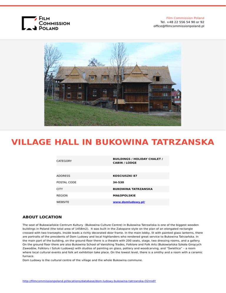 Film Commission Poland Tel. +48 22 556 54 90 or 92 office@filmcommissionpoland.pl VILLAGE HALL IN BUKOWINA TATRZANSKA CATEGORY BUILDINGS / HOLIDAY CHALET / CABIN / LODGE ADDRESS KOSCIUSZKI 87 POSTAL CODE 34-530 CITY BUKOWINA TATRZANSKA REGION MAŁOPOLSKIE WEBSITE www.domludowy.pl/ ABOUT LOCATION The seat of Bukowiańskie Centrum Kultury (Bukowina Culture Centre) in Bukowina Tatrzańska is one of the biggest wooden buildings in Poland (the total area of 1458m2). It was built in the Zakopane style on the plan of an elongated rectangle crossed with two transepts. Inside leads a richly decorated door frame. In the main lobby, lit with painted glass lanterns, there are portraits of the presidents of Dom Ludowy and local highlanders who rendered great service to Bukowina Tatrzańska. In the main part of the building, on the ground floor there is a theatre with 200 seats, stage, two dressing rooms, and a gallery. On the ground floor there are also Bukowina School of Vanishing Trades, Folklore and Folk Arts (Bukowiańska Szkoła Ginących Zawodów, Folkloru i Sztuki Ludowej) with studios of painting on glass, pottery and woodcarving, and “Świetlica” – a room where local cultural events and folk art exhibition take place. On the lowest level, there is a smithy and a room with a ceramic furnace. Dom Ludowy is the cultural centre of the village and the whole Bukowina commune. http://filmcommissionpoland.pl/locations/database/dom-ludowy-bukowina-tatrzanska-O2midY