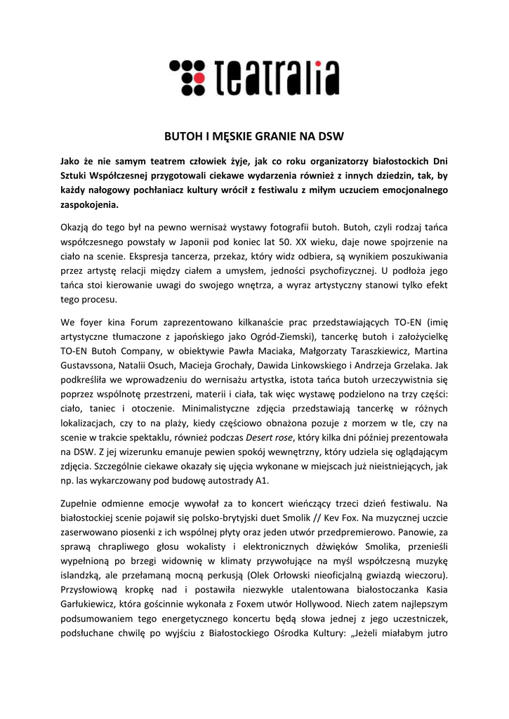 BUTOH I MĘSKIE GRANIE NA DSW Jako że nie samym teatrem człowiek żyje, jak co roku organizatorzy białostockich Dni Sztuki Współczesnej przygotowali ciekawe wydarzenia również z innych dziedzin, tak, by każdy nałogowy pochłaniacz kultury wrócił z festiwalu z miłym uczuciem emocjonalnego zaspokojenia. Okazją do tego był na pewno wernisaż wystawy fotografii butoh. Butoh, czyli rodzaj tańca współczesnego powstały w Japonii pod koniec lat 50. XX wieku, daje nowe spojrzenie na ciało na scenie. Ekspresja tancerza, przekaz, który widz odbiera, są wynikiem poszukiwania przez artystę relacji między ciałem a umysłem, jedności psychofizycznej. U podłoża jego tańca stoi kierowanie uwagi do swojego wnętrza, a wyraz artystyczny stanowi tylko efekt tego procesu. We foyer kina Forum zaprezentowano kilkanaście prac przedstawiających TO-EN (imię artystyczne tłumaczone z japońskiego jako Ogród-Ziemski), tancerkę butoh i założycielkę TO-EN Butoh Company, w obiektywie Pawła Maciaka, Małgorzaty Taraszkiewicz, Martina Gustavssona, Natalii Osuch, Macieja Grochały, Dawida Linkowskiego i Andrzeja Grzelaka. Jak podkreśliła we wprowadzeniu do wernisażu artystka, istota tańca butoh urzeczywistnia się poprzez wspólnotę przestrzeni, materii i ciała, tak więc wystawę podzielono na trzy części: ciało, taniec i otoczenie. Minimalistyczne zdjęcia przedstawiają tancerkę w różnych lokalizacjach, czy to na plaży, kiedy częściowo obnażona pozuje z morzem w tle, czy na scenie w trakcie spektaklu, również podczas Desert rose, który kilka dni później prezentowała na DSW. Z jej wizerunku emanuje pewien spokój wewnętrzny, który udziela się oglądającym zdjęcia. Szczególnie ciekawe okazały się ujęcia wykonane w miejscach już nieistniejących, jak np. las wykarczowany pod budowę autostrady A1. Zupełnie odmienne emocje wywołał za to koncert wieńczący trzeci dzień festiwalu. Na białostockiej scenie pojawił się polsko-brytyjski duet Smolik // Kev Fox. Na muzycznej uczcie zaserwowano piosenki z ich wspólnej płyty oraz jeden utwór przedpremierowo. Panowie, za sprawą chrapliwego głosu wokalisty i elektronicznych dźwięków Smolika, przenieśli wypełnioną po brzegi widownię w klimaty przywołujące na myśl współczesną muzykę islandzką, ale przełamaną mocną perkusją (Olek Orłowski nieoficjalną gwiazdą wieczoru). Przysłowiową kropkę nad i postawiła niezwykle utalentowana białostoczanka Kasia Garłukiewicz, która gościnnie wykonała z Foxem utwór Hollywood. Niech zatem najlepszym podsumowaniem tego energetycznego koncertu będą słowa jednej z jego uczestniczek, podsłuchane chwilę po wyjściu z Białostockiego Ośrodka Kultury: „Jeżeli miałabym jutro umrzeć, to nie martwiłabym się, bo to był mój najlepszy dzień w życiu!” Takich emocji życzę sobie i państwu, dokądkolwiek was artystyczne ścieżki zaprowadzą. Agnieszka Domańska, „Teatralia Trójmiasto” Źródło: Internetowy Magazyn „Teatralia”, numer 173/2016, 30 maja 2016 Dni Sztuki Współczesnej w Białymstoku, 18-22 maja 2016