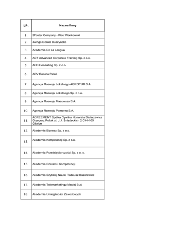 LP. Nazwa firmy 1. 2Foster Company - Piotr Plonkowski 2. 4wings Dorota Duszyńska 3. Academia De La Lengua 4. ACT Advanced Corporate Training Sp. z o.o. 5. ADS Consulting Sp. z o.o. 6. ADV Renata Paleń 7. Agencja Rozwoju Lokalnego AGROTUR S.A. 8. Agencja Rozwoju Lokalnego Sp. z o.o. 9. Agencja Rozwoju Mazowsza S.A. 10. Agencja Rozwoju Pomorza S.A. 11. AGREEMENT Spółka Cywilna Honorata Stolarzewicz Grzegorz Pollak ul. J.J. Śniadeckich 2 C44-105 Gliwice 12. Akademia Biznesu Sp. z o.o. 13. Akademia Kompetencji Sp. z o.o. 14. Akademia Przedsiębiorczości Sp. z o. o. 15. Akademia Szkoleń i Kompetencji 16. Akademia Szybkiej Nauki, Tadeusz Buzarewicz 17. Akademia Telemarketingu Maciej Buś 18. Akademia Umiejętności Zawodowych 19. AKME Consulting Krzysztof Pikor 20. Altkom Akademia S.A 21. ANVIX Spółka z o.o. 22. APEXnet Centrum Szkoleń Administracji Publicznej s.c. 23. ARK Consulting Romuald Korach 24. ART OF FINANCE Doradztwo Biznesowe Szczepan Brzeski 25. ASYLON Ośrodek Psychoedukacyjny, Teresa Sasak 26. ATC s.c. 27. Athenasoft Sp. z o.o. 28. A-TRYBUT OPTYMALIZACJA ZATRUDZIENIA 29. AutoID Polska Sp. z o.o. 30. B&O NAVIGATOR Firma Szkoleniowa Sp. z o.o. 31. Bankowy Ośrodek Doradztwa i Edukacji Sp. z o.o. 32. BERNDSON Sp. z o.o. 33. BETACOM S.A. 34. BPF s. c. 35. Betters Sp. j. A .Kabat, K. Balter 36. BIGRAM S.A Personel Consulting 37. Biuro Doradcze DOBRY PROJEKT Joanna KasprzakDżyberti 38. Biznes Edukator Sp. z o.o. 39. BKD "MARAL" 40. BOTTA Spółka z Ograniczoną Odpowiedzialnością 41. BPI Polska Sp. z o.o. 42. Bright Team Sp. z o.o. 43. BRITISH CENTRE Bożena Ziemniewicz, Marian Mikuś sp.j. 44. BRITISH CENTRE Szkoła Języków Obcych 45. Business Center 1.Anna Kępka (BC1) 46. Business Training Sp. z o.o. 47. C.L. Consulting i Logistyka spółka z ograniczoną odpowiedzialnością 48. CADExpert Sp. z o.o. 49. Catro International Management Consulting Sp z o.o. 50. CE2 Centrum Edukacji M. Dziewa, E. Tarnas-Szwed Sp.j. 51. CEGOS Polska sp. z o.o. 52. Centrum CBT Sp. z o.o. 53. Centrum Doradztwa Finansowego Urszula Bancerz 54. Centrum Doradztwa Gospodarczego Sp. z o.o. 55. Centrum Doradztwa i Kształcenia Kadr P.W. Zbryk 56. Centrum Edukacji Atut Dolny Śląsk s.c. J. Jastrzębski, M. Kullanda, A. Maciejowski, Przedsiębiorstwo Produkcyjno - Usługowe "Victoria" Sp. z o.o. 57. Centrum Edukacji Ekspert 58. Centrum Edukacji Grupa ORLEN 59. Centrum Edukacji Logistycznej Sp. z o.o. 60. Centrum Kreowania Liderów S.A. 61. Centrum Kształcenia i Szkolenia Spółka z ograniczoną odpowiedzialnością 62. Centrum Nauki i Biznesu Żak Sp. z o.o. 63. Centrum Organizacji Szkoleń Menedżerskich Elżbieta Dąbrowska 64. Centrum Psychoterapii i Szkoleń Psychologicznych 65. Centrum Rozwiązań Menedżerskich S.A. 66. Centrum Rozwoju Biznesu i Administracji Grupy ITC (ITC CS Sp. z o.o.) 67. Centrum Rozwoju Coaching i Szkolenia 68. Centrum SUPER-ego K. Fura, K.Ździebło Sp.j. 69. Centrum Szkolenia i Promocji "PRESTIGE" 70. Centrum Szkolenia Kadr i Samorządów Suprema Lex s.c. A. Dudek, A. Rynkiewicz 71. Centrum Szkolenia Zawodowego Sp. z o.o. 72. Centrum Szkoleniowe MENTOR Rafał Banaśkiewicz 73. Centrum Szkoleniowo-Konsultingowe KONCEPT Krzysztof Wiśniak 74. Certes Sp. z o.o. 75. CERTUS Centrum Szkolenia i Doradztwa Sp. z o.o. 76. Coaching Center Paweł Sopkowski 77. COMARTIN - Szkolenia, Konsulting, Badania Rynku 78. Communication One Consulting Sp. Z o.o. 79. Conart Sp. z o.o 80. CONEX Szkolenia i Doradztwo 81. CS Szkolenia i Doradztwo Sp. z o.o. 82. Czesław Ochal BHP i PPOŻ Dradztwo, Szkolenia, Usługi 83. Development Partners Weinmann Maciej 84. DGT Sp. z o.o. 85. DMD CENTRUM SZKOLENIOWE A. KEMPIŃSKA I K. KEMPIŃSKI SJ 86. Dom Szkoleń i Doradztwa Aleksandra Mykowska 87. DOOR GROUP S.A. 88. Doradztwo Biznesowe Rafał Łagódka 89. DSLO Dariusz Słomkowski 90. ECDDP Szkolenia Sp zo.o 91. Edustacja.pl Sp. z o.o. 92. EEG Instytut Michaela Pakszys 93. EGO Centrum Edukacji i Doradztwa Adam Sikora 94. EHRp Sp. z o.o. 95. Ekoconsultant Sp. z o.o. 96. EKOLOGUS Sp. z o.o. 97. EMPRIZ Group 98. English Unlimited Sp. z o.o. 99. Ensize Consulting Group Bernaś, Olesiak i Żarnomski Spółka Jawna 100. EQUINUM BROKER Sp. z o.o. 101. EUREKA SP Z O.O. 102. EUROFINANCE TRAINING SP. Z O.O. 103. Euro-Konsulting Sp. z o.o. 104. Europejski Instytut Psychologii Biznesu C.M. Fryszkiewicz sp.j. 105. Europejskie Centrum Kształcenia "Eureka" Sp. z o.o. 106. EUROPOINT 107. Eurospektrum s.c. K.Świder, G. Bratek 108. EXBIS Eksperci Biznesmenom - Szopa i Szóstak Sp. J. 109. EXERTUS Sp. z o.o. 110. F5 Konsulting Sp. z o. o. 111. FIRMA 2000 Sp.z o.o. 112. Firma DAMAX Małgorzata Puz, Iwona Gawor Spółka Jawna 113. Firma Doradcza UNI-PROJEKT - Anna Wojciechowska 114. Firma SUKURS 115. Firma Szkoleniowa Agnieszka Wiśniewska - Woźniak 116. Firma Szkoleniowo- Doradcza Anna Szywała s.c. 117. Focus Sp. z o.o. 118. FOKUS Grupa Doradczo-Szkoleniowa Michał Pyziak 119. Forum Edukacyjne Centrum Zamówień Publicznych Sp. z o.o. 120. FPL sp. z o.o. 121. FRANCUSKI INSTYTUT GOSPODARKI-POLSKA sp. z o.o. 122. Fundacja Edukacja Bez Granic 123. Fundacja Nauki Języków Obcych "Linguae Mundi" 124. Fundacja Promocji Edukacyjnej ORYLION 125. Fundacja Rozwoju Bankowości Spółdzielczej 126. Fundacja Rozwoju Demokracji Lokalnej 127. Fundacja Rozwoju Przedsiębiorczości 128. Fundacja Wałbrzych 2000 129. Fundacja Warszawski Instytut Bankowości 130. Future Centre Training Corporation Krawczyk i Lipczyński Spółka Jawna 131. G.B. Management Dział Doskonalenia Kadr Medycznych Gheek Jagdish, Bober -Gheek Bogumiła 132. G.T. Mentor s.c., Janina Dragosz 133. GAMMA D. Didiuk i M. Wasilewski s.j 134. GB Resources Polska Sp. z o.o. 135. Gdańska Fundacja Kształcenia Menedżerów 136. GFMP Management Consultants Bogdan Dąbrowski Sp. k. 137. Global Service M&A Eu College 138. Greń Communication sp.z o.o. 139. GROW Galecki i Pietrzak Spółka Jawna 140. GRUPA EDUKACYJNA MAC S.A. 141. Grupa Doradczo szkoleniowa Transmisja Magdale
