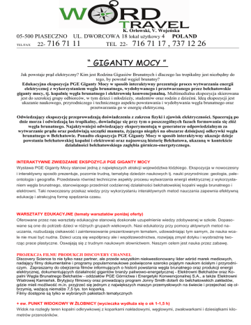 05-500 PIASECZNO TEL/FAX 22- 716 71 K. Orłowski, V. Wojeńska UL. DWORCOWA 18 lokal użytkowy 4 POLAND 11 TEL 22- 716 71 17 , 737 12 26 “ GIGANTY MOCY ” Jak powstaje prąd elektryczny? Kim jest Rodzina Gigusiów Brunatnych i dlaczego las tropikalny jest niezbędny do tego, by powstał węgiel brunatny? Edukacyjna ekspozycja PGE Giganty Mocy w sposób interaktywny prezentuje proces wytwarzania energii elektrycznej z wykorzystaniem węgla brunatnego, wydobywanego i przetwarzanego przez bełchatowskie giganty mocy, tj. kopalnię węgla brunatnego i elektrownię konwencjonalną. Multimedialna ekspozycja skierowana jest do szerokiej grupy odbiorców, w tym dzieci i młodzieży, studentów oraz rodzin z dziećmi. Ideą ekspozycji jest ukazanie naukowego, przyrodniczego i technicznego aspektu powstawania i wydobywania węgla brunatnego oraz przetwarzania go w energię elektryczną. Odwiedzający ekspozycję przeprowadzają doświadczenia z zakresu fizyki i zjawisk elektryczności. Spacerują po dnie morza i odwiedzają las tropikalny, dowiadując się przy tym o poszczególnych fazach formowania się złóż węgla brunatnego. Najaktywniejsi odwiedzający eksperymentują w generatorze odpowiedzialnym za wytwarzanie prądu oraz podziwiają szczątki mamuta, żyjącego niegdyś na obszarze dzisiejszej odkrywki węgla brunatnego w Bełchatowie. Ponadto ekspozycja PGE Giganty Mocy w sposób interaktywny ukazuje dzieje powstania bełchatowskiej kopalni i elektrowni oraz najnowszą historię Bełchatowa, ukazaną w kontekście działalności bełchatowskiego zagłębia górniczo-energetycznego. INTERAKTYWNE ZWIEDZANIE EKSPOZYCJI PGE GIGANTY MOCY Wystawa PGE Giganty Mocy stanowi jedną z największych atrakcji województwa łódzkiego. Ekspozycja w nowoczesny i interaktywny sposób prezentuje, pozornie trudną, tematykę dziedzin naukowych tj. nauki przyrodnicze: geologia, paleontologia i geografia. Przedstawia również techniczne aspekty procesu wytwarzania energii elektrycznej z wykorzystaniem węgla brunatnego, stanowiącego przedmiot codziennej działalności bełchatowskiej kopalni węgla brunatnego i elektrowni. Taki nowoczesny przekaz wiedzy przy wykorzystaniu interaktywnych metod nauczania zapewnia efektywną edukację i atrakcyjną formę spędzania czasu. WARSZTATY EDUKACYJNE (tematy warsztatów poniżej oferty) Oferowane przez nas warsztaty edukacyjne stanowią doskonałe uzupełnienie wiedzy zdobywanej w szkole. Dopasowane są one do potrzeb dzieci w różnych grupach wiekowych. Nasi edukatorzy przy pomocy aktywnych metod nauczania, rozbudzają ciekawość i zainteresowanie prezentowanym tematem, udowadniając tym samym, że nauka wcale nie musi być nudna. Dzieci uczą się współpracy ale i współzawodnictwa, rozwijają zmysł dotyku i wyobraźnię tworząc prace plastyczne. Oswajają się z trudnym naukowym słownictwem. Naszym celem jest nauka przez zabawę. PROJEKCJA FILMU PRODUKCJI DISCOVERY CHANNEL Discovery Science to nie tylko nasz partner, ale przede wszystkim niekwestionowany lider wśród marek mediowych, nadający filmy dokumentalne i programy popularnonaukowe poświęcone szeroko pojętym naukom ścisłym i przyrodniczym. Zapraszamy do obejrzenia filmów informujących o historii powstania węgla brunatnego oraz produkcji energii elektrycznej, dokumentujących działalność gigantów branży paliwowo-energetycznej - Elektrowni Bełchatów oraz Kopalni Węgla Brunatnego Bełchatów - oddziałów PGE Górnictwa i Energetyki Konwencjonalnej S.A., a także Elektrowni Wiatrowej Kamieńsk. Brytyjscy filmowcy oraz prowadzący program Jonny Smith dotarli do bełchatowskich zakładów, gdzie mieli możliwość m.in. przyjrzeć się jednym z największych maszyn przemysłowych na świecie i przejechać się olbrzymią, ważącą niemalże 7,5 tys. ton koparką. Filmy dostępne są tylko w wybranych pakietach tematycznych + ew. PUNKT WIDOKOWY W ŻŁOBNICY (wycieczka wydłuża się o ok 1-1,5 h) Widok na rozległy teren kopalni odkrywkowej z koparkami nakładowymi, węglowymi, zwałowarkami i dziesiątkami kilometrów przenośników. PROGRAM RAMOWY: 8.30 Wyjazd Ok. 10.30 -11.00 przyjazd do Bełchatowa Ok. 11.00-15.30 Pobyt w PGE Giganty Mocy *Ok. 15.30 – 16.30 Punkt widokowy w Żłobnicy Ok. 18.30-19.00 Powrót Świadczenia: - transport lux autokarem marki, np. Mercedes, Volvo, Scania, MAN, Neoplan z WC, DVD, barkiem, uchylnymi siedzeniami - realizacja programu turystycznego - opieka pilota - ubezpieczenie NW 5000 zł - VAT - 3 miejsca gratis dla nauczycieli Cena: 70 zł /min. 40 os. - max. 45 os. płacących 80 zł /min. 35 os. - max. 39 os. płacących 90 zł /min. 30 os. - max. 34 os. płacących +dodatkowo bilety wstępu : 20 zł KWOTĘ NA BILETY WSTĘPU POTWIERDZAMY PRZED DOPŁATĄ ZGODNIE Z OBOWIĄZUJĄCYMI CENNIKAMI . +możliwość zjedzenia obiadu w cenie 20zł/os. (zupa, II danie, napój) lub 15zł/os. (II danie, napój) JEDNORAZOWO RESTAURACJA MIEŚCI GRUPY DO 45 OS . WIĘKSZE GRUPY MAJĄ OBIAD W 2 TURACH. OBIAD MOŻNA ZJEŚĆ WYŁĄCZNIE PRZED LUB PO WYJSCIU Z “GIGANTÓW MOCY” PROSZE UWZGLEDNIĆ, ŻE W TAKIM PRZYPADKU CZAS ZAKOŃCZENIA WYCIECZKI JEST OK. 1 GODZ PÓŹNIEJ Standardowy rozmiar naszych autokarów to 49 miejsc (do dyspozycji grupy wraz z opiekunami). Na Państwa życzenie możemy zarezerwować autokary 57-70 miejsc (w tym przypadku prosimy o kontakt z biurem w celu sprawdzenia kalkulacji na ponadstandardowy pojazd i jego dostępności w wybranym przez Państwa terminie). W celu podpisania umowy i rezerwacji konkretnego terminu prosimy o telefon do biura 022 716 71 11 lub 022 716 71 17 lub mail [email protected] Zaliczka konieczna do podpisania umowy 40zł/os. Ze względu na szczyt sezonu wycieczek szkolnych w miesiącach maj-czerwiec sugerujemy dokonanie rez. wstępnej na czas zebrania zaliczek! Wyciąg z warunków uczestnictwa imprez turystycznych organizowanych przez B.P. Word Travel (pełna wersja warunków uczestnictwa dostępna jest u nauczyciel