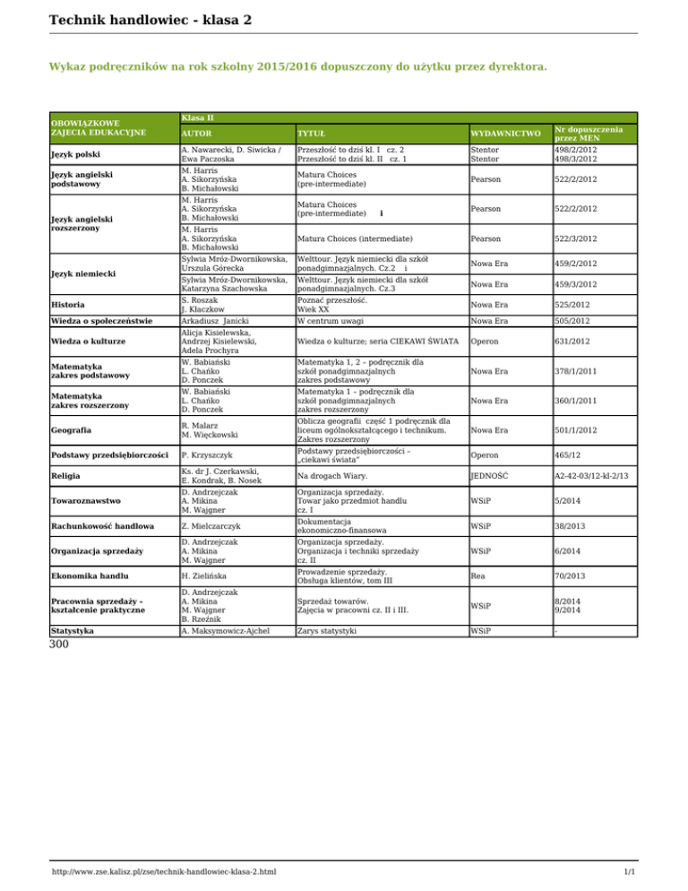 Technik handlowiec - klasa 2 Wykaz podręczników na rok szkolny 2015/2016 dopuszczony do użytku przez dyrektora. OBOWIĄZKOWE ZAJECIA EDUKACYJNE Klasa II AUTOR TYTUŁ WYDAWNICTWO Nr dopuszczenia przez MEN Język polski A. Nawarecki, D. Siwicka / Ewa Paczoska Przeszłość to dziś kl. I cz. 2 Przeszłość to dziś kl. II cz. 1 Stentor Stentor 498/2/2012 498/3/2012 Język angielski podstawowy M. Harris A. Sikorzyńska B. Michałowski Matura Choices (pre-intermediate) Pearson 522/2/2012 M. Harris A. Sikorzyńska B. Michałowski Matura Choices (pre-intermediate) Pearson 522/2/2012 M. Harris A. Sikorzyńska B. Michałowski Matura Choices (intermediate) Pearson 522/3/2012 Sylwia Mróz-Dwornikowska, Urszula Górecka Welttour. Język niemiecki dla szkół ponadgimnazjalnych. Cz.2 i Nowa Era 459/2/2012 Sylwia Mróz-Dwornikowska, Katarzyna Szachowska Welttour. Język niemiecki dla szkół ponadgimnazjalnych. Cz.3 Nowa Era 459/3/2012 Historia S. Roszak J. Kłaczkow Poznać przeszłość. Wiek XX Nowa Era 525/2012 Wiedza o społeczeństwie Arkadiusz Janicki W centrum uwagi Nowa Era 505/2012 Wiedza o kulturze Alicja Kisielewska, Andrzej Kisielewski, Adela Prochyra Wiedza o kulturze; seria CIEKAWI ŚWIATA Operon 631/2012 Matematyka zakres podstawowy W. Babiański L. Chańko D. Ponczek Matematyka 1, 2 – podręcznik dla szkół ponadgimnazjalnych zakres podstawowy Nowa Era 378/1/2011 Matematyka zakres rozszerzony W. Babiański L. Chańko D. Ponczek Matematyka 1 – podręcznik dla szkół ponadgimnazjalnych zakres rozszerzony Nowa Era 360/1/2011 Geografia R. Malarz M. Więckowski Oblicza geografii część 1 podręcznik dla liceum ogólnokształcącego i technikum. Zakres rozszerzony Nowa Era 501/1/2012 Podstawy przedsiębiorczości P. Krzyszczyk Podstawy przedsiębiorczości – „ciekawi świata” Operon 465/12 Religia Ks. dr J. Czerkawski, E. Kondrak, B. Nosek Na drogach Wiary. JEDNOŚĆ A2-42-03/12-kl-2/13 Towaroznawstwo D. Andrzejczak A. Mikina M. Wajgner Organizacja sprzedaży. Towar jako przedmiot handlu cz. I WSiP 5/2014 Rachunkowość handlowa Z. Mielczarczyk Dokumentacja ekonomiczno-finansowa WSiP 38/2013 Organizacja sprzedaży D. Andrzejczak A. Mikina M. Wajgner Organizacja sprzedaży. Organizacja i techniki sprzedaży cz. II WSiP 6/2014 Ekonomika handlu H. Zielińska Prowadzenie sprzedaży. Obsługa klientów, tom III Rea 70/2013 Pracownia sprzedaży – kształcenie praktyczne D. Andrzejczak A. Mikina M. Wajgner B. Rzeźnik Sprzedaż towarów. Zajęcia w pracowni cz. II i III. WSiP 8/2014 9/2014 Statystyka A. Maksymowicz-Ajchel Zarys statystyki WSiP - Język angielski rozszerzony Język niemiecki i 300 http://www.zse.kalisz.pl/zse/technik-handlowiec-klasa-2.html 1/1