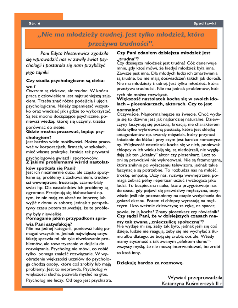 Str. 6 Spod ławki „Nie ma młodzieży trudnej. Jest tylko młodzież, która przeżywa trudności”. Pani Edyta Nesterewicz zgodziła się wprowadzić nas w zawiły świat psychologii i postarała się nam przybliżyć jego tajniki. Czy Pani zdaniem dzisiejsza młodzież jest „trudna”? Czy dzisiejsza młodzież jest trudna? Cóż denerwuje mnie, gdy ktoś mówi, że kiedyś młodzież była inna. Zawsze jest inna. Dla młodych ludzi ich zmartwienia są trudne, bo nie mają doświadczeń takich jak dorośli. Nie ma młodzieży trudnej. Jest tylko młodzież, która przeżywa trudności. Nie ma jednak problemów, których nie można rozwiązać. Większość nastolatek kocha się w swoich idolach – piosenkarzach, aktorach. Czy to jest normalne? Oczywiście. Najnormalniejsze na świecie. Choć wydaje się to dziwne jest jak najbardziej naturalne. Dziewczyny fascynują się postacią, kreacją, nie charakterem idola tylko wykreowaną postacią, która jest sklejką antagonizmów np. twardy mięśniak, który przynosi śniadanie do łóżka i przy czym jest bardzo romantyczny. Większość nastolatek kocha się w nich, ponieważ chłopcy w ich wieku biją się, są niedojrzali, nie wyglądają jak ten „idealny” aktor czy piosenkarz. Lecz to oni są prawdziwi nie wykreowani. Nie są fatamorganą, która zniknie po wyłączeniu telewizora, jednak takie fascynacje są potrzebne. To rozbudza nas na miłość, troskę, empatię. Uczy nas, rozwija wewnętrznie, pomaga zebrać pełny repertuar uczuć i wzbogaca jako ludzi. To bezpieczna nauka, która przygotowuje nas do czasu, gdy pojawi się prawdziwy mężczyzna, oczywiście jeśli nie pozostaniemy na etapie wzdychania do gwiazd ekranu. Potem ci chłopcy wyrastają na mężczyzn. I kto weźmie dziewczynę za rękę, na spacer, powie, że ją kocha? Znany piosenkarz czy rówieśnik? Czy sądzi Pani, że w dzisiejszych czasach mamy tak zwaną „znieczulicę społeczną”? Nie wydaje mi się, żeby tak było, jednak jeśli się coś dzieje, ludzie nie reagują, żeby się nie wychylać z tłumu albo dlatego, że boją się zrobić coś źle. Wtedy mamy styczność z tak zwanym „efektem tłumu”wszyscy myślą, że nie muszą interweniować, bo zrobi to ktoś inny. Czy studia psychologiczne są ciekawe ? Owszem są ciekawe, ale trudne. W końcu praca z człowiekiem jest najtrudniejszą zajęciem. Trzeba znać różne podejścia i ujęcia psychologiczne. Należy zapamiętać wszystko oraz wiedzieć jak i gdzie to wykorzystać. Są też mocno dociążające psychicznie, ponieważ wiedzę, której się uczymy, trzeba porównać do siebie. Gdzie można pracować, będąc psychologiem? Jest bardzo wiele możliwości. Można pracować w korporacjach, firmach, w szkołach, mieć własną praktykę. Istnieją też prywatni psychologowie gwiazd i sportowców. Z jakimi problemami wśród nastolatków spotkała się Pani? Jest ich niezmiernie dużo, ale często spotykane są: problemy z zachowaniem, trudności wewnętrzne, frustracje, czarno-biały świat itp. Dla nastolatków ich problemy są ogromne. Przejmują się błahostkami np. tym, że nie mają co ubrać na imprezę lub wyjść z domu w sobotę. Jednak z perspektywy czasu potem zauważają, że te problemy były niewielkie. Pomaganie jakim przypadkom sprawia Pani satysfakcję? Nie ma jednej kategorii, ponieważ lubię pomagać wszystkim. Jednak największą satysfakcję sprawia mi nie tyle niwelowanie problemów, ale towarzyszenie w dojściu do rozwiązania. Psycholog nie mówi, co robić tylko pomaga znaleźć rozwiązanie. W wyobrażeniu większości uczniów do psychologa chodzą osoby, które coś zrobiły lub mają Dziękuję bardzo za rozmowę. problemy. Jest to nieprawda. Psycholog w większości słucha, pozwala myśleć na głos. Wywiad przeprowadziła Psycholog nie leczy. Od tego jest psychiatra. Katarzyna Kuśmierczyk II r