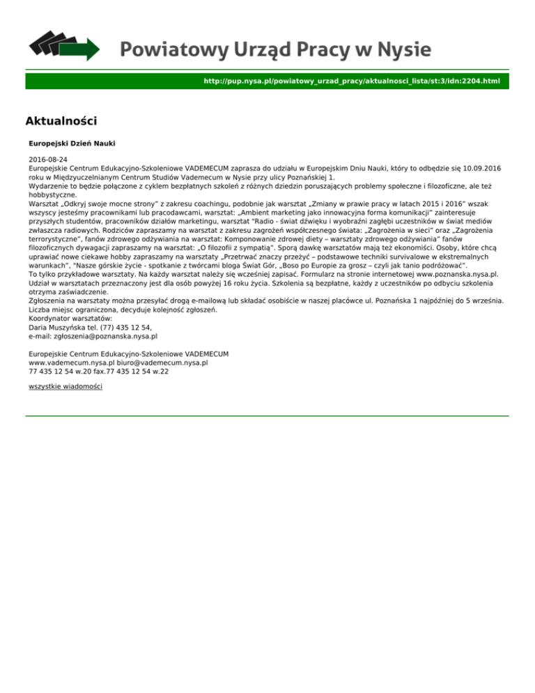 http://pup.nysa.pl/powiatowy_urzad_pracy/aktualnosci_lista/st:3/idn:2204.html Aktualności Europejski Dzień Nauki 2016-08-24 Europejskie Centrum Edukacyjno-Szkoleniowe VADEMECUM zaprasza do udziału w Europejskim Dniu Nauki, który to odbędzie się 10.09.2016 roku w Międzyuczelnianym Centrum Studiów Vademecum w Nysie przy ulicy Poznańskiej 1. Wydarzenie to będzie połączone z cyklem bezpłatnych szkoleń z różnych dziedzin poruszających problemy społeczne i filozoficzne, ale też hobbystyczne. Warsztat „Odkryj swoje mocne strony” z zakresu coachingu, podobnie jak warsztat „Zmiany w prawie pracy w latach 2015 i 2016” wszak wszyscy jesteśmy pracownikami lub pracodawcami, warsztat: „Ambient marketing jako innowacyjna forma komunikacji” zainteresuje przyszłych studentów, pracowników działów marketingu, warsztat "Radio - świat dźwięku i wyobraźni zagłębi uczestników w świat mediów zwłaszcza radiowych. Rodziców zapraszamy na warsztat z zakresu zagrożeń współczesnego świata: „Zagrożenia w sieci” oraz „Zagrożenia terrorystyczne”, fanów zdrowego odżywiania na warsztat: Komponowanie zdrowej diety – warsztaty zdrowego odżywiania” fanów filozoficznych dywagacji zapraszamy na warsztat: „O filozofii z sympatią”. Sporą dawkę warsztatów mają też ekonomiści. Osoby, które chcą uprawiać nowe ciekawe hobby zapraszamy na warsztaty „Przetrwać znaczy przeżyć – podstawowe techniki survivalowe w ekstremalnych warunkach”, "Nasze górskie życie - spotkanie z twórcami bloga Świat Gór, „Boso po Europie za grosz – czyli jak tanio podróżować”. To tylko przykładowe warsztaty. Na każdy warsztat należy się wcześniej zapisać. Formularz na stronie internetowej www.poznanska.nysa.pl. Udział w warsztatach przeznaczony jest dla osób powyżej 16 roku życia. Szkolenia są bezpłatne, każdy z uczestników po odbyciu szkolenia otrzyma zaświadczenie. Zgłoszenia na warsztaty można przesyłać drogą e-mailową lub składać osobiście w naszej placówce ul. Poznańska 1 najpóźniej do 5 września. Liczba miejsc ograniczona, decyduje kolejność zgłoszeń. Koordynator warsztatów: Daria Muszyńska tel. (77) 435 12 54, e-mail: zgł[email protected] Europejskie Centrum Edukacyjno-Szkoleniowe VADEMECUM www.vademecum.nysa.pl [email protected] 77 435 12 54 w.20 fax.77 435 12 54 w.22 wszystkie wiadomości