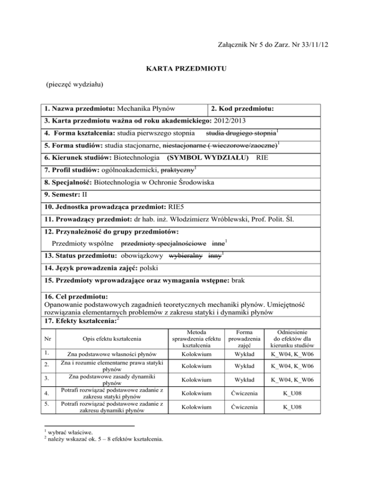 Załącznik Nr 5 do Zarz. Nr 33/11/12 KARTA PRZEDMIOTU (pieczęć wydziału) 1. Nazwa przedmiotu: Mechanika Płynów 2. Kod przedmiotu: 3. Karta przedmiotu ważna od roku akademickiego: 2012/2013 4. Forma kształcenia: studia pierwszego stopnia studia drugiego stopnia1 5. Forma studiów: studia stacjonarne, niestacjonarne ( wieczorowe/zaoczne)1 6. Kierunek studiów: Biotechnologia (SYMBOL WYDZIAŁU) RIE 7. Profil studiów: ogólnoakademicki, praktyczny1 8. Specjalność: Biotechnologia w Ochronie Środowiska 9. Semestr: II 10. Jednostka prowadząca przedmiot: RIE5 11. Prowadzący przedmiot: dr hab. inż. Włodzimierz Wróblewski, Prof. Polit. Śl. 12. Przynależność do grupy przedmiotów: Przedmioty wspólne przedmioty specjalnościowe inne1 13. Status przedmiotu: obowiązkowy wybieralny inny1 14. Język prowadzenia zajęć: polski 15. Przedmioty wprowadzające oraz wymagania wstępne: brak 16. Cel przedmiotu: Opanowanie podstawowych zagadnień teoretycznych mechaniki płynów. Umiejętność rozwiązania elementarnych problemów z zakresu statyki i dynamiki płynów 17. Efekty kształcenia:2 Opis efektu kształcenia Metoda sprawdzenia efektu kształcenia Forma prowadzenia zajęć Odniesienie do efektów dla kierunku studiów 1. Zna podstawowe własności płynów Kolokwium Wykład K_W04, K_W06 2. Zna i rozumie elementarne prawa statyki płynów Zna podstawowe zasady dynamiki płynów Potrafi rozwiązać podstawowe zadanie z zakresu statyki płynów Potrafi rozwiązać podstawowe zadanie z zakresu dynamiki płynów Kolokwium Wykład K_W04, K_W06 Kolokwium Wykład K_W04, K_W06 Kolokwium Ćwiczenia K_U08 Kolokwium Ćwiczenia K_U08 Nr 3. 4. 5. 1 2 wybrać właściwe. należy wskazać ok. 5 – 8 efektów kształcenia. 18. Formy zajęć dydaktycznych i ich wymiar (liczba godzin) W. 15h Ćw.15h L.P.- Sem.19. Treści kształcenia: (oddzielnie dla każdej z form zajęć dydaktycznych W ./Ćw./L./P./Sem.) Wykład Przedmiot mechaniki płynów i podstawowy jej podział. Własności płynów. Siły działające w płynach. Napięcie powierzchniowe, włoskowatość. Warunki równowagi. Równowaga atmosfery. Prawo Pascala. Ciśnienie hydrostatyczne. Napór hydrostatyczny. Wypór, zasada Archimedesa. Równanie ciągłości przepływu. Podstawowe równania ruchu płynów nielepkich. Równanie Bernoulliego. Ciśnienie dynamiczne. Pomiar strumienia przepływu. Wypływ cieczy ze zbiornika. Czas opróżniania zbiornika z cieczą. Równania ruchu płynów lepkich. Podobieństwo dynamiczne przepływów. Opór w przepływie. Opadanie swobodne. Przepływy laminarne i turbulentne. Obliczanie strat w przepływach. Ćwiczenia Rozwiązywanie przykładów ilustrujących materiał wykładu z zakresu napięcia powierzchniowego i włoskowatości, warunków równowagi, naporu hydrostatycznego, wyporu, zasady Archimedesa, równania ciągłości przepływu, równania Bernoulliego dla przepływu rzeczywistego . 20. Egzamin: tak nie1 21. Literatura podstawowa: Gryboś R. “Podstawy mechaniki płynów”, PWN, Warszawa 1998, Gryboś R. “Mechanika płynów”, Skrypt Politechniki Śląskiej 22. Literatura uzupełniająca: Prosnak W. „Mechanika płynów”, PWN Warszawa 1971, Orzechowski Z, Prywer J., Zarzycki R., Mechanika płynów w inżynierii środowiska, Wyd. Naukowo-Techniczne, Warszawa, 1997 23. Nakład pracy studenta potrzebny do osiągnięcia efektów kształcenia: Lp. Forma zajęć 1 2 3 4 5 6 Wykład Ćwiczenia Laboratorium Projekt Seminarium Inne Suma godzin Liczba godzin kontaktowych/ pracy studenta 15/15 15/15 -/-/-/15/15 45/45 24. Suma wszystkich godzin:90 25. Liczba punktów ECTS:3 3 26. Liczba punktów ECTS uzyskanych na zajęciach z bezpośrednim udziałem nauczyciela akademickiego: 1,5 27. Liczba punktów ECTS uzyskanych na zajęciach o charakterze praktycznym (laboratoria, projekty): 0 26. Uwagi: 1 punkt ECTS – 30 godzin. 3 Zatwierdzono: ……………………………. (data i podpis prowadzącego) ………………………………………………… (data i podpis dyrektora instytutu/kierownika katedry/ Dyrektora Kolegium Języków Obcych/kierownika lub Dyrektora jednostki międzywydziałowej