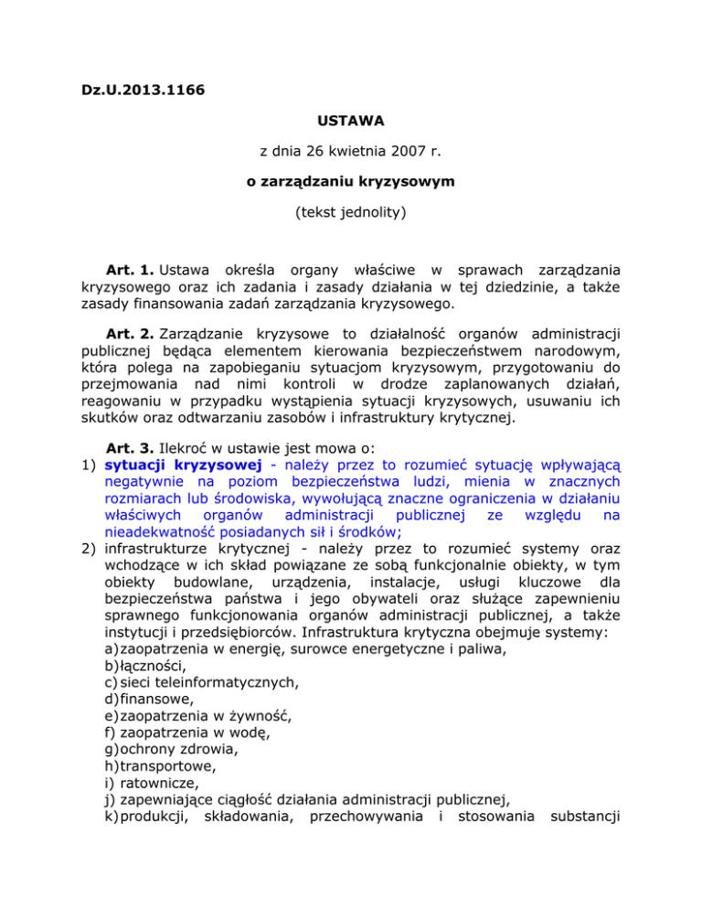 Dz.U.2013.1166 USTAWA z dnia 26 kwietnia 2007 r. o zarządzaniu kryzysowym (tekst jednolity) Art. 1. Ustawa określa organy właściwe w sprawach zarządzania kryzysowego oraz ich zadania i zasady działania w tej dziedzinie, a także zasady finansowania zadań zarządzania kryzysowego. Art. 2. Zarządzanie kryzysowe to działalność organów administracji publicznej będąca elementem kierowania bezpieczeństwem narodowym, która polega na zapobieganiu sytuacjom kryzysowym, przygotowaniu do przejmowania nad nimi kontroli w drodze zaplanowanych działań, reagowaniu w przypadku wystąpienia sytuacji kryzysowych, usuwaniu ich skutków oraz odtwarzaniu zasobów i infrastruktury krytycznej. Art. 3. Ilekroć w ustawie jest mowa o: 1) sytuacji kryzysowej - należy przez to rozumieć sytuację wpływającą negatywnie na poziom bezpieczeństwa ludzi, mienia w znacznych rozmiarach lub środowiska, wywołującą znaczne ograniczenia w działaniu właściwych organów administracji publicznej ze względu na nieadekwatność posiadanych sił i środków; 2) infrastrukturze krytycznej - należy przez to rozumieć systemy oraz wchodzące w ich skład powiązane ze sobą funkcjonalnie obiekty, w tym obiekty budowlane, urządzenia, instalacje, usługi kluczowe dla bezpieczeństwa państwa i jego obywateli oraz służące zapewnieniu sprawnego funkcjonowania organów administracji publicznej, a także instytucji i przedsiębiorców. Infrastruktura krytyczna obejmuje systemy: a) zaopatrzenia w energię, surowce energetyczne i paliwa, b) łączności, c) sieci teleinformatycznych, d) finansowe, e) zaopatrzenia w żywność, f) zaopatrzenia w wodę, g) ochrony zdrowia, h) transportowe, i) ratownicze, j) zapewniające ciągłość działania administracji publicznej, k) produkcji, składowania, przechowywania i stosowania substancji chemicznych i promieniotwórczych, w tym rurociągi substancji niebezpiecznych; 2a)europejskiej infrastrukturze krytycznej - należy przez to rozumieć systemy oraz wchodzące w ich skład powiązane ze sobą funkcjonalnie obiekty, w tym obiekty budowlane, urządzenia i instalacje kluczowe dla bezpieczeństwa państwa i jego obywateli oraz służące zapewnieniu sprawnego funkcjonowania organów administracji publicznej, a także instytucji i przedsiębiorców, wyznaczone w systemach, o których mowa w pkt 2 lit. a i h, w zakresie energii elektrycznej, ropy naftowej i gazu ziemnego oraz transportu drogowego, kolejowego, lotniczego, wodnego śródlądowego, żeglugi oceanicznej, żeglugi morskiej bliskiego zasięgu i portów, zlokalizowane na terytorium państw członkowskich Unii Europejskiej, których zakłócenie lub zniszczenie miałoby istotny wpływ na co najmniej dwa państwa członkowskie; 3) ochronie infrastruktury krytycznej - należy przez to rozumieć wszelkie działania zmierzające do zapewnienia funkcjonalności, ciągłości działań i integralności infrastruktury krytycznej w celu zapobiegania zagrożeniom, ryzykom lub słabym punktom oraz ograniczenia i neutralizacji ich skutków oraz szybkiego odtworzenia tej infrastruktury na wypadek awarii, ataków oraz innych zdarzeń zakłócających jej prawidłowe funkcjonowanie; 4) planowaniu cywilnym - należy przez to rozumieć: a) całokształt przedsięwzięć organizacyjnych mających na celu przygotowanie administracji publicznej do zarządzania kryzysowego, b) planowanie w zakresie wspierania Sił Zbrojnych Rzeczypospolitej Polskiej w razie ich użycia oraz planowanie wykorzystania Sił Zbrojnych Rzeczypospolitej Polskiej do realizacji zadań z zakresu zarządzania kryzysowego; 5) (uchylony); 6) powiecie - należy przez to rozumieć również miasto na prawach powiatu; 7) cyklu planowania - należy przez to rozumieć okresowe realizowanie etapów: analizowania, programowania, opracowywania planu lub programu, jego wdrażanie, testowanie i uruchamianie; 8) siatce bezpieczeństwa - należy przez to rozumieć zestawienie potencjalnych zagrożeń ze wskazaniem podmiotu wiodącego przy ich usuwaniu oraz podmiotów współpracujących; 9) mapie zagrożenia - należy przez to rozumieć mapę przedstawiającą obszar geograficzny objęty zasięgiem zagrożenia z uwzględnieniem różnych scenariuszy zdarzeń; 10) mapie ryzyka - należy przez to rozumieć mapę lub opis przedstawiający potencjalnie negatywne skutki oddziaływania zagrożenia na ludzi, środowisko, mienie i infrastrukturę; 11) zdarzeniu o charakterze terrorystycznym - należy przez to rozumieć sytuację powstałą na skutek czynu określonego w art. 115 § 20 ustawy z dnia 6 czerwca 1997 r. - Kodeks karny (Dz. U. Nr 88, poz. 553, z późn. zm.) lub zagrożenie zaistnienia takiego czynu, mogącego doprowadzić do sytuacji kryzysowej. 1) 2) 3) 4) 5) 6) 1) 2) 3) 4) 5) Art. 4. 1. Zadania z zakresu planowania cywilnego obejmują: przygotowanie planów zarządzania kryzysowego; przygotowanie struktur uruchamianych w sytuacjach kryzysowych; przygotowanie i utrzymywanie zasobów niezbędnych do wykonania zadań ujętych w planie zarządzania kryzysowego; utrzymywanie baz danych niezbędnych w procesie zarządzania kryzysowego; przygotowanie rozwiązań na wypadek zniszczenia lub zakłócenia funkcjonowania infrastruktury krytycznej; zapewnienie spójności między planami zarządzania kryzysowego a innymi planami sporządzanymi w tym zakresie przez właściwe organy administracji publicznej, których obowiązek wykonania wynika z odrębnych przepisów. 2. Zadania, o których mowa w ust. 1, powinny uwzględniać: zapewnienie funkcjonowania administracji publicznej w sytuacji kryzysowej; zapewnienie funkcjonowania i możliwości odtworzenia infrastruktury krytycznej; zapewnienie ciągłego monitorowania zagrożeń; racjonalne gospodarowanie siłami i środkami w sytuacjach kryzysowych; pomoc udzielaną ludności w zapewnieniu jej warunków przetrwania w sytuacjach kryzysowych. Art. 5. 1. Tworzy się Krajowy Plan Zarządzania Kryzysowego oraz wojewódzkie, powi
