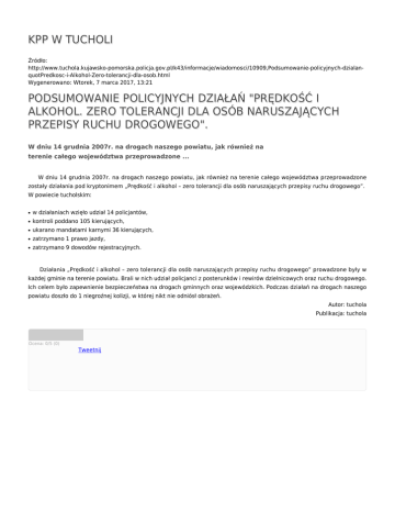 KPP W TUCHOLI Źródło: http://www.tuchola.kujawsko-pomorska.policja.gov.pl/k43/informacje/wiadomosci/10909,Podsumowanie-policyjnych-dzialanquotPredkosc-i-Alkohol-Zero-tolerancji-dla-osob.html Wygenerowano: Wtorek, 7 marca 2017, 13:21 PODSUMOWANIE POLICYJNYCH DZIAŁAŃ "PRĘDKOŚĆ I ALKOHOL. ZERO TOLERANCJI DLA OSÓB NARUSZAJĄCYCH PRZEPISY RUCHU DROGOWEGO". W dniu 14 grudnia 2007r. na drogach naszego powiatu, jak również na terenie całego województwa przeprowadzone ... W dniu 14 grudnia 2007r. na drogach naszego powiatu, jak również na terenie całego województwa przeprowadzone zostały działania pod kryptonimem „Prędkość i alkohol – zero tolerancji dla osób naruszających przepisy ruchu drogowego”. W powiecie tucholskim: ● w działaniach wzięło udział 14 policjantów, ● kontroli poddano 105 kierujących, ● ukarano mandatami karnymi 36 kierujących, ● zatrzymano 1 prawo jazdy, ● zatrzymano 9 dowodów rejestracyjnych. Działania „Prędkość i alkohol – zero tolerancji dla osób naruszających przepisy ruchu drogowego” prowadzone były w każdej gminie na terenie powiatu. Brali w nich udział policjanci z posterunków i rewirów dzielnicowych oraz ruchu drogowego. Ich celem było zapewnienie bezpieczeństwa na drogach gminnych oraz wojewódzkich. Podczas działań na drogach naszego powiatu doszło do 1 niegroźnej kolizji, w której nikt nie odniósł obrażeń. Autor: tuchola Publikacja: tuchola Ocena: 0/5 (0) Tweetnij