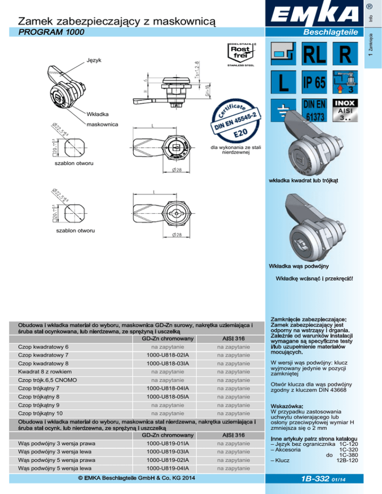 ® ProGrAM 1000 Beschlagteile Język Wkładka maskownica dla wykonania ze stali nierdzewnej szablon otworu wkładka kwadrat lub trójkąt szablon otworu Wkładka wąs podwójny Wkładkę wcisnąć i przekręcić! obudowa i wkładka materiał do wyboru, maskownica GD-Zn surowy, nakrętka uziemiająca i śruba stal ocynkowana, lub nierdzewna, ze sprężyną i usczelką GD-Zn chromowany AISI 316 Czop kwadratowy 6 na zapytanie na zapytanie Czop kwadratowy 7 1000-U818-02IA na zapytanie Czop kwadratowy 8 1000-U818-03IA na zapytanie Kwadrat 8 z rowkiem na zapytanie na zapytanie Czop trójk.6,5 CNoMo na zapytanie na zapytanie Czop trójkątny 7 1000-U818-04IA na zapytanie Czop trójkątny 8 1000-U818-05IA na zapytanie Czop trójkątny 9 na zapytanie na zapytanie Czop trójkątny 10 na zapytanie na zapytanie obudowa i wkładka materiał do wyboru, maskownica stal nierdzewna, nakrętka uziemiająca i śruba stal ocynk. lub nierdzewna, ze sprężyną i uszczelką GD-Zn chromowany AISI 316 Wąs podwójny 3 wersja prawa 1000-U819-01IA na zapytanie Wąs podwójny 3 wersja lewa 1000-U819-03IA na zapytanie Wąs podwójny 5 wersja prawa 1000-U819-02IA na zapytanie Wąs podwójny 5 wersja lewa 1000-U819-04IA na zapytanie © EMKA Beschlagteile GmbH & Co. KG 2014 Zamknięcie zabezpieczające: Zamek zabezpieczający jest odporny na wstrząsy i drgania. Zależnie od warunków instalacji wymagane są specyficzne testy i/lub uzupełnienie materiałów mocujących. W wersji wąs podwójny: klucz wyjmowany jedynie w pozycji zamkniętej otwór klucza dla wąs podwójny zgodny z kluczem DIN 43668 Wskazówka: W przypadku zastosowania uchwytu otwierającego lub osłony przeciwpyłowej wymiar H zmniejsza się o 2 mm Inne artykuły patrz strona katalogu ‒ Język bez ogranicznika 1C-120 ‒ Akcesoria 1C-320 do 1C-380 ‒ Klucz 12B-120 1B-332 01/14 1 Zamknięcia Info Zamek zabezpieczający z maskownicą