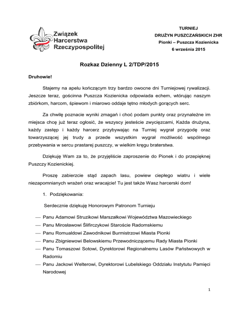 TURNIEJ DRUŻYN PUSZCZAŃSKICH ZHR Pionki – Puszcza Kozienicka 6 września 2015 Rozkaz Dzienny L 2/TDP/2015 Druhowie! Stajemy na apelu kończącym trzy bardzo owocne dni Turniejowej rywalizacji. Jeszcze teraz, gościnna Puszcza Kozienicka odpowiada echem, wtórując naszym zbiórkom, harcom, śpiewom i miarowo oddaje tętno młodych gorących serc. Za chwilę poznacie wyniki zmagań i choć podam punkty oraz przynależne im miejsca chcę już teraz ogłosić, że wszyscy jesteście zwycięzcami, Każda drużyna, każdy zastęp i każdy harcerz przybywając na Turniej wygrał przygodę oraz towarzyszącej jej trudy a przede wszystkim wygrał możliwość wspólnego przebywania w sercu prastarej puszczy, w wielkim kręgu braterstwa. Dziękuję Wam za to, że przyjęliście zaproszenie do Pionek i do przepięknej Puszczy Kozienickiej. Proszę zabierzcie stąd zapach lasu, powiew ciepłego wiatru i wiele niezapomnianych wrażeń oraz wracajcie! Tu jest także Wasz harcerski dom! 1. Podziękowania: Serdecznie dziękuję Honorowym Patronom Turnieju Panu Adamowi Struzikowi Marszałkowi Województwa Mazowieckiego Panu Mirosławowi Ślifirczykowi Staroście Radomskiemu Panu Romualdowi Zawodnikowi Burmistrzowi Miasta Pionki Panu Zbigniewowi Belowskiemu Przewodniczącemu Rady Miasta Pionki Panu Tomaszowi Sotowi, Dyrektorowi Regionalnemu Lasów Państwowych w Radomiu Panu Jackowi Welterowi, Dyrektorowi Lubelskiego Oddziału Instytutu Pamięci Narodowej 1 Gorąco dziękuję, Miastu Pionki, Nadleśnictwu Kozienice, SP ZOZ w Pionkach. OSP w Pionkach, JRG PSP w Pionkach, za życzliwe wsparcie organizacyjno logistyczne, bez którego trudno by nam było zorganizować tak wielka imprezę. - Wielkie podziękowanie kieruję też do naszych sponsorów: Firm „Iglotex”, „QFG”, „Campeon”, Spółki „Obory”. Niezależnemu Wydawnictwu Harcerskiemu oraz Wydawnictwu ZHR za wsparcie rzeczowe i materialne. Dziękuję też patronom medialnym: „Gość Niedzielny– Ave Gość Radomski”, „Echo Dnia”, „Pionki24.pl” „Riposta – Pionki” , „Nad Zagoźdżonką”, TVP – Warszawa. To Państwa obecność i Państwa piękne relacje w znaczący sposób przyczyniły się do zbudowania ciepłego wizerunku naszego Turnieju i miejsca, w którym się odbywał. - Na koniec najserdeczniejsze podziękowania kieruję do moich współpracowników instruktorek i instruktorów, wędrowniczek i wędrowników, starszych harcerek i starszych harcerzy, rodziców i przyjaciół pionkowskiego ZHR za rady, pracę i wszelkie wsparcie. 2. Klasyfikacja Turnieju Drużyn Puszczańskich 2015 63 Gdyńska Drużyna Harcerzy 1 im. mjr. Hieronima Dekutowskiego „Zapory” 78,5 2 41 Pionkowska Drużyna Harcerzy „Zarzewie” im. Andrzeja Małkowskiego" 70,6 3 8 Szczecińska Drużyna Harcerzy „Płomień” im. Andrzeja i Jana Romockich 67,1 4 16 Warszawska Drużyna Harcerzy „Grunwald” im. Zawiszy Czarnego 64,6 5 12 Lubelska Drużyna Harcerzy „Bractwo” im. Braci herbu Sulima 63,6 6 2 Poznańska Drużyna Harcerzy „Czantoria” im. Ppor. Hm. Tadeusza Zawadzkiego 7 2 Mazowiecka Drużyna Harcerzy „Oleandry” im. Marsz. Józefa Piłsudskiego 61,3 8 3 Podgórska Drużyna Harcerzy „Wilki” im. Stanisława Mitko 57,0 9 28 Łódzka Drużyna Harcerzy im. Antoniego Olbromskiego 52,9 62,9 10 7 Krakowska Drużyna Harcerzy im. Hm. Tadeusza Boya „KOMANDOSY” 52,3 11 7 Poznańska Drużyna Harcerzy „Binduga” im. Hm. Floriana Marciniaka 52,0 2 12 36 Gdyńska Drużyna Harcerzy im. hm. Lucjana Cylkowskiego 45,0 13 9 Swarzędzka Drużyna Harcerzy „Echo Puszczy” im. Andrzeja Małkowskiego 41,9 14 1 Beskidzka Drużyna Harcerzy „Szara” im. Aleksego Dawidowskiego 37,8 15 3 Pruska Drużyna Harcerzy „Gniazdo” 36,9 16 1 Pionkowska Drużyna Harcerzy „Czarna Jedynka” im. Józefa Piłsudskiego 34,3 17 35 Drużyna Harcerzy Leśnych „Watra” im. Kazimierza Wielkiego 33,5 18 7 Bydgoska Drużyny Harcerzy „Nadzieja” 29,8 Drużyny Niesklasyfikowane 265 Warszawska Lotnicza Drużyna Harcerzy „Skrzydła” im. Baonu „Parasol” 57,7 52,6 44 Warszawska Drużyna Harcerzy „Stanica” 301 Warszawska Drużyna Harcerzy „Knieja” im. Rtm. Witolda Pileckiego 22 Warszawska Drużyna Harcerzy „Płowce” im. Króla Władysława Łokietka 1 Ursynowska Drużyna Harcerzy „Żagiew” im. Janka Bytnara 3S. Rudy 123 Warszawska Drużyna Harcerzy im. Zgrupowania AK „Chrobry II” 50,0 49,2 46,6 17,2 Czuwaj! Komendant Turnieju Drużyn Puszczańskich 2015 /-/phm. Krzysztof Michał Piaseczny HR 3