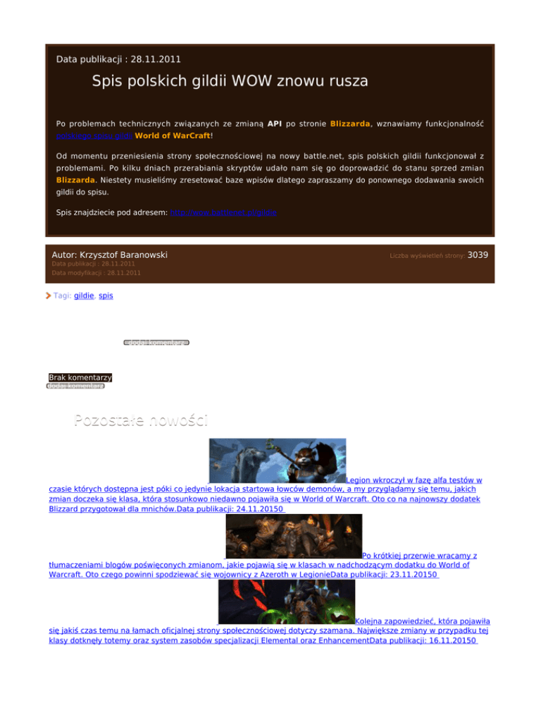 Data publikacji : 28.11.2011 Spis polskich gildii WOW znowu rusza Po problemach technicznych związanych ze zmianą API po stronie Blizzarda, wznawiamy funkcjonalność polskiego spisu gildii World of WarCraft! Od momentu przeniesienia strony społecznościowej na nowy battle.net, spis polskich gildii funkcjonował z problemami. Po kilku dniach przerabiania skryptów udało nam się go doprowadzić do stanu sprzed zmian Blizzarda. Niestety musieliśmy zresetować baze wpisów dlatego zapraszamy do ponownego dodawania swoich gildii do spisu. Spis znajdziecie pod adresem: http://wow.battlenet.pl/gildie Autor: Krzysztof Baranowski Liczba wyświetleń strony: 3039 Data publikacji : 28.11.2011 Data modyfikacji : 28.11.2011 Tagi: gildie, spis Komentarz (0) dodaj komentarz Brak komentarzy dodaj komentarz Pozostałe nowości Zapowiedź zmian w klasach - Mnich Legion wkroczył w fazę alfa testów w czasie których dostępna jest póki co jedynie lokacja startowa łowców demonów, a my przyglądamy się temu, jakich zmian doczeka się klasa, która stosunkowo niedawno pojawiła się w World of Warcraft. Oto co na najnowszy dodatek Blizzard przygotował dla mnichów.Data publikacji: 24.11.20150 Zapowiedź zmian w klasach - Wojownik Po krótkiej przerwie wracamy z tłumaczeniami blogów poświęconych zmianom, jakie pojawią się w klasach w nadchodzącym dodatku do World of Warcraft. Oto czego powinni spodziewać się wojownicy z Azeroth w LegionieData publikacji: 23.11.20150 Zapowiedź zmian w klasach - Szaman Kolejna zapowiedzieć, która pojawiła się jakiś czas temu na łamach oficjalnej strony społecznościowej dotyczy szamana. Największe zmiany w przypadku tej klasy dotknęły totemy oraz system zasobów specjalizacji Elemental oraz EnhancementData publikacji: 16.11.20150 11 urodziny World of Warcraft World of Warcraft obchodzi już swoje 11 urodziny. Z tej okazji Blizzard przygotował kilka zabawek, które powinny wszystkim przypomnieć sam początek przygody w świecie Azeroth - w rolach głównych Edwin VanCleef, Hogger, murlok oraz Windfury (w wersji nadmuchiwanej).Data publikacji: 16.11.20150 Zapowiedź zmian w klasach - Rycerz śmierci Kolejna zapowiedź opublikowana na łamach oficjalnej strony społecznościowej World of Warcraft poświęcona jest klasie rycerzy śmierci. Poniżej znajdziecie informacje między innymi o ujednoliceniu wszystkich run oraz nowej umiejętności specjalizacji Blood, która została zainspirowana Lordem Marrowgarem z Icecrown Citadel.Data publikacji: 15.11.20150 Wszystkie nowości