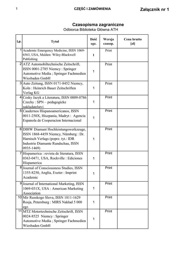 CZĘŚĆ I ZAMÓWIENIA 1 Załącznik nr 1 Czasopisma zagraniczne Odbiorca Biblioteka Główna ATH Lp. Tytuł Ilość egz. 1 Academic Emergency Medicine, ISSN 1069- 6563, USA, Malden: Wiley-Blackwell Publishing Print 1 2 ATZ Automobiltechnische Zeitschrift, ISSN 0001-2785 Niemcy : Springer Automotive Media ; Springer Fachmedien Wiesbaden GmbH 3 Auto Zeitung, ISSN 0171-8452 Niemcy, Koln : Heinrich Bauer Zeitschriften Verlag KG 4 Cesky Jazyk a Literatura, ISSN 0009-0786 Czechy : SPN – pedagogicke nakladatelstvi 5 Caudernos Hispanoamericanos, ISSN 0011-250X, Hiszpania, Madryt : Agencia Espanola de Cooperacion Internacional Print 1 Print 1 Print 1 Print 1 6 DIHW Diamant Hochleistungswerkzeuge, ISSN 1868-4459 Niemcy, Nürnberg : Dr. Harnisch Verlags (poprz. tyt.: IDR Industrie Diamante Rundschau, ISSN 0935-1469) 7 Hispamerica : revista de literatura, ISSN 0363-0471, USA, Rockville : Ediciones Hispamerica 8 Journal of Consciousness Studies, ISSN 1355-8250, Anglia, Exeter : Imprint Academic Print 1 Print 1 Print 1 9 Journal of International Marketing, ISSN 1069-031X, USA : American Marketing Association 10 Mir Russkogo Slova, ISSN 1811-1629 Rosja, Petersburg : MIRS Nakład 5 000 egz. 11 MTZ Motortechnische Zeitschrift, ISSN 0024-8525 Niemcy : Springer Automotive Media ; Springer Fachmedien Wiesbaden GmbH Wersja czasop. Print 1 Print 1 Print 1 Cena brutto [zł] CZĘŚĆ I ZAMÓWIENIA 2 12 New Literary History, ISSN 0028-6087 USA : The John Hopkins University Press Print 1 13 Newsweek. The International Magazine, ISSN 0163-7053 USA : Newsweek Inc. 14 15 16 17 18 19 Novi Izraz, ISSN 1512-5335 BosniaHercegovina : PEN Centar BosneHercegovine Productivita a Inovacie. Dvojmesacnik Slovenskeho centra produktivity v Zilinie, ISSN 1335-5961 Słowacja : Slovenske centrum produktivity Quality Management Journal, ISSN 10686967 USA : American Society for Quality Revista de Crítica Literaria Latinoamericana, ISSN: 0252-8843 USA Medford : RCLL/Tufts University Departament of Romance Languages Russkij Jazyk za Rubezom, ISSN 0131615X. Indeks 70792 Rosja : OOO EUROCONSTRUCTION. Nakład 1 500 egz. Time ISSN 0928-8430 Holandia : Time Warner Publishing B.V. Print 1 Print 1 Print 1 Print 1 Print 1 Print 1 Print 1 20 Water Environment Research, ISSN 1061- 4303 USA : Water Environment Federation Print 1 21 Water Environment Research, eISSN 1554- 22 Załącznik nr 1 On-line 7531 - dopłata do "online" 1 Werkstatt und Betrieb, ISSN 0043-2792 Niemcy : Carl Hanser Verlag 1 Print +Free Online Wartość brutto [zł] (suma cen brutto) zw. wartością ofertową brutto Wartość netto [zł] (suma cen netto) zw. wartością ofertową netto ………………. ………………………………… Data …………………………………… Podpis osob uprawnionych o składania oświadczeń woli w imieniu Wykonawcy 3 CZĘŚĆ I ZAMÓWIENIA Załącznik nr 1 Wykonawcy 4 CZĘŚĆ I ZAMÓWIENIA Załącznik nr 1