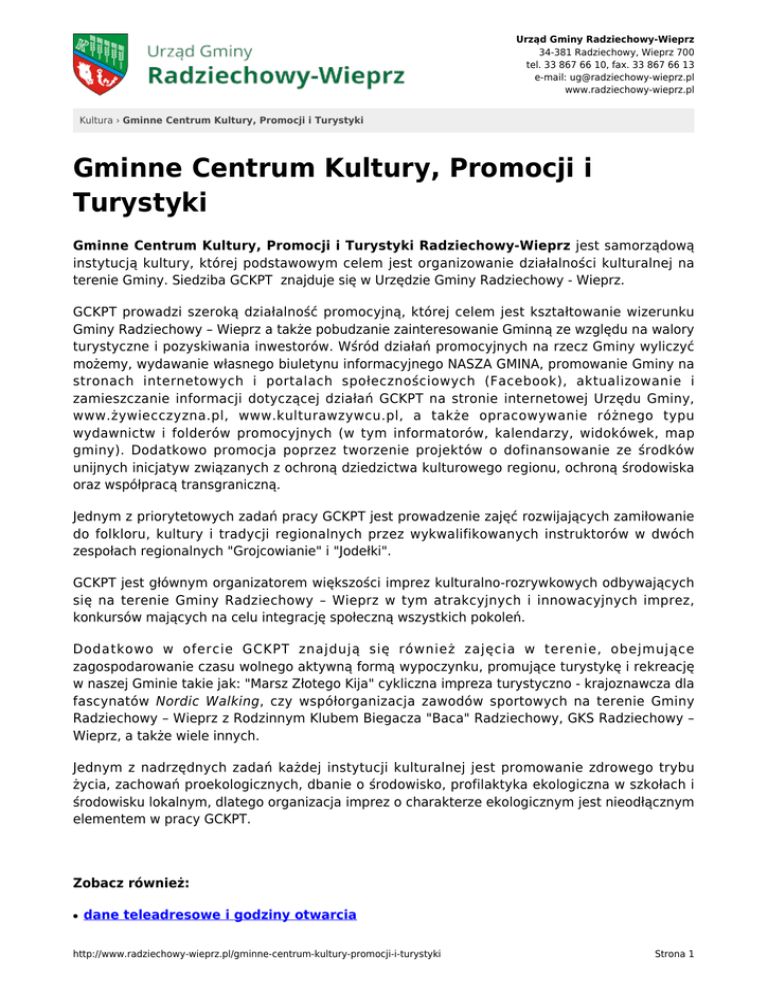 Urząd Gminy Radziechowy-Wieprz 34-381 Radziechowy, Wieprz 700 tel. 33 867 66 10, fax. 33 867 66 13 e-mail: [email protected] www.radziechowy-wieprz.pl Kultura › Gminne Centrum Kultury, Promocji i Turystyki Gminne Centrum Kultury, Promocji i Turystyki Gminne Centrum Kultury, Promocji i Turystyki Radziechowy-Wieprz jest samorządową instytucją kultury, której podstawowym celem jest organizowanie działalności kulturalnej na terenie Gminy. Siedziba GCKPT znajduje się w Urzędzie Gminy Radziechowy - Wieprz. GCKPT prowadzi szeroką działalność promocyjną, której celem jest kształtowanie wizerunku Gminy Radziechowy – Wieprz a także pobudzanie zainteresowanie Gminną ze względu na walory turystyczne i pozyskiwania inwestorów. Wśród działań promocyjnych na rzecz Gminy wyliczyć możemy, wydawanie własnego biuletynu informacyjnego NASZA GMINA, promowanie Gminy na stronach internetowych i portalach społecznościowych (Facebook), aktualizowanie i zamieszczanie informacji dotyczącej działań GCKPT na stronie internetowej Urzędu Gminy, www.żywiecczyzna.pl, www.kulturawzywcu.pl, a także opracowywanie różnego typu wydawnictw i folderów promocyjnych (w tym informatorów, kalendarzy, widokówek, map gminy). Dodatkowo promocja poprzez tworzenie projektów o dofinansowanie ze środków unijnych inicjatyw związanych z ochroną dziedzictwa kulturowego regionu, ochroną środowiska oraz współpracą transgraniczną. Jednym z priorytetowych zadań pracy GCKPT jest prowadzenie zajęć rozwijających zamiłowanie do folkloru, kultury i tradycji regionalnych przez wykwalifikowanych instruktorów w dwóch zespołach regionalnych "Grojcowianie" i "Jodełki". GCKPT jest głównym organizatorem większości imprez kulturalno-rozrywkowych odbywających się na terenie Gminy Radziechowy – Wieprz w tym atrakcyjnych i innowacyjnych imprez, konkursów mających na celu integrację społeczną wszystkich pokoleń. Dodatkowo w ofercie GCKPT znajdują się również zajęcia w terenie, obejmujące zagospodarowanie czasu wolnego aktywną formą wypoczynku, promujące turystykę i rekreację w naszej Gminie takie jak: "Marsz Złotego Kija" cykliczna impreza turystyczno - krajoznawcza dla fascynatów Nordic Walking, czy współorganizacja zawodów sportowych na terenie Gminy Radziechowy – Wieprz z Rodzinnym Klubem Biegacza "Baca" Radziechowy, GKS Radziechowy – Wieprz, a także wiele innych. Jednym z nadrzędnych zadań każdej instytucji kulturalnej jest promowanie zdrowego trybu życia, zachowań proekologicznych, dbanie o środowisko, profilaktyka ekologiczna w szkołach i środowisku lokalnym, dlatego organizacja imprez o charakterze ekologicznym jest nieodłącznym elementem w pracy GCKPT. Zobacz również: ● dane teleadresowe i godziny otwarcia http://www.radziechowy-wieprz.pl/gminne-centrum-kultury-promocji-i-turystyki Strona 1 Urząd Gminy Radziechowy-Wieprz 34-381 Radziechowy, Wieprz 700 tel. 33 867 66 10, fax. 33 867 66 13 e-mail: [email protected] www.radziechowy-wieprz.pl Kultura › Gminne Centrum Kultury, Promocji i Turystyki ● profil facebook http://www.radziechowy-wieprz.pl/gminne-centrum-kultury-promocji-i-turystyki Strona 2