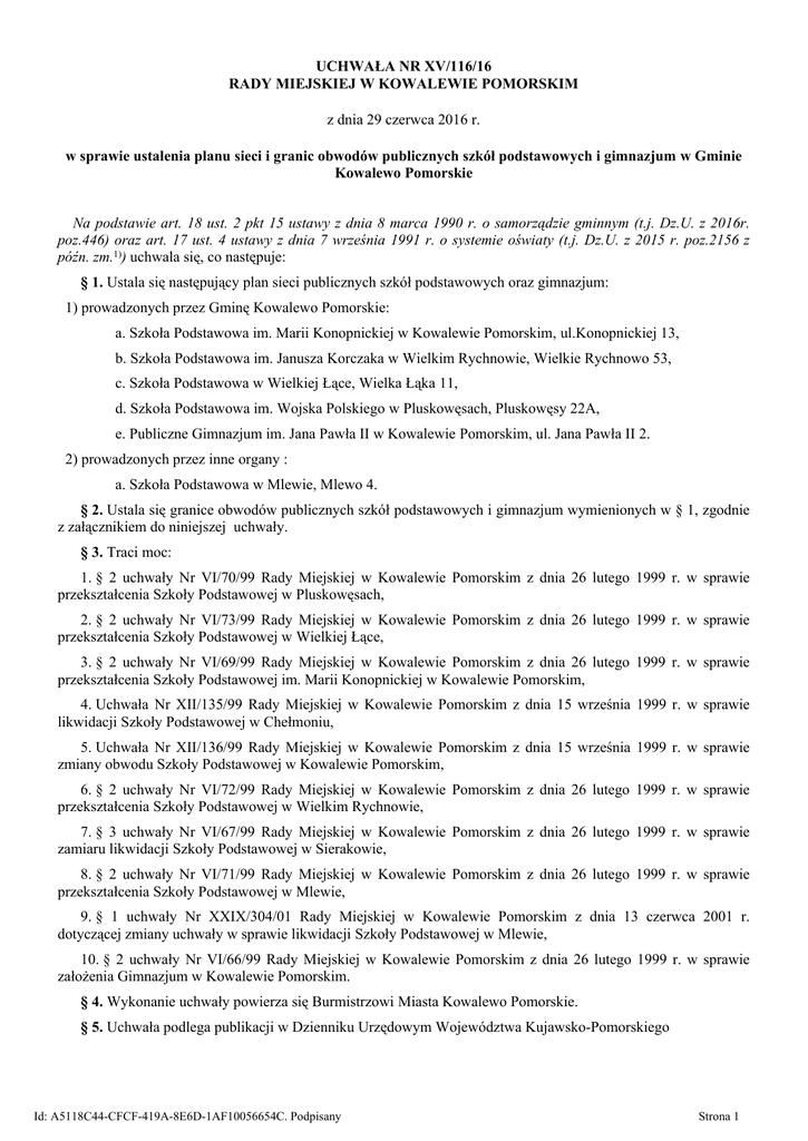 UCHWAŁA NR XV/116/16 RADY MIEJSKIEJ W KOWALEWIE POMORSKIM z dnia 29 czerwca 2016 r. w sprawie ustalenia planu sieci i granic obwodów publicznych szkół podstawowych i gimnazjum w Gminie Kowalewo Pomorskie Na podstawie art. 18 ust. 2 pkt 15 ustawy z dnia 8 marca 1990 r. o samorządzie gminnym (t.j. Dz.U. z 2016r. poz.446) oraz art. 17 ust. 4 ustawy z dnia 7 września 1991 r. o systemie oświaty (t.j. Dz.U. z 2015 r. poz.2156 z późn. zm.1)) uchwala się, co następuje: § 1. Ustala się następujący plan sieci publicznych szkół podstawowych oraz gimnazjum: 1) prowadzonych przez Gminę Kowalewo Pomorskie: a. Szkoła Podstawowa im. Marii Konopnickiej w Kowalewie Pomorskim, ul.Konopnickiej 13, b. Szkoła Podstawowa im. Janusza Korczaka w Wielkim Rychnowie, Wielkie Rychnowo 53, c. Szkoła Podstawowa w Wielkiej Łące, Wielka Łąka 11, d. Szkoła Podstawowa im. Wojska Polskiego w Pluskowęsach, Pluskowęsy 22A, e. Publiczne Gimnazjum im. Jana Pawła II w Kowalewie Pomorskim, ul. Jana Pawła II 2. 2) prowadzonych przez inne organy : a. Szkoła Podstawowa w Mlewie, Mlewo 4. § 2. Ustala się granice obwodów publicznych szkół podstawowych i gimnazjum wymienionych w § 1, zgodnie z załącznikiem do niniejszej uchwały. § 3. Traci moc: 1. § 2 uchwały Nr VI/70/99 Rady Miejskiej w Kowalewie Pomorskim z dnia 26 lutego 1999 r. w sprawie przekształcenia Szkoły Podstawowej w Pluskowęsach, 2. § 2 uchwały Nr VI/73/99 Rady Miejskiej w Kowalewie Pomorskim z dnia 26 lutego 1999 r. w sprawie przekształcenia Szkoły Podstawowej w Wielkiej Łące, 3. § 2 uchwały Nr VI/69/99 Rady Miejskiej w Kowalewie Pomorskim z dnia 26 lutego 1999 r. w sprawie przekształcenia Szkoły Podstawowej im. Marii Konopnickiej w Kowalewie Pomorskim, 4. Uchwała Nr XII/135/99 Rady Miejskiej w Kowalewie Pomorskim z dnia 15 września 1999 r. w sprawie likwidacji Szkoły Podstawowej w Chełmoniu, 5. Uchwała Nr XII/136/99 Rady Miejskiej w Kowalewie Pomorskim z dnia 15 września 1999 r. w sprawie zmiany obwodu Szkoły Podstawowej w Kowalewie Pomorskim, 6. § 2 uchwały Nr VI/72/99 Rady Miejskiej w Kowalewie Pomorskim z dnia 26 lutego 1999 r. w sprawie przekształcenia Szkoły Podstawowej w Wielkim Rychnowie, 7. § 3 uchwały Nr VI/67/99 Rady Miejskiej w Kowalewie Pomorskim z dnia 26 lutego 1999 r. w sprawie zamiaru likwidacji Szkoły Podstawowej w Sierakowie, 8. § 2 uchwały Nr VI/71/99 Rady Miejskiej w Kowalewie Pomorskim z dnia 26 lutego 1999 r. w sprawie przekształcenia Szkoły Podstawowej w Mlewie, 9. § 1 uchwały Nr XXIX/304/01 Rady Miejskiej w Kowalewie Pomorskim z dnia 13 czerwca 2001 r. dotyczącej zmiany uchwały w sprawie likwidacji Szkoły Podstawowej w Mlewie, 10. § 2 uchwały Nr VI/66/99 Rady Miejskiej w Kowalewie Pomorskim z dnia 26 lutego 1999 r. w sprawie założenia Gimnazjum w Kowalewie Pomorskim. § 4. Wykonanie uchwały powierza się Burmistrzowi Miasta Kowalewo Pomorskie. § 5. Uchwała podlega publikacji w Dzienniku Urzędowym Województwa Kujawsko-Pomorskiego Id: A5118C44-CFCF-419A-8E6D-1AF10056654C. Podpisany Strona 1 i wchodzi w życie z dniem 1 września 2016 r. Przewodniczący Rady Jerzy Orłowski 1) Zmiany w ustawie – z 2014 r. poz. 7, z 2015 r. poz. 357, 1045, 1418, 1629, z 2016 r. poz. 35, 64, 195, 668. Id: A5118C44-CFCF-419A-8E6D-1AF10056654C. Podpisany Strona 2 Załącznik do Uchwały Nr XV/116/16 Rady Miejskiej w Kowalewie Pomorskim z dnia 29 czerwca 2016 r. Granice obwodów publicznych szkół podstawowych i gimnazjum w Gminie Kowalewo Pomorskie. 1. Obwód Szkoły Podstawowej im. Marii Konopnickiej w Kowalewie Pomorskim obejmuje miejscowości: Bielsk, Borek, Chełmonie, Chełmoniec, Gapa, Kowalewo Pomorskie, Lipienica, Martyniec, Podborek, Sierakowo, Szychowo, Zapluskowęsy. 2. Obwód Szkoły Podstawowej im. Janusza Korczaka w Wielkim Rychnowie obejmuje miejscowości: Borówno – część od strony Wielkiego Rychnowa do „krzyża”, Mariany, Mlewiec z posesjami nr 20, 21, 22, 23, 24, Nowy Dwór, Wielkie Rychnowo, a ponadto w zakresie klas IV-VI obwód rozszerza się o miejscowości Mlewiec z pominięciem posesji nr 20, 21, 22, 23, 24, Mlewo, Srebrniki, Srebrniki Lądy. 3. Obwód Szkoły Podstawowej w Wielkiej Łące obejmuje miejscowości: Borówno- część od strony Wielkiej Łąki do „krzyża”, Elzanowo, Józefat, Pruska Łąka, Szewa, Wielka Łąka. 4. Obwód Szkoły Podstawowej im. Wojska Polskiego w Pluskowęsach obejmuje następujące miejscowości : Dylewo, Frydrychowo, Kiełpiny, Napole, Otoruda, Piątkowo, Pluskowęsy. 5. Obwód Szkoły Podstawowej w Mlewie w zakresie klas I-III obejmuje miejscowości: Mlewiec z pominięciem posesji nr 20, 21, 22, 23, 24, Mlewo, Srebrniki, Srebrniki Lądy. 6. Obwód Publicznego Gimnazjum im. Jana Pawła II w Kowalewie Pomorskim obejmuje miejscowości: Bielsk, Borek, Borówno, Chełmonie, Chełmoniec, Dylewo, Elzanowo, Frydrychowo, Gapa, Józefat, Kiełpiny, Kowalewo Pomorskie, Lipienica, Mariany, Martyniec, Mlewiec, Mlewo, Napole, Nowy Dwór, Otoruda, Piątkowo, Pluskowęsy, Podborek, Pruska Łąka, Sierakowo, Srebrniki, Srebrniki Lądy, Szewa, Szychowo, Wielka Łąka, Wielkie Rychnowo, Zapluskowęsy. Id: A5118C44-CFCF-419A-8E6D-1AF10056654C. Podpisany Strona 1 Uzasadnienie Na podstawie art. 17 ust. 4 ustawy z dnia 7 września 1991 r. o systemie oświaty rada gminy została zobowiązana do ustalenia planu sieci publicznych szkół podstawowych i gimnazjów prowadzonych przez gminę, a także do określenia granic obwodów publicznych szkół podstawowych i gimnazjów mających siedzibę na jej terenie. Dotychczas sieć szkolna nie była ujęta w jednej uchwale. Indywidualne akty określały granice obwodów poszczególnych szkół. Zasadne jest zatem ujęcie przedmiotowego zagadnienia w ramach jednego aktu. Powyższa uchwała ma charakter głównie porządkujący. Jedyna zmiana dotyczy przekształcenia obwodu Szkoły Podstawowej w Mlewie. Miejscowość Sierakowo przypisana dotychczas do granic jej obwodu została włączona do o