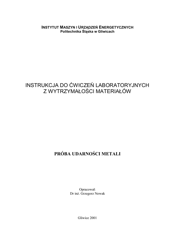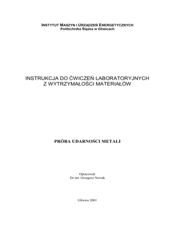 INSTYTUT MASZYN I URZĄDZEŃ ENERGETYCZNYCH Politechnika Śląska w Gliwicach INSTRUKCJA DO ĆWICZEŃ LABORATORYJNYCH Z WYTRZYMAŁOŚCI MATERIAŁÓW PRÓBA UDARNOŚCI METALI Opracował: Dr inż. Grzegorz Nowak Gliwice 2001 1. Wprowadzenie Materiały, z których wykonane są elementy maszyn i konstrukcji podlegają rożnego rodzaju obciążeniom. Obciążenia te mogą mieć charakter statyczny bądź dynamiczny. W przypadku kiedy obciążenie zewnętrzne działające na dany element konstrukcyjny narasta powoli (z małą prędkością) od zera do wartości maksymalnej to mamy do czynienia z obciążeniem statycznym. Jeżeli zaś obciążenie narasta z dużą prędkością to mówimy o obciążeniu dynamicznym. Charakter obciążenia istotnie wpływa na własności wytrzymałościowe materiałów co pociąga za sobą konieczność badań zachowania się materiałów przy statycznym i dynamicznym wzroście obciążenia. Wzrost prędkości obciążenia prowadzi do podniesienia wartości granicy plastyczności i wytrzymałości materiału. Ponadto obserwuje się przesuniecie maksimum obciążenia w kierunku odkształceń sprężystych czyli zmniejszają się obserwowane odkształcenia plastyczne. Jest to wynikiem zahamowania mechanizmów plastycznego płynięcia materiału przy wzrastających prędkościach odkształcenia, czyli przy obciążeniach dynamicznych. Ze względu na wspomnianą odrębność zachowania się materiałów przy obciążeniach statycznych i dynamicznych przeprowadza się odrębne badania materiałowe. Dla celów określenia własności materiału przy dużych prędkościach odkształcenia przeprowadza się próby udarnościowe. Mogą to być próby udarnościowe na rozciąganie, ściskanie, skręcanie czy wreszcie na zginanie. Obecnie najbardziej rozpowszechniona jest próba udarowego zginania. Polega ona na złamaniu próbki przy jednorazowym uderzeniu. Próbę udarności wykonuje się na urządzeniu zwanym młotem udarowym. Jest to tzw. młot udarowy Charpy’ego, zaś przeprowadzana próba udarowego zginania nosi nazwę próby Charpy’ego. 2. Działanie młota udarowego. Działanie młota udarowego opiera się na wykorzystaniu energii opadającego wahadła, które uderza w badaną próbkę. W zależności od badanych materiałów wykorzystuje się wahadła o różnej energii (masie). W przypadku badania metali energia ta wynosi zwykle 300J. Wykorzystanie takiego sposobu obciążania próbek pozwala na osiąganie prędkości odkształcenia materiału do 10m/s. Przeliczając to na czas potrzebny do zniszczenia próbki uzyskujemy 0.001 do 0.01s w zależności od badanego materiału (większy dla materiałów plastycznych, mniejszy dla kruchych). Głównymi elementami młota udarowego Charpy’ego są: korpus wahadło przypory wskaźnik pomiaru energii złamania / kąta odchylenia wahadła. Na wyposażeniu laboratorium znajduje się młot udarowy firmy Roel/Amsler. Jest on zaopatrzony w wahadło o energii początkowej 300 J. Podnoszenie wahadła do pozycji wyjściowej odbywa się przy pomocy silnika elektrycznego i w tej pozycji jest ono blokowane zamkiem elektromagnetycznym. Zwolnienie wahadła odbywa się na drodze elektrycznej poprzez naciśnięcie przycisku START. Uruchomienie urządzenia powoduje opadanie młota na drodze którego znajduje się zamocowana na stoliku próbka. Uderzenie powoduje złamanie próbki. Zniszczenie próbki nie powoduje całej utraty energii wahadła, które swobodnie odchyla się do pozycji maksymalnej po czym jest przy pomocy hamulca elektromagnetycznego zatrzymywane, a następnie podnoszone do pozycji wyjściowej. Odchylenie wahadła po złamaniu próbki jest rejestrowane przy pomocy wskaźnika zegarowego wyskalowanego w jednostkach energii oraz stopniach kątowych. 3. Badanie Próba udarności polega na złamaniu jednym uderzeniem spadającego młota wahadłowego próbki z karbem w środku i podpartej obydwoma końcami. Energia zużyta na złamanie próbki wyrażona jest w dżulach i jest ona miarą udarności badanego materiału. Próbki do badań udarności określone są poprzez odpowiednie normy. Standardowa próbka powinna mieć długość 55 mm oraz przekrój kwadratowy 10x10 mm. W połowie długości próbki znajduje się jeden z dwu rodzajów karbów: karb w kształcie litery V o kącie 45° i głębokości 2 mm. Promień zaokrąglenia dna wynosi 0.25 mm 10 2 55 45° karb w kształcie litery U o głębokości 5 mm i promieniu zaokrąglenia dna 1 mm 5 10 55 2 Omówione próbki powinny być obrobione mechanicznie. Standardowe badanie powinno odbywać się przy początkowej energii maszyny 300 ± 10 J przy zastosowaniu próbki o standardowych wymiarach. Energię zużytą na złamanie próbki oznacza się: KU dla próbki z karbem U KV dla próbki z karbem V Podczas badania próbka powinna leżeć na podporach w taki sposób, aby odległość płaszczyzny symetrii karbu (środka karbu) od płaszczyzny symetrii podpór była nie większa niż 0.5 mm. Uderzenie młota następuje po przeciwnej stronie karbu, który jest inicjatorem pęknięcia. Temperatura w czasie badania powinna wynosić 23°C ± 5°C. Jeżeli próba ma być przeprowadzona w innej temperaturze niż pokojowej powinna być ona zanurzona w ośrodku oziębiającym bądź ogrzewającym na czas pozwalający na osiągnięcie równomiernej temperatury w całej objętości próbki (np. co najmniej 10 min w ośrodku ciekłym oraz 30 min w gazowym). Po nagrzaniu/oziębieniu próbka powinna zostać złamana w ciągu 5 sekund. Jeżeli w trakcie badania próbka nie została złamana, lecz tylko zgięta, zużyta energia nie może stanowić wyniku udarności. W czasie zniszczenia próbek mogą powstać trzy rodzaje złomu: złom kruchy – pęknięcie próbki bez wyraźnych odkształceń plastycznych złom poślizgowy – pęknięcie nastąpiło po przekroczeniu granicy plastyczności. Widoczne odkształcenia plastyczne złom z rozwarstwieniem – przełom wykazuje duże rozwarstwien