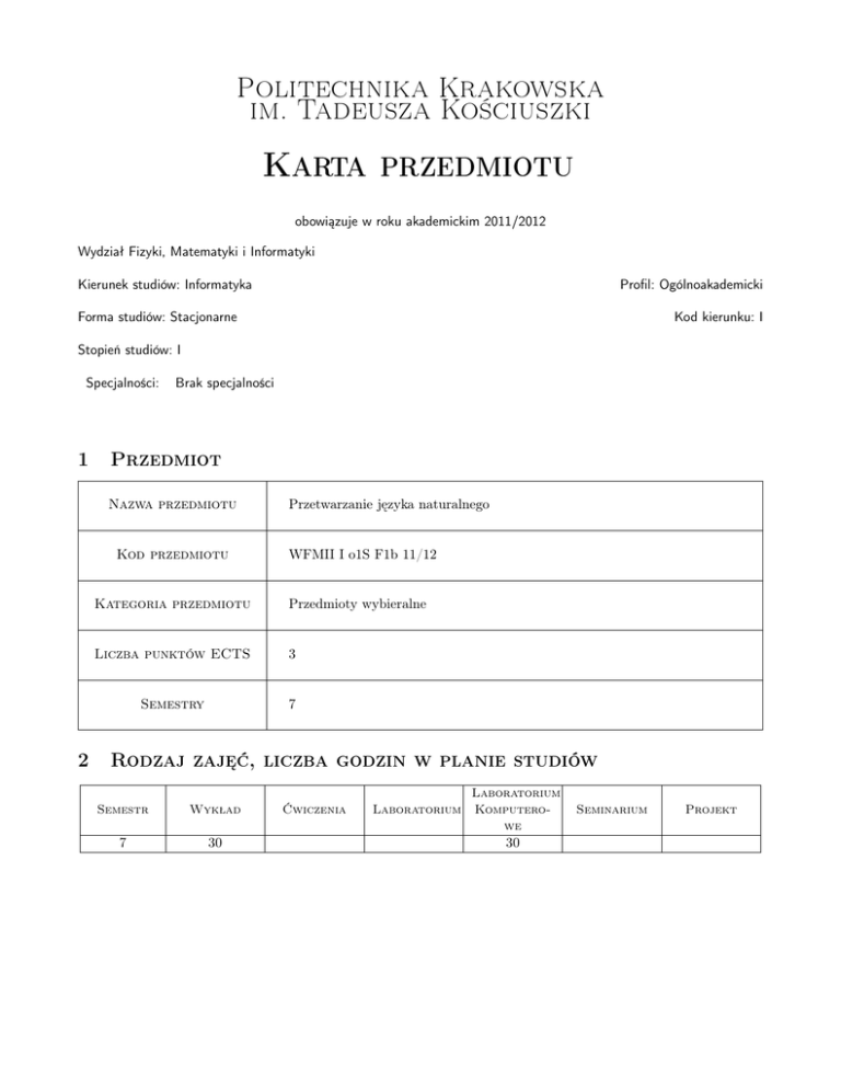 Politechnika Krakowska im. Tadeusza Kościuszki Karta przedmiotu obowiązuje w roku akademickim 2011/2012 Wydział Fizyki, Matematyki i Informatyki Kierunek studiów: Informatyka Profil: Ogólnoakademicki Forma studiów: Stacjonarne Kod kierunku: I Stopień studiów: I Specjalności: 1 Brak specjalności Przedmiot Nazwa przedmiotu Kod przedmiotu 2 Przetwarzanie języka naturalnego WFMII I o1S F1b 11/12 Kategoria przedmiotu Przedmioty wybieralne Liczba punktów ECTS 3 Semestry 7 Rodzaj zajęć, liczba godzin w planie studiów Semestr Wykład 7 30 Ćwiczenia Laboratorium Laboratorium Komputerowe 30 Seminarium Projekt Politechnika Krakowska im. Tadeusza Kościuszki 3 Cele przedmiotu Cel 1. Poznanie zagadnień związanych z przetwarzaniem dokumentów tekstowych. Cel 2. Nauka projektowania algorytmów przetwarzania dokumentów tekstowych. Cel 3. Praktyka implementacji programów do przetwarzania dokumentów tekstowych. 4 Wymaganie wstępne w zakresie wiedzy, umiejętności i innych kompetencji a. Algorytmy i struktury danych, projektowanie b. Podstawy programowania języków skryptowych (Perl) 5 Efekty kształcenia EK1. Kompetencje społeczne: Umiejętność pracy w grupie. EK2. Wiedza: Wiedza z zakresu algorytmów przetwarzania dokumentów tekstowych. EK3. Umiejętności: Umiejętność projektowania algorytmów i struktur danych do przetwarzania dokumentów tekstowych. EK4. Umiejętności: Umiejętność implementacji oprogramowania do przetwarzania dokumentów tekstowych. 6 Treści programowe Lp W1 W2 W3 W4 W5 W6 W7 W8 W9 W10 W11 W12 W13 W14 W15 Lp K1 K2 K3 K4 K5 Wykład Tematyka zajęć Opis szczegółowy bloków tematycznych Wprowadzenie do tematyki, podstawowe wiadomości wstępne Narzędzia i języki programowania w przetwarzaniu dokumentów Podstawy gramatyki języka polskiego, formalizacja języka Korpusy tekstowe, Web-crawling, ekstrakcja informacji z tekstu Analiza statystyczna tekstu w języku polskim, słowa stop i kluczowe Indeksowanie dokumentów tekstowych, wyszukiwarki internetowe Analiza leksykalna i algorytmy wyszukiwania wzorca Słowniki, automaty słownikowe, słowniki wielojęzyczne Bezkontekstowa analiza morfologiczna tekstu Kontekst tekstu, technika n-gramów Algorytmy badania podobieństwa dokumentów tekstowych Reprezentacja i przedstawianie wiedzy, generowanie tekstu Podstawy translacji maszynowej tekstu Systemy i aplikacje do przetwarzania języka naturalnego Projektowanie aplikacji do przetwarzania i zarządzania wiedzą Razem Laboratorium Komputerowe Tematyka zajęć Opis szczegółowy bloków tematycznych Wprowadzenie do języka Perl, wyrażenia regularne. Zaawansowane typy danych i ich persystencja. Parsowanie dokumentów tekstowych i analiza leksykalna. Algorytmy pozyskiwania tekstów i budowy korpusu tekstowego. Analiza statystyczna korpusu tekstowego. Strona 2/6 Liczba godzin 2 2 2 2 2 2 2 2 2 2 2 2 2 2 2 30 Liczba godzin 2 2 2 2 2 Politechnika Krakowska im. Tadeusza Kościuszki Lp K6 K7 K8 K9 K10 K11 K12 K13 K14 K15 7 Laboratorium Komputerowe Tematyka zajęć Opis szczegółowy bloków tematycznych Indekser dokumentów tekstowych, wyszukiwarka dokumentów. Automaty słownikowe. Własności stop-listy, algorytm budowy. Analiza morfologiczna tekstu, lematyzacja bezkontekstowa. Binaryzacja i wektoryzacja tekstu, wskaźniki dopasowania. Programowanie dynamiczne i wskaźniki podobieństwa. Badanie kontekstu informacji, konstrukcja n–gramów. Reprezentacja wiedzy, generowanie tekstu, odpowiedzi Projekt i implementacja systemu przetwarzania tekstu. Testowanie systemu przetwarzania tekstu. Razem Liczba godzin 2 2 2 2 2 2 2 2 2 2 30 Narzędzia dydaktyczne N1. Wykłady N2. Ćwiczenia laboratoryjne N3. Praca w grupach 8 Obciążenie pracą studenta Średnia liczba godzin na zrealizowanie aktywności Forma aktywności Godziny kontaktowe z nauczycielem akademickim, w tym: Godziny wynikające z planu studiów 60 Konsultacje przedmiotowe 0 Egzaminy i zaliczenia w sesji 0 Godziny bez udziału nauczyciela akademickiego wynikające z nakładu pracy studenta, w tym: Przygotowanie się do zajęć, w tym studiowanie zalecanej literatury 10 Opracowanie wyników 10 Przygotowanie raportu, projektu, prezentacji, dyskusji 10 Realizacja zadań programistycznych 10 Sumaryczna liczba godzin dla przedmiotu wynikająca z ca100 łego nakładu pracy studenta Sumaryczna liczba punktów ECTS dla przedmiotu 3 9 Sposoby oceny Ocena formująca F1 F2 F3 Ćwiczenie praktyczne Sprawozdanie z ćwiczenia laboratoryjnego Odpowiedź ustna Ocena podsumowująca P1 Średnia ważona ocen formujących Strona 3/6 Politechnika Krakowska im. Tadeusza Kościuszki Kryteria oceny Strona 4/6 Politechnika Krakowska im. Tadeusza Kościuszki Na Na Na Na Na Na ocenę ocenę ocenę ocenę ocenę ocenę 2 3 3.5 4 4.5 5 Na Na Na Na Na Na ocenę ocenę ocenę ocenę ocenę ocenę 2 3 3.5 4 4.5 5 Na Na Na Na Na Na ocenę ocenę ocenę ocenę ocenę ocenę 2 3 3.5 4 4.5 5 Na Na Na Na Na Na ocenę ocenę ocenę ocenę ocenę ocenę 2 3 3.5 4 4.5 5 10 Efekt kształcenia 1 Wymagana frekwencja nie mniejsza niż 50%. Umiejętność wyszukania i wskazania materiału. Organizacja pracy przez wydzielenie podzadań. Spójne projektowanie i implementacja. Czynne uczestnictwo w zajęciach. Aktywna realizacja ćwiczeń. Efekt kształcenia 2 Wiedza dotycząca zakresu przedmiotu. Wiedza dotycząca zagadnień przetwarzania tekstów. Wiedza dotycząca algorytmów przetwarzania tekstów. Wiedza dotycząca mechanizmów przetwarzania tekstów. Wiedza dotycząca budowy systemów przetwarzania tekstów. Wiedza dotycząca analizy systemów przetwarzania tekstów. Efekt kształcenia 3 Umiejętność przeanalizowania struktury dokumentu. Umiejętność zaprojektowania algorytmu parsującego. Umiejętność zaprojektowania struktury danych dla dokumentu. Umiejętność zaprojektowania podsystemu analizy statystycznej. Umiejętność zaprojektowania systemu pozyskiwania danych tekstowych. Umiejętność zaprojektowania systemu przetwarzania dokum
