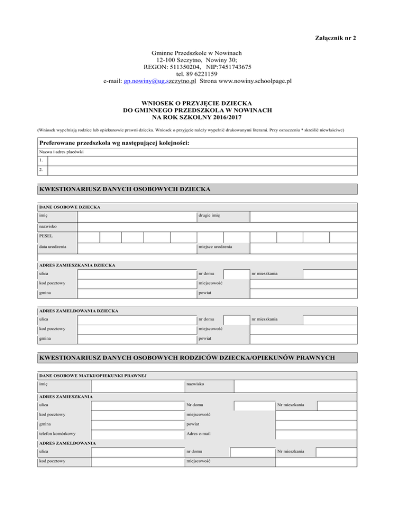Załącznik nr 2 Gminne Przedszkole w Nowinach 12-100 Szczytno, Nowiny 30; REGON: 511350204, NIP:7451743675 tel. 89 6221159 e-mail: [email protected] Strona www.nowiny.schoolpage.pl WNIOSEK O PRZYJĘCIE DZIECKA DO GMINNEGO PRZEDSZKOLA W NOWINACH NA ROK SZKOLNY 2016/2017 (Wniosek wypełniają rodzice lub opiekunowie prawni dziecka. Wniosek o przyjęcie należy wypełnić drukowanymi literami. Przy oznaczeniu * skreślić niewłaściwe) Preferowane przedszkola wg następującej kolejności: Nazwa i adres placówki 1. 2. KWESTIONARIUSZ DANYCH OSOBOWYCH DZIECKA DANE OSOBOWE DZIECKA imię drugie imię nazwisko PESEL data urodzenia miejsce urodzenia ADRES ZAMIESZKANIA DZIECKA ulica nr domu kod pocztowy miejscowość gmina powiat nr mieszkania ADRES ZAMELDOWANIA DZIECKA ulica nr domu kod pocztowy miejscowość gmina powiat nr mieszkania KWESTIONARIUSZ DANYCH OSOBOWYCH RODZICÓW DZIECKA/OPIEKUNÓW PRAWNYCH DANE OSOBOWE MATKI/OPIEKUNKI PRAWNEJ imię nazwisko ADRES ZAMIESZKANIA ulica Nr domu kod pocztowy miejscowość gmina powiat telefon komórkowy Adres e-mail Nr mieszkania ADRES ZAMELDOWANIA ulica nr domu kod pocztowy miejscowość Nr mieszkania gmina powiat MIEJSCA ZATRUDNIENIA nazwa firmy adres firmy telefon kontaktowy DANE OSOBOWE OJCA/OPIEKUNA RAWNEGO imię nazwisko ADRES ZAMIESZKANIA ulica Nr domu kod pocztowy miejscowość gmina powiat telefon komórkowy Adres e-mail Nr mieszkania ADRES ZAMELDOWANIA ulica nr domu kod pocztowy miejscowość gmina powiat Nr mieszkania MIEJSCA ZATRUDNIENIA nazwa firmy adres firmy telefon kontaktowy KRYTERIA PRZYJĘĆ (w przypadku spełniania danego kryterium proszę postawić znak „X”) 1. Wielodzietność rodziny kandydata załącznik: oświadczenie o wielodzietności rodziny kandydata. 2. Niepełnosprawność kandydata załącznik: orzeczenie o potrzebie kształcenia specjalnego wydane ze względu na niepełnosprawność, orzeczenie o niepełnosprawności lub o stopniu niepełnosprawności lub orzeczenie równoważne w rozumieniu przepisów ustawy z dnia 27 sierpnia 1997r rehabilitacji zawodowej i społecznej oraz zatrudnieniu osób niepełnosprawnych (Dz. U. Z 2011r nr 127, poz. 721 ze zm.). 3. Niepełnosprawność jednego z rodziców kandydata oświadczenie o posiadaniu niepełnosprawności lub orzeczenie równoważne w rozumieniu przepisów ustawy z dnia 27 sierpnia 1997r rehabilitacji zawodowej i społecznej oraz zatrudnianiu osób niepełnosprawnych (Dz. U. Z 2011r nr 127, poz. 721 ze zm.). 4. Niepełnosprawność obojga rodziców kandydata oświadczenie o posiadaniu stopnia niepełnosprawności lub orzeczenie równoważne w rozumieniu przepisów ustawy z dnia 27 sierpnia 1997r rehabilitacji zawodowej i społecznej oraz zatrudnianiu osób niepełnosprawnych (Dz. U. Z 2011r nr 127, poz. 721 ze zm.). 5. Niepełnosprawność rodzeństwa kandydata Oświadczenie o posiadaniu orzeczenia o potrzebie kształcenia specjalnego wydane ze względu na niepełnosprawność, orzeczenie o niepełnosprawności lub o stopniu niepełnosprawności lub orzeczenie równoważne w rozumieniu przepisów ustawy z dnia 27 sierpnia 1997r rehabilitacji zawodowej i społecznej oraz zatrudnieniu osób niepełnosprawnych (Dz. U. Z 2011r nr 127, poz. 721 ze zm.). 6. Samotne wychowanie kandydata w rodzinie załącznik: prawomocny wyrok sądu rodzinnego orzekający rozwód lub separację lub akt zgonu oraz oświadczenie o samotnym wychowywaniu dziecka oraz niewychowywaniu żadnego dziecka wspólnie z jego rodzicem. 7. Objęcie kandydata pieczą zastępczą załącznik: dokument potwierdzający objęcie dziecka pieczą zastępczą zgodnie z ustawą z dnia 9 czerwca 2011r o wspieraniu rodziny i systemie pieczy zastępczej (Dz. U. Z 2013r poz. 135). INFORMACJE O DZIECKU Informacje o stanie zdrowia dziecka mogące mieć znaczenie podczas pobytu dziecka w przedszkolu Pouczenia: Jestem świadomy/a odpowiedzialności karnej za złożenie fałszywego oświadczenia. …..................................... data …....…................................. …........................................... podpis matki/ opiekunki prawnej podpis ojca/ opiekuna prawnego Wyrażam zgodę na gromadzenie, przetwarzanie i wykorzystywanie danych osobowych zawartych we wniosku o przyjęcie do celów związanych z przeprowadzeniem naboru do przedszkola oraz organizacją pracy i funkcjonowaniem przedszkola, zgodnie z ustawą z dnia 29 sierpnia 1997 roku o ochronie danych osobowych (Dz. U. Z 2002r. Nr 101, poz.926 ze zm.). …..................................... data …....…................................. …........................................... podpis matki/ opiekunki prawnej podpis ojca/ opiekuna prawnego