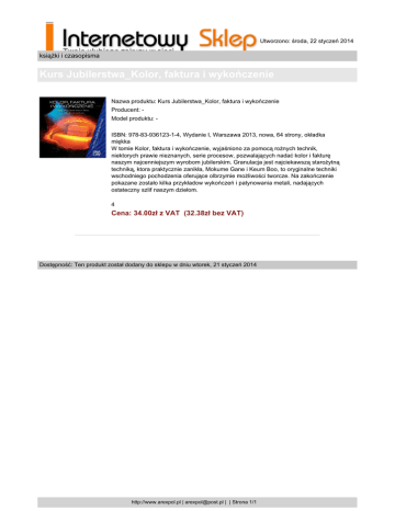Utworzono: środa, 22 styczeń 2014 książki i czasopisma Kurs Jubilerstwa_Kolor, faktura i wykończenie Nazwa produktu: Kurs Jubilerstwa_Kolor, faktura i wykończenie Producent: Model produktu: ISBN: 978-83-936123-1-4, Wydanie I, Warszawa 2013, nowa, 64 strony, okładka miękka W tomie Kolor, faktura i wykończenie, wyjaśniono za pomocą rożnych technik, niektorych prawie nieznanych, serie procesow, pozwalających nadać kolor i fakturę naszym najcenniejszym wyrobom jubilerskim. Granulacja jest najciekawszą starożytną techniką, ktora praktycznie zanikła, Mokume Gane i Keum Boo, to oryginalne techniki wschodniego pochodzenia oferujące olbrzymie możliwości tworcze. Na zakończenie pokazane zostało kilka przykładow wykończeń i patynowania metali, nadających ostateczny szlif naszym dziełom. 4 Cena: 34.00zł z VAT (32.38zł bez VAT) Dostępność: Ten produkt został dodany do sklepu w dniu wtorek, 21 styczeń 2014 http://www.arexpol.pl | [email protected] | | Strona 1/1