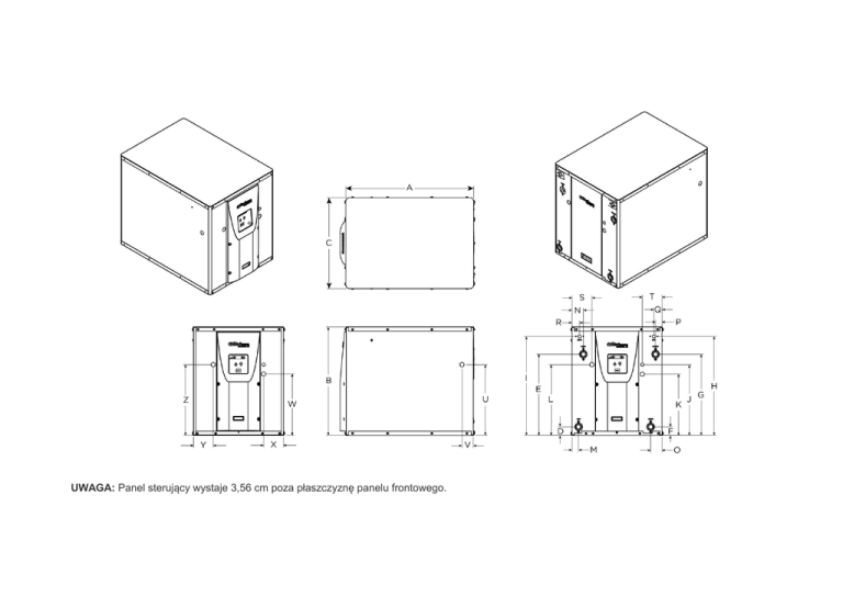 UWAGA: Panel sterujący wystaje 3,56 cm poza płaszczyznę panelu frontowego. Envision Hydronic – Wymiary Tabela 3 Połączenia elektryczne Połączenia hydrauliczne Obudowa Model J K L 1/2" 3/4" 3/4" A B C D E F G H I Głęb. Wys. Szer. CO wlot CO wylot Woda/ Glikol wlot Woda/ Glikol wylot CW wlot CW wylot Średnice CO Źródło dolne Przył. CW Sterow. Zewn. pompa obieg. Zasil. elektr. 006 cm 59,7 66,3 49,5 25,4 56,4 25,4 56,4 - - 25,4 mm 25,4 mm - 40,6 36,1 36,1 008 cm 78,7 66,5 55,9 5,3 49,8 5,3 49,8 60,7 60,7 25,4 mm 25,4 mm 12,7 mm 43,4 37,6 43,4 012 cm 78,7 66,5 55,9 5,6 52,3 5,6 52,3 60,7 60,7 31,8 mm 31,8 mm 12,7 mm 43,4 37,6 43,4 017 cm 78,7 66,5 55,9 6,1 58,4 6,1 58,4 52,3 52,3 31,8 mm 31,8 mm 12,7 mm 43,4 37,6 43,4 Envision Hydronic – Wymiary Tabela 4 Połączenia hydrauliczne Model M N CO wlot CO wylot O P Woda/ Woda/ Glikol Glikol wlot wylot Q CW wlot R S Połączenia elektryczne T CW Zasil. Sterow. wylot elektr. U V Zasil. elektr. z boku Zasil. elektr. z boku W X Y Z Zewn. Zewn. Zasil. Zasil. pompa pompa elektr. elektr. obiegowa obiegowa 006 cm 6,1 6,1 6,1 6,1 - - 8,9 7,4 37,8 6,6 5,3 4,4 7,4 10,4 008 cm 4,1 7,0 7 4,1 5,1 4,6 12,2 12,2 43,4 7,0 37,8 12,2 12,2 43,4 012 cm 4,6 9,1 9,1 4,6 5,3 4,6 12,2 12,2 43,4 7,1 37,8 12,2 12,2 43,4 017 cm 4,6 10,2 10,2 4,6 10,7 3,6 12,2 12,2 43,4 7,1 37,8 12,2 12,2 43,4 Envision Hydronic – Dane fizyczne Tabela 5 Model 06 08 Kompresor 12 17 Scroll Ładunek czynnika chłodniczego R410A [kg] 1,64 1,98 1,93 3,12 Pojemność 1 wymiennika ciepła [l]* 3,38 3,94 5,25 6,13 Masa netto [kg] 102,10 131,50 147,4 156,50 Masa brutto [kg] 112,00 138,30 154,2 163,30 * Po stronie CO albo źródła dolnego