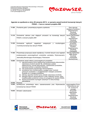Urząd Marszałkowski Województwa Mazowieckiego w Warszawie Departament Geodezji i Kartografii Al. Jerozolimskie 28, 00-024 Warszawa tel. (22) 827 70 46, fax: (22) 828 84 59 e-mail: [email protected] Agenda na spotkanie w dniu 29 sierpnia 2011r. w sprawie zasad kontroli konwersji danych PZGiK – I tura w ramach projektu BW 11:00 Powitanie gości i prezentacja programu spotkania 11:10 Omówienie zakresu prac objętych umowami na konwersję danych PZGiK w ramach projektu BW 11:25 Omówienie ogólnych zagadnień związanych z monitoringiem i kontrolą konwersji baz danych PZGiK 11:40 Prezentacja propozycji zasad współpracy i kontroli danych oraz logistyki przekazywania poszczególnych produktów pomiędzy Wykonawcami, Jednostką Monitorująco-Kontrolującą i Partnerami 12:00 13:30 13:45 Omówienie zasad odbioru poszczególnych produktów 1) zaproponowanie formy logistycznej przekazywania dokumentów wykonawcy kontroli (serwer ftp, (lokalizacja, podpis elektroniczny), format dokumentów, nazewnictwo produktów, elementy kontroli w siedzibie Partnera); 2) rola opracowania poprawnego harmonogramu; 3) omówienie form monitorowania postępu prac i kontroli gotowych produktów z uwzględnieniem rodzajów produktów (podział na 4 rodzaje produktów), 4) zakresy raportów kontroli (przy udziale wykonawcy kontroli); 5) standard danych opracowanych w toku realizacji umowy, który kwalifikowałby przedmiot umowy do przyjęcia do zasobu PZGiK, 6) doprecyzowywanie wymagań zawartych w dokumentacji zamówienia. Przerwa Syntetyczna prezentacja stanu zaawansowania prac Wykonawców konwersji baz danych PZGiK 14:45 Wnioski i zakończenie Ewa Janczar Zastępca Dyrektora Departamentu Geodezji i Kartografii Iwona GłuchowskaRylska Departament Geodezji i Kartografii Krzysztof Mączewski Dyrektor Departamentu Geodezji i Kartografii Monika Sadzińska ABM Studio Geodezji i Kartografii Numerycznej poszczególne Firmy Wykonawcze (po ok. 5 minut na umowę) Krzysztof Mączewski Dyrektor Departamentu Geodezji i Kartografii