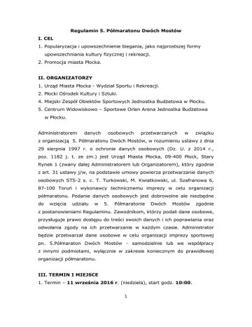 Regulamin 5. Półmaratonu Dwóch Mostów I. CEL 1. Popularyzacja i upowszechnienie biegania, jako najprostszej formy upowszechniania kultury fizycznej i rekreacji. 2. Promocja miasta Płocka. II. ORGANIZATORZY 1. Urząd Miasta Płocka - Wydział Sportu i Rekreacji. 2. Płocki Ośrodek Kultury i Sztuki. 4. Miejski Zespół Obiektów Sportowych Jednostka Budżetowa w Płocku. 5. Centrum Widowiskowo – Sportowe Orlen Arena Jednostka Budżetowa w Płocku. Administratorem danych osobowych przetwarzanych w związku z organizacją 5. Półmaratonu Dwóch Mostów, w rozumieniu ustawy z dnia 29 sierpnia 1997 r. o ochronie danych osobowych (Dz. U. z 2014 r., poz. 1182 j. t. ze zm.) jest Urząd Miasta Płocka, 09-400 Płock, Stary Rynek 1 (zwany dalej Administratorem lub Organizatorem), który zgodnie z art. 31 ustawy j/w, na podstawie umowy powierza przetwarzanie danych osobowych STS-2 s. c. T. Turkowski, M. Kwiatkowski, ul. Szafranowa 6, 87-100 Toruń i wykonawcy technicznemu imprezy w celu organizacji półmaratonu. Podanie danych osobowych jest dobrowolne ale niezbędne do wzięcia udziału w 5. Półmaratonie Dwóch Mostów zgodnie z postanowieniami Regulaminu. Zawodnikom, którzy podali dane osobowe, przysługuje prawo dostępu do treści swoich danych i ich poprawiania oraz odwołania zgody na ich przetwarzanie w każdym czasie. Administrator będzie przetwarzał dane osobowe w celu organizacji imprezy sportowej pn. 5.Półmaraton Dwóch Mostów - samodzielnie lub we współpracy z innymi podmiotami, wyłącznie w zakresie koniecznym do prawidłowej organizacji półmaratonu. III. TERMIN I MIEJSCE 1. Termin – 11 września 2016 r. (niedziela), start godz. 10:00. 1 Ceremonię zakończenia imprezy zaplanowano na godz. 13:30. 2. Miejsce: Płock. Start i meta – Stary Rynek. 3. Długość trasy – 21 0975 m. Trasa obejmuje dwie pętle. 4. Trasa biegu: 65% nawierzchni asfaltowej, 20 % płyty betonowe, 10 % ścieżki nieutwardzone, 5 % kostka brukowa. (start – Stary Rynek – pl. Narutowicza – ul. Mostowa – Most im. Legionów- Kolejowa – Rondo Lajourdie – wał przeciwpowodziowy – Most Solidarności – Grabówka – Norbertańska – Mostowa - Most im. Legionów – Kolejowa – Rondo Lajourdie – wał przeciwpowodziowy – Most Solidarności – Grabówka – Norbertańska –Mostowa – Pl. Narutowicza – meta Stary Rynek). 5. Informacje, o których mowa w ust. 1 – 4 wraz z niniejszym Regulaminem dostępne będą na stronie internetowej organizatorów półmaratonu: www.polmaraton.plock.eu 6. Oznaczenie trasy co 1 km, będą 4 punkty odżywcze (nawadniania). 7. Na trasie będą znajdowały się punkty kontrolne. Skrócenie trasy powoduje dyskwalifikację. 8. Zawodników obowiązuje limit czasowy pokonania trasy wynoszący 03h:00min:00s. 9. Trasa półmaratonu zamknięta jest dla ruchu kołowego do godziny 13:15. Wszyscy zawodnicy, którzy nie dobiegną do mety do godz. 13:00, zobowiązani są do przerwania biegu i zejścia z trasy. Za ostatnim zawodnikiem będzie jechał samochód techniczny, który po upływie limitu czasu zabierze zawodników na metę. 10. Uczestnicy półmaratonu, którzy po upływie regulaminowego limitu czasu pozostaną na trasie, czynią to własną odpowiedzialność i ryzyko. Muszą oni wtedy dostosować się do wymogów przepisów o ruchu drogowym i kodeksu cywilnego. Organizator w tym przypadku nie ponosi odpowiedzialności z tytułu uszkodzenia ciała lub uszczerbku na zdrowiu tych Uczestników. 11. UWAGA! Trasa ze względu na częstą zmianę nawierzchni i duże różnice wzniesień nie jest przeznaczona dla zawodników na wózkach. 12. Uczestnicy półmaratonu ustawiają się na starcie w wydzionej strefie startowej przez Organizatora. 2 13. Na trasie półmaratonu będą znajdować się punkty medyczne, które obsługiwane będą przez ratowników medycznych. 14. Na trasie półmaratonu mogą znajdować się wyłącznie jego uczestnicy, obsługa techniczna, w tym pojazdy posiadające zezwolenie Organizatora. IV. UCZESTNICTWO 1. Prawo startu mają zawodnicy, którzy do dnia 11 września 2016 roku ukończą 18 lat oraz spełnią warunki określone w niniejszym Regulaminie. 2. Wszyscy zawodnicy muszą zostać zweryfikowani w Biurze Zawodów. Podczas weryfikacji zawodnicy muszą posiadać dowód osobisty lub inny dokument potwierdzający tożsamość oraz dowód opłaty startowej. 3. Warunkiem dopuszczenia zawodnika do biegu jest: 1) Wypełnienie formularza zgłoszeniowego i dokonanie opłaty wpisowej. 2) Zapoznanie się i wyrażenie zgody na przestrzeganie niniejszego Regulaminu i tym samym pełną akceptację powyższych regulacji oraz zobowiązanie się do ich przestrzegania. 3) Złożenie oświadczenia o starcie w zawodach na własną odpowiedzialność, mając na uwadze ryzyko i niebezpieczeństwo związane z charakterem i długością półmaratonu, oraz o stanie zdrowia pozwalającym na start w zawodach. 4) W półmaratonie powinny uczestniczyć wyłącznie osoby posiadające dobry stan zdrowia oraz nieposiadające przeciwskazań medycznych do uczestnictwa w biegu długodystansowym, jakim jest półmaraton. 5) Wyrażenie zgody na przetwarzanie przez Administratora danych osobowych zawodnika podanych w zgłoszeniu, a także na zamieszczanie danych osobowych w postaci imienia, nazwiska, płci, roku urodzenia, narodowości, adresu e-mail, nr telefonu, w przekazach telewizyjnych, radiowych, internetowych i w formie drukowanej oraz na przesyłanie przez Administratora na adres mailowy zawodnika informacji dotyczących 5.Półmaratonu Dwóch 3 Mostów. Dane osobowe zawodnika mogą być przekazywane przez Administratora podmiotom z nim współpracującym przy realizacji 5.Półmaratonu Dwóch Mostów. 6) Wyrażenie zgody na nieodpłatne wykorzystanie utrwalonego w formie fotografii lub zapisu wideo wizerunku zawodnika. Zawodnik udziela Organizatorom niwyłącznej, nieograniczonej terytorialnie i czasowo nieodpłatnej licencji na wykorzystanie utrwa
