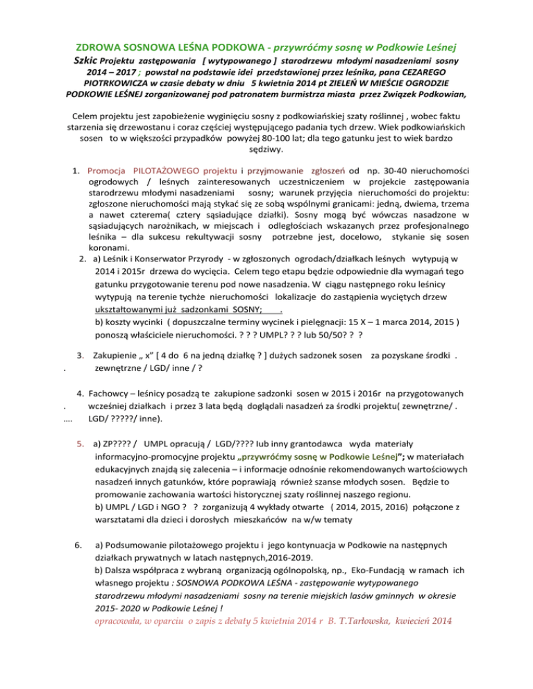 ZDROWA SOSNOWA LEŚNA PODKOWA - przywróćmy sosnę w Podkowie Leśnej Szkic Projektu zastępowania [ wytypowanego ] starodrzewu młodymi nasadzeniami sosny 2014 – 2017 ; powstał na podstawie idei przedstawionej przez leśnika, pana CEZAREGO PIOTRKOWICZA w czasie debaty w dniu 5 kwietnia 2014 pt ZIELEŃ W MIEŚCIE OGRODZIE PODKOWIE LEŚNEJ zorganizowanej pod patronatem burmistrza miasta przez Związek Podkowian, Celem projektu jest zapobieżenie wyginięciu sosny z podkowiańskiej szaty roślinnej , wobec faktu starzenia się drzewostanu i coraz częściej występującego padania tych drzew. Wiek podkowiańskich sosen to w większości przypadków powyżej 80-100 lat; dla tego gatunku jest to wiek bardzo sędziwy. 1. Promocja PILOTAŻOWEGO projektu i przyjmowanie zgłoszeń od np. 30-40 nieruchomości ogrodowych / leśnych zainteresowanych uczestniczeniem w projekcie zastępowania starodrzewu młodymi nasadzeniami sosny; warunek przyjęcia nieruchomości do projektu: zgłoszone nieruchomości mają stykać się ze sobą wspólnymi granicami: jedną, dwiema, trzema a nawet czterema( cztery sąsiadujące działki). Sosny mogą być wówczas nasadzone w sąsiadujących narożnikach, w miejscach i odległościach wskazanych przez profesjonalnego leśnika – dla sukcesu rekultywacji sosny potrzebne jest, docelowo, stykanie się sosen koronami. 2. a) Leśnik i Konserwator Przyrody - w zgłoszonych ogrodach/działkach leśnych wytypują w 2014 i 2015r drzewa do wycięcia. Celem tego etapu będzie odpowiednie dla wymagań tego gatunku przygotowanie terenu pod nowe nasadzenia. W ciągu następnego roku leśnicy wytypują na terenie tychże nieruchomości lokalizacje do zastąpienia wyciętych drzew ukształtowanymi już sadzonkami SOSNY; . b) koszty wycinki ( dopuszczalne terminy wycinek i pielęgnacji: 15 X – 1 marca 2014, 2015 ) ponoszą właściciele nieruchomości. ? ? ? UMPL? ? ? lub 50/50? ? ? . 3. Zakupienie „ x” [ 4 do 6 na jedną działkę ? ] dużych sadzonek sosen za pozyskane środki . zewnętrzne / LGD/ inne / ? . …. 4. Fachowcy – leśnicy posadzą te zakupione sadzonki sosen w 2015 i 2016r na przygotowanych wcześniej działkach i przez 3 lata będą doglądali nasadzeń za środki projektu( zewnętrzne/ . LGD/ ?????/ inne). 5. a) ZP???? / UMPL opracują / LGD/???? Iub inny grantodawca wyda materiały informacyjno-promocyjne projektu „przywróćmy sosnę w Podkowie Leśnej”; w materiałach edukacyjnych znajdą się zalecenia – i informacje odnośnie rekomendowanych wartościowych nasadzeń innych gatunków, które poprawiają również szanse młodych sosen. Będzie to promowanie zachowania wartości historycznej szaty roślinnej naszego regionu. b) UMPL / LGD i NGO ? ? zorganizują 4 wykłady otwarte ( 2014, 2015, 2016) połączone z warsztatami dla dzieci i dorosłych mieszkańców na w/w tematy 6. a) Podsumowanie pilotażowego projektu i jego kontynuacja w Podkowie na następnych działkach prywatnych w latach następnych,2016-2019. b) Dalsza współpraca z wybraną organizacją ogólnopolską, np., Eko-Fundacją w ramach ich własnego projektu : SOSNOWA PODKOWA LEŚNA - zastępowanie wytypowanego starodrzewu młodymi nasadzeniami sosny na terenie miejskich lasów gminnych w okresie 2015- 2020 w Podkowie Leśnej ! opracowała, w oparciu o zapis z debaty 5 kwietnia 2014 r B. T.Tarłowska, kwiecień 2014