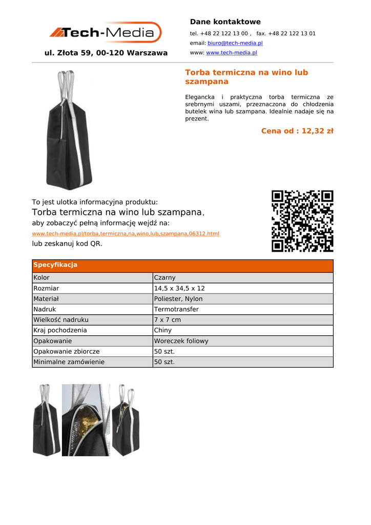 Dane kontaktowe tel. +48 22 122 13 00 , fax. +48 22 122 13 01 email: [email protected] ul. Złota 59, 00-120 Warszawa www: www.tech-media.pl Torba termiczna na wino lub szampana Elegancka i praktyczna torba termiczna ze srebrnymi uszami, przeznaczona do chłodzenia butelek wina lub szampana. Idealnie nadaje się na prezent. Cena od : 12,32 zł To jest ulotka informacyjna produktu: Torba termiczna na wino lub szampana , aby zobaczyć pełną informację wejdź na: www.tech-media.pl/torba,termiczna,na,wino,lub,szampana,06312.html lub zeskanuj kod QR. Specyfikacja Kolor Czarny Rozmiar 14,5 x 34,5 x 12 Materiał Poliester, Nylon Nadruk Termotransfer Wielkość nadruku 7 x 7 cm Kraj pochodzenia Chiny Opakowanie Woreczek foliowy Opakowanie zbiorcze 50 szt. Minimalne zamówienie 50 szt.
