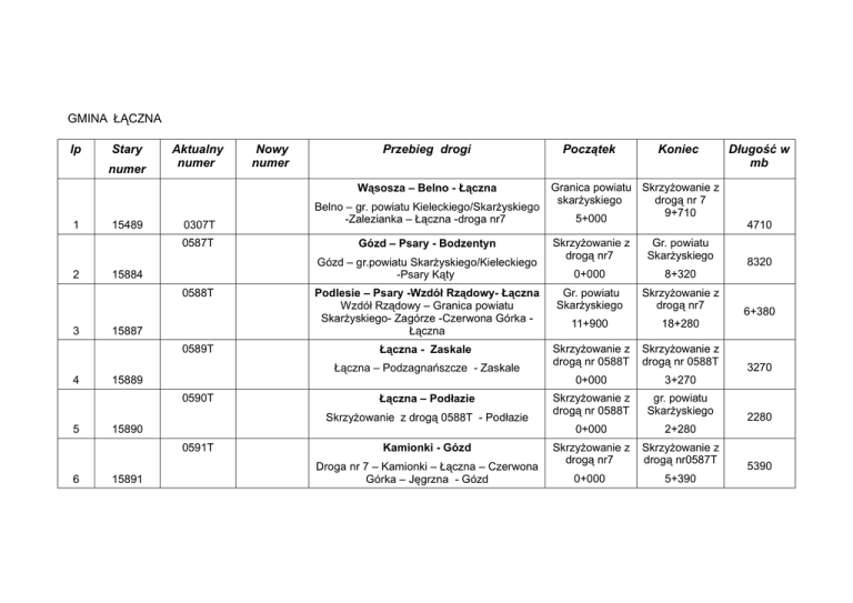 GMINA ŁĄCZNA lp Stary numer Aktualny numer Nowy numer Przebieg drogi Wąsosza – Belno - Łączna 1 2 15489 0307T Belno – gr. powiatu Kieleckiego/Skarżyskiego -Zalezianka – Łączna -droga nr7 0587T Gózd – Psary - Bodzentyn 0588T 3 15887 0589T 4 0590T 5 0591T 6 15891 0+000 8+320 Podlesie – Psary -Wzdół Rządowy- Łączna Wzdół Rządowy – Granica powiatu Skarżyskiego- Zagórze -Czerwona Górka Łączna Gr. powiatu Skarżyskiego Skrzyżowanie z drogą nr7 11+900 18+280 Łączna - Zaskale Skrzyżowanie z drogą nr 0588T Skrzyżowanie z drogą nr 0588T 0+000 3+270 Skrzyżowanie z drogą nr 0588T gr. powiatu Skarżyskiego 0+000 2+280 Skrzyżowanie z drogą nr7 Skrzyżowanie z drogą nr0587T 0+000 5+390 Łączna – Podłazie Skrzyżowanie z drogą 0588T - Podłazie 15890 Granica powiatu Skrzyżowanie z skarżyskiego drogą nr 7 9+710 5+000 Gr. powiatu Skarżyskiego Łączna – Podzagnańszcze - Zaskale 15889 Koniec Skrzyżowanie z drogą nr7 Gózd – gr.powiatu Skarżyskiego/Kieleckiego -Psary Kąty 15884 Początek Kamionki - Gózd Droga nr 7 – Kamionki – Łączna – Czerwona Górka – Jęgrzna - Gózd Długość w mb 4710 8320 6+380 3270 2280 5390 lp Stary numer Aktualny numer Nowy numer 0593T 7 Początek Koniec Występa – Gózd gr. powiatu Skarżyskiego Skrzyżowanie z drogą nr7 0+000 2+050 Skrzyżowanie z drogą nr 0587T gr. powiatu Skarżyskiego 0+000 2+250 Przebieg drogi Początek Koniec Samsonów -Odrowąż – Boków – Granica województwa gr. powiatu Skarżyskiego gr. powiatu Skarżyskiego Samsonów – Szałas -gr. pow.Kieleckiego/Skarżyskiego -Odrowążekgr. pow. Skarżyskiego/ Koneckiego – Odrowąż 8+700 13+700 Mroczków – Rędocin – gr.woj.Świętokrzyskiego -(Borki) Skrzyżowanie z drogą nr42 gr. woj. Świętokrzyskiego Skrzyżowanie z droga nr 42 – Mroczków – Rędocin – granica województwa - Borki 0+000 5+000 Gostków – Gilów Skrzyżowanie skrzyżowanie z drogą nr 0443T – Gostków – Gilów – skrzyżowanie z drogą nr 42 z drogą nr 0443T Skrzyżowanie z drogą nr42 Granica powiatu skarżyskiego – skrzyżowanie z drogą powiatową 0307T - skrzyżowanie z drogą nr 7 15893 0595T 8 Przebieg drogi Klonów – Nademłynie Skrzyżowanie z drogą nr 0587T – Klonów – granica powiatu skarzyskiego – Brzezinki 15895 Długość w mb 2050 2250 GMINA BLIŻYN lp Stary numer Aktualny numer 0437T 9 15644 0441T 10 15648 0442T 11 15649 Nowy numer 0+000 3+500 Długość w mb 5000 5000 3500 lp Stary numer Aktualny numer 0443T 12 15650 0444T 13 15651 15652 15653 15655 15658 Skrzyżowanie z drogą nr42 gr. woj. Świętokrzyskiego skrzyżowanie z drogą nr 42 – Ubyszów granica woj. Świętokrzyskiego – Majdów. 0+000 5+235 Bliżyn- Gostków Bliżyn – Zbrojów Bliżyn – Odrowążek Nowy Odrowążek – Kopcie Stąporków - Sorbin Świerczów - gr. pow. Koneckiego/ Skarżyskiego – Nowki – Sorbin – skrzyżowanie z drogą nr 0446T 0451T 18 Bliżyn – Ubyszów – gr.woj.Świętokrzyskiego – (Majdów) skrzyżowanie z drogą nr 0451T – Nowy Odrowążek – skrzyżowanie z drogą 0437T 15654 0448T 17 Koniec skrzyżowanie z drogą nr 42 – Zbrojów – Sorbin – Odrowążek – skrzyżowanie z drogą nr 0437T 0447T 16 Początek Wojtyniów- Jastrzębia – Łazik - Zbrojów 0446T 15 Przebieg drogi Wojtyniów – Wołów skrzyżowanie z drogą nr 42– Brzeście – Zagórze – skrzyżowanie z drogą nr 0443T - Gostków 0445T 14 Nowy numer Krasna – Odrowążek Nowy Włochów- gr.pow. Koneckiego/Skarżyskiego -Nowy Odrowążęk Odrowążęk Skrzyżowanie z Skrzyżowanie z drogą nr42 drogą nr 0443T 0+000 9+700 Skrzyżowanie z drogą nr42 Skrzyżowanie z drogą nr 0446T 0+000 7+600 Skrzyżowanie z drogą nr42 Skrzyżowanie z droga nr 0437T 0+000 8+397 Skrzyżowanie z drogą nr 0451T Skrzyżowanie z droga nr 0437T 0+000 1+400 gr. powiatu Skarżyskiego 5+950 Skrzyżowanie z drogą nr 0446T 8+000 gr. powiatu Skarżyskiego 7+095 Skrzyżowanie z droga nr 0437T 8+050 Długość w mb 5235 9700 7600 8397 1400 2050 955 lp Stary numer Aktualny numer Nowy numer 0452T 19 Przebieg drogi Początek Koniec Krasna - Kucebów gr. powiatu Skarżyskiego 4+000 Skrzyżowanie z droga nr 0437T 6+500 Skrzyżowanie z drogą nr0443T 0+000 gr. miasta Skarżysko – Kamienna 5+200 Przebieg drogi Początek Koniec ul. Żeromskiego Skrzyżowanie z drogą nr 7 0+000 Granica lasu Skrzyżowanie z drogą nr 7 0+000 Granica lasu Luta – gr.pow. Koneckiego/ SkarżyskiegoKucębów – skrzyżowanie z drogą nr 0437T 15659 0495T Ubyszów – Skarżysko - Kamienna Ubyszów – Brzask – ul. Ponurego – skrzyżowanie z drogą nr 7 20 Długość w mb 2500 5200 15699 GMINA SUCHEDNIÓW lp Stary numer Aktualny numer 0592T 21 Skrzyżowanie z drogą nr – 7 - granica lasu 15892 0594T 22 15894 Nowy numer ul. Zagórska Skrzyżowanie z drogą nr – 7 - granica lasu ul. Jasna 23 Skrzyżowanie z drogą nr 7 – skrzyżowanie z drogą nr 751( ul. Bodzentyńska) 1+625 1+600 Skrzyżowanie z Skrzyżowanie z drogą nr 7 drogą nr 751 0+000 (ul.Bodzentyńska) 0+686 Długość w mb 1625 1600 686 lp Stary numer Aktualny numer Nowy numer Przebieg drogi Początek Skrzyżowanie z ul.Powstańców skrzyżowanie z ul. Powstańców 1863r – 1863r skrzyżowanie z drogą nr 751 – skrzyżowanie z 0+000 ul. Poziomskiego – skrzyżowanie z ul. Jasną ul. E. Peck 24 ul. Poziomskiego Skrzyżowanie z drogą nr 7 – skrzyżowanie z drogą nr 751( ul. Bodzentyńska) 25 0578T 26 Suchedniów - Parszów Skrzyżowanie z ul. Mickiewicza (751) -ul. Bodzentyńska -ul. Bugaj – ul. Langiewicza -gr. miasta – Mostki gr. pow. Skarżyskiego/ Starachowickiego - Parszów 15875 Koniec Skrzyzowanie z ul. Jasną 1+140 Skrzyżowanie z Skrzyżowanie z drogą nr 7 drogą nr 751 0+000 (ul.Bodzentyńska) Długość w mb 1140 590 0+590 Skrzyżowanie z drogą nr 751 (ul.Mickiewicza) 0+000 Gr. pow. Skarżyskiego 6865 6+865 GMINA SKARŻYSKO - KOŚCIELNE lp Stary numer Aktualny numer 0555T 27 15852 Przebieg dro