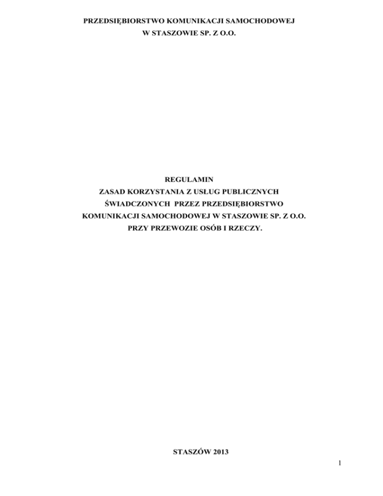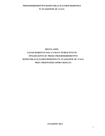 PRZEDSIĘBIORSTWO KOMUNIKACJI SAMOCHODOWEJ W STASZOWIE SP. Z O.O. REGULAMIN ZASAD KORZYSTANIA Z USŁUG PUBLICZNYCH ŚWIADCZONYCH PRZEZ PRZEDSIĘBIORSTWO KOMUNIKACJI SAMOCHODOWEJ W STASZOWIE SP. Z O.O. PRZY PRZEWOZIE OSÓB I RZECZY. STASZÓW 2013 1 ROZDZIAŁ I PRZEDMIOT ORAZ ZAKRES STOSOWANIA REGULAMINU §1 1. Niniejszy regulamin ustala się na podstawie art. 13 ust. 1 Ustawy o gospodarce komunalnej z dnia 20 grudnia 1996 r. (Dz.U. 1997 nr 9 poz. 43 ze zm.) 2. Regulamin określa warunki obsługi podróżnych, odprawy oraz przewozu osób i rzeczy wykonywanego taborem autobusowym zarejestrowanym w Przedsiębiorstwie Komunikacji Samochodowej w Staszowie Spółka z o.o., mającego status przewoźnika uprawnionego do prowadzenia tego rodzaju działalności. 3. Regulamin stosuje się do zarobkowego przewozu osób i rzeczy, w zakresie obejmującym: l) krajowy transport drogowy 2) międzynarodowy transport drogowy - jeżeli umowa międzynarodowa nie stanowi inaczej. 4. Przyjęte w niniejszym opracowaniu uregulowania stosuje się w ścisłym powiązaniu z przepisami Ustawy z dnia 15 listopada 1984 r. Prawo przewozowe (t.j. Dz. U. 2012 poz. 1173 ), z uwzględnieniem wydanych w jej wykonaniu aktów normatywnych, oraz Ustawy z dnia 23 kwietnia 1964 r. Kodeks cywilny (Dz. U. 1964 Nr 16 poz. 93 ze zm.), Ustawy z dnia 6 września 2001 r. o transporcie drogowym (t.j. Dz. U. 2012 poz. 1265 ze zm.), Ustawy z dnia 20 czerwca 1992 r. o uprawnieniach do ulgowych przejazdów środkami publicznego transportu zbiorowego (t.j. Dz. U. 2012 poz. 1138 ), Rozporządzenia Ministra Transportu i Budownictwa z dnia 24 lutego 2006 r. w sprawie ustalania stanu przesyłek oraz postępowania reklamacyjnego (Dz. U. 2006 Nr 38 poz. 266), Rozporządzenia Ministra Spraw Wewnętrznych i Administracji z dnia 12 marca 2008 r. w sprawie rodzajów dokumentów poświadczających uprawnienia do korzystania z ulgowych przejazdów środkami publicznego transportu zbiorowego (Dz. U. 2008 Nr 56 poz. 340), Rozporządzenia Ministra Infrastruktury z dnia 20 stycznia 2005 r. w sprawie sposobu ustalania wysokości opłat dodatkowych z tytułu przewozu osób, zabranych ze sobą do przewozu rzeczy i zwierząt oraz wysokości opłaty manipulacyjnej Dz. U. 2005 Nr 14 poz. 117. §2 Użyte w regulaminie określenia oznaczają: l. krajowy transport drogowy - podejmowanie i wykonanie działalności gospodarczej w zakresie przewozu osób lub rzeczy pojazdami samochodowymi zarejestrowanymi w kraju, za które uważa się również zespoły pojazdów składające się z pojazdu samochodowego i przyczepy lub naczepy, na terytorium Rzeczypospolitej Polskiej, przy czym jazda pojazdu, miejsce rozpoczęcia lub zakończenia podróży i przejazdu oraz droga znajdują się na terytorium Rzeczypospolitej Polskiej. 2 2. przewóz regularny - publiczny przewóz osób i bagażu: a) wykonywany według rozkładu jazdy podanego przez przewoźnika drogowego do publicznej wiadomości przez ogłoszenie wywieszone na przystankach i dworcach autobusowych wymienionych w rozkładzie jazdy, b) podczas którego wsiadanie i wysiadanie pasażerów odbywa się na przystankach określonych w rozkładzie jazdy, c) w którym należność za przejazd jest pobierana zgodnie z cennikiem opłat podanym do publicznej wiadomości, d) wykonywany zgodnie z warunkami przewozu osób określonymi w zezwoleniu 3. przewóz regularny specjalny - niepubliczny przewóz regularny określonej grupy osób z wyłączeniem innych osób, w czasie i na warunkach uzgodnionych w umowie zawartej między przewoźnikiem a organizatorem przewozu na rzecz osób trzecich - tj. uczestników przewozu grupowego, 4. przewóz okazjonalny - przewóz osób, który nie stanowi przewozu regularnego albo przewozu regularnego specjalnego, 5. przewoźnik drogowy - przedsiębiorca uprawniony do wykonywania działalności gospodarczej w zakresie transportu drogowego, 6. zezwolenie - decyzja administracyjna wydana przez organ samorządu terytorialnego, uprawniająca przewoźnika drogowego do wykonywania określonego rodzaju transportu drogowego, 7. linia komunikacyjna - połączenie komunikacyjne na określonej drodze między przystankami wskazanymi w rozkładzie jazdy, po której odbywają się regularne przewozy osób, 8. przystanek - miejsce przeznaczone do wsiadania lub wysiadania pasażerów na danej linii komunikacyjnej, oznaczone w sposób określony w przepisach ustawy – Prawo o ruchu drogowym, z informacją o rozkładzie jazdy, z uwzględnieniem godzin odjazdów środków transportowych przewoźnika drogowego uprawnionego do korzystania z tego miejsca, 9. kurs autobusowy - połączenie między dwoma krańcowymi punktami odprawy na określonej linii komunikacyjnej w jednym kierunku, 10. autobus - pojazd zaprojektowany i wyposażony do transportu publicznego więcej niż 9 osób włącznie z kierowcą. ROZDZIAŁ II PRZEPISY OGÓLNE 3 §3 1. PKS w Staszowie Sp. z o. o. w przewozie regularnym i w przewozie regularnym specjalnym jest zobowiązany do przewozu osób i bagażu w zakresie wynikającym z podanego do publicznej wiadomości rozkładu jazdy autobusów, oraz sposobu i warunków zawierania umowy przewozu. §4 1. Zawarcie umowy przewozu w przewozie regularnym wymaga spełnienia przez podróżnego warunku nabycia biletu na przejazd (przewóz bagażu) - oraz udokumentowania przysługujących mu uprawnień do korzystania z ulgowych przejazdów przed rozpoczęciem przewozu. 2. Przewóz uważa się za rozpoczęty z chwilą, gdy autobus, w którym znajduje się podróżny ruszy z miejsca odjazdu. 3. Umowa przewozu, do której zawarcia dochodzi z naruszeniem przez podróżnego warunków, o których mowa w ust. 1- tj. przez samo zajęcie miejsca w autobusie - nabiera mocy wiążącej, jeżeli podróżny spełni lub zobowiąże się do spełnienia warunku uiszczenia należności przewozowej, powiększonej o opłatę dodatkową za przejazd (przewóz bagażu) bez ważnego biletu. §5 1. W miarę posiadania rezerwy taborowej, nie w
