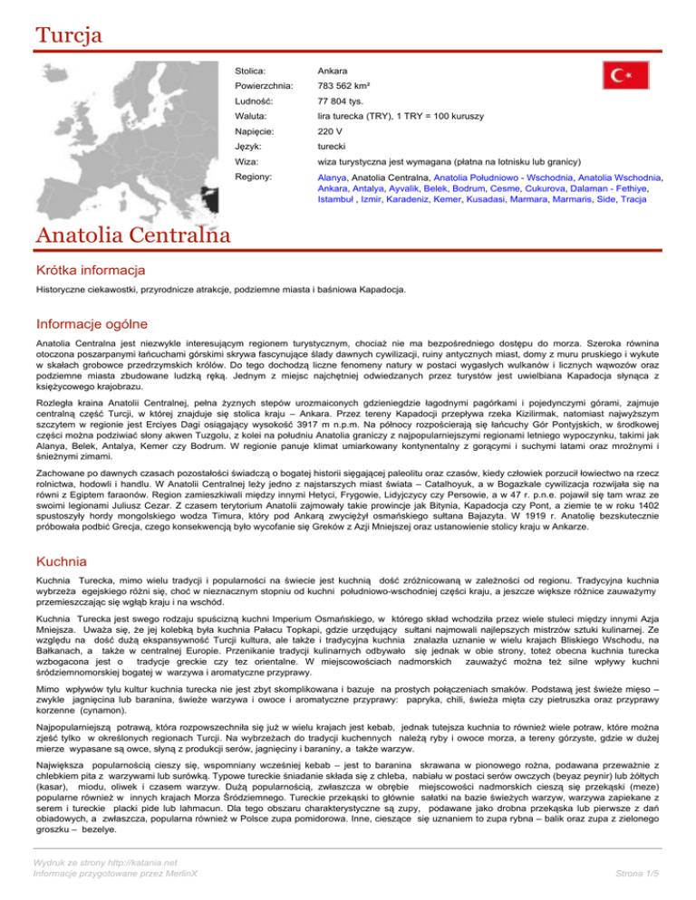 Turcja Stolica: Ankara Powierzchnia: 783 562 km² Ludność: 77 804 tys. Waluta: lira turecka (TRY), 1 TRY = 100 kuruszy Napięcie: 220 V Język: turecki Wiza: wiza turystyczna jest wymagana (płatna na lotnisku lub granicy) Regiony: Alanya, Anatolia Centralna, Anatolia Południowo - Wschodnia, Anatolia Wschodnia, Ankara, Antalya, Ayvalik, Belek, Bodrum, Cesme, Cukurova, Dalaman - Fethiye, Istambuł , Izmir, Karadeniz, Kemer, Kusadasi, Marmara, Marmaris, Side, Tracja Anatolia Centralna Krótka informacja Historyczne ciekawostki, przyrodnicze atrakcje, podziemne miasta i baśniowa Kapadocja. Informacje ogólne Anatolia Centralna jest niezwykle interesującym regionem turystycznym, chociaż nie ma bezpośredniego dostępu do morza. Szeroka równina otoczona poszarpanymi łańcuchami górskimi skrywa fascynujące ślady dawnych cywilizacji, ruiny antycznych miast, domy z muru pruskiego i wykute w skałach grobowce przedrzymskich królów. Do tego dochodzą liczne fenomeny natury w postaci wygasłych wulkanów i licznych wąwozów oraz podziemne miasta zbudowane ludzką ręką. Jednym z miejsc najchętniej odwiedzanych przez turystów jest uwielbiana Kapadocja słynąca z księżycowego krajobrazu. Rozległa kraina Anatolii Centralnej, pełna żyznych stepów urozmaiconych gdzieniegdzie łagodnymi pagórkami i pojedynczymi górami, zajmuje centralną część Turcji, w której znajduje się stolica kraju – Ankara. Przez tereny Kapadocji przepływa rzeka Kizilirmak, natomiast najwyższym szczytem w regionie jest Erciyes Dagi osiągający wysokość 3917 m n.p.m. Na północy rozpościerają się łańcuchy Gór Pontyjskich, w środkowej części można podziwiać słony akwen Tuzgolu, z kolei na południu Anatolia graniczy z najpopularniejszymi regionami letniego wypoczynku, takimi jak Alanya, Belek, Antalya, Kemer czy Bodrum. W regionie panuje klimat umiarkowany kontynentalny z gorącymi i suchymi latami oraz mroźnymi i śnieżnymi zimami. Zachowane po dawnych czasach pozostałości świadczą o bogatej historii sięgającej paleolitu oraz czasów, kiedy człowiek porzucił łowiectwo na rzecz rolnictwa, hodowli i handlu. W Anatolii Centralnej leży jedno z najstarszych miast świata – Catalhoyuk, a w Bogazkale cywilizacja rozwijała się na równi z Egiptem faraonów. Region zamieszkiwali między innymi Hetyci, Frygowie, Lidyjczycy czy Persowie, a w 47 r. p.n.e. pojawił się tam wraz ze swoimi legionami Juliusz Cezar. Z czasem terytorium Anatolii zajmowały takie prowincje jak Bitynia, Kapadocja czy Pont, a ziemie te w roku 1402 spustoszyły hordy mongolskiego wodza Timura, który pod Ankarą zwyciężył osmańskiego sułtana Bajazyta. W 1919 r. Anatolię bezskutecznie próbowała podbić Grecja, czego konsekwencją było wycofanie się Greków z Azji Mniejszej oraz ustanowienie stolicy kraju w Ankarze. Kuchnia Kuchnia Turecka, mimo wielu tradycji i popularności na świecie jest kuchnią dość zróżnicowaną w zależności od regionu. Tradycyjna kuchnia wybrzeża egejskiego różni się, choć w nieznacznym stopniu od kuchni południowo-wschodniej części kraju, a jeszcze większe różnice zauważymy przemieszczając się wgłąb kraju i na wschód. Kuchnia Turecka jest swego rodzaju spuścizną kuchni Imperium Osmańskiego, w którego skład wchodziła przez wiele stuleci między innymi Azja Mniejsza. Uważa się, że jej kolebką była kuchnia Pałacu Topkapi, gdzie urzędujący sułtani najmowali najlepszych mistrzów sztuki kulinarnej. Ze względu na dość dużą ekspansywność Turcji kultura, ale także i tradycyjna kuchnia znalazła uznanie w wielu krajach Bliskiego Wschodu, na Bałkanach, a także w centralnej Europie. Przenikanie tradycji kulinarnych odbywało się jednak w obie strony, toteż obecna kuchnia turecka wzbogacona jest o tradycje greckie czy tez orientalne. W miejscowościach nadmorskich zauważyć można też silne wpływy kuchni śródziemnomorskiej bogatej w warzywa i aromatyczne przyprawy. Mimo wpływów tylu kultur kuchnia turecka nie jest zbyt skomplikowana i bazuje na prostych połączeniach smaków. Podstawą jest świeże mięso – zwykle jagnięcina lub baranina, świeże warzywa i owoce i aromatyczne przyprawy: papryka, chili, świeża mięta czy pietruszka oraz przyprawy korzenne (cynamon). Najpopularniejszą potrawą, która rozpowszechniła się już w wielu krajach jest kebab, jednak tutejsza kuchnia to również wiele potraw, które można zjeść tylko w określonych regionach Turcji. Na wybrzeżach do tradycji kuchennych należą ryby i owoce morza, a tereny górzyste, gdzie w dużej mierze wypasane są owce, słyną z produkcji serów, jagnięciny i baraniny, a także warzyw. Największa popularnością cieszy się, wspomniany wcześniej kebab – jest to baranina skrawana w pionowego rożna, podawana przeważnie z chlebkiem pita z warzywami lub surówką. Typowe tureckie śniadanie składa się z chleba, nabiału w postaci serów owczych (beyaz peynir) lub żółtych (kasar), miodu, oliwek i czasem warzyw. Dużą popularnością, zwłaszcza w obrębie miejscowości nadmorskich cieszą się przekąski (meze) popularne również w innych krajach Morza Śródziemnego. Tureckie przekąski to głównie sałatki na bazie świeżych warzyw, warzywa zapiekane z serem i tureckie placki pide lub lahmacun. Dla tego obszaru charakterystyczne są zupy, podawane jako drobna przekąska lub pierwsze z dań obiadowych, a zwłaszcza, popularna również w Polsce zupa pomidorowa. Inne, cieszące się uznaniem to zupa rybna – balik oraz zupa z zielonego groszku – bezelye. Wydruk ze strony http://katania.net Informacje przygotowane przez MerlinX Strona 1/5 Główny posiłek obiadowy opiera się na mięsie, do którego podawany jest ryż i warzywa. Ciekawym połączeniem jest też ryż duszony z mięsem jagnięcym w rosole z dodatkiem cynamonu oraz pistacji. Innym daniem mięsnym, które króluje w kuchni tureckiej są pulpeciki Kofte, serwowane z warzy