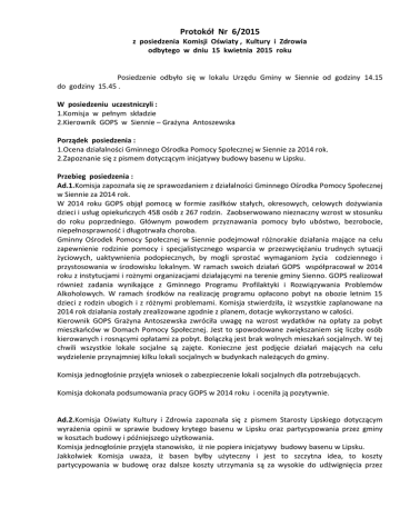 Protokół Nr 6/2015 z posiedzenia Komisji Oświaty , Kultury i Zdrowia odbytego w dniu 15 kwietnia 2015 roku Posiedzenie odbyło się w lokalu Urzędu Gminy w Siennie od godziny 14.15 do godziny 15.45 . W posiedzeniu uczestniczyli : 1.Komisja w pełnym składzie 2.Kierownik GOPS w Siennie – Grażyna Antoszewska Porządek posiedzenia : 1.Ocena działalności Gminnego Ośrodka Pomocy Społecznej w Siennie za 2014 rok. 2.Zapoznanie się z pismem dotyczącym inicjatywy budowy basenu w Lipsku. Przebieg posiedzenia : Ad.1.Komisja zapoznała się ze sprawozdaniem z działalności Gminnego Ośrodka Pomocy Społecznej w Siennie za 2014 rok. W 2014 roku GOPS objął pomocą w formie zasiłków stałych, okresowych, celowych dożywiania dzieci i usług opiekuńczych 458 osób z 267 rodzin. Zaobserwowano nieznaczny wzrost w stosunku do roku poprzedniego. Głównym powodem przyznawania pomocy było ubóstwo, bezrobocie, niepełnosprawność i długotrwała choroba. Gminny Ośrodek Pomocy Społecznej w Siennie podejmował różnorakie działania mające na celu zapewnienie rodzinie pomocy i specjalistycznego wsparcia w przezwyciężaniu trudnych sytuacji życiowych, uaktywnienia podopiecznych, by mogli sprostać wymaganiom życia codziennego i przystosowania w środowisku lokalnym. W ramach swoich działań GOPS współpracował w 2014 roku z instytucjami i rożnymi organizacjami działającymi na terenie gminy Sienno. GOPS realizował również zadania wynikające z Gminnego Programu Profilaktyki i Rozwiązywania Problemów Alkoholowych. W ramach środków na realizację programu opłacono pobyt na obozie letnim 15 dzieci z rodzin ubogich i z różnymi problemami. Komisja stwierdziła, iż wszystkie zaplanowane na 2014 rok działania zostały zrealizowane zgodnie z planem, dotacje wykorzystano w całości. Kierownik GOPS Grażyna Antoszewska zwróciła uwagę na wzrost wydatków na opłaty za pobyt mieszkańców w Domach Pomocy Społecznej. Jest to spowodowane zwiększaniem się liczby osób kierowanych i rosnącymi opłatami za pobyt. Bolączką jest brak wolnych mieszkań socjalnych. W tej chwili wszystkie lokale socjalne są zajęte. Konieczne jest podjęcie działań mających na celu wydzielenie przynajmniej kilku lokali socjalnych w budynkach należących do gminy. Komisja jednogłośnie przyjęła wniosek o zabezpieczenie lokali socjalnych dla potrzebujących. Komisja dokonała podsumowania pracy GOPS w 2014 roku i oceniła ją pozytywnie. Ad.2.Komisja Oświaty Kultury i Zdrowia zapoznała się z pismem Starosty Lipskiego dotyczącym wyrażenia opinii w sprawie budowy krytego basenu w Lipsku oraz partycypowania przez gminy w kosztach budowy i późniejszego użytkowania. Komisja jednogłośnie przyjęła stanowisko, iż nie popiera inicjatywy budowy basenu w Lipsku. Jakkolwiek Komisja uważa, iż basen byłby użyteczny i jest to szczytna idea, to koszty partycypowania w budowę oraz dalsze koszty utrzymania są za wysokie do udźwignięcia przez Gminę Sienno. Szacunkowy koszt budowy tego typu basenu kształtuje się w granicach 5 – 31 mln zł, a późniejsze roczne koszty dofinansowania do utrzymania ponoszone przez samorządy na przykładzie pływalni w Ożarowie i Kozienicach wynoszą 1-3,5 mln zł. Komisja uważa, iż gminy nie stać na ponoszenie tak dużych kosztów. Ponadto Komisja podkreślała, iż mieszkańcy gminy korzystają z pływalni w pobliskim Ostrowcu Świętokrzyskim oraz z basenów w Ożarowie oraz Kozienicach i jest to na chwilę obecną wystarczające. Na tym posiedzenie zakończono . Przewodnicząca Komisji Beata Ćwik