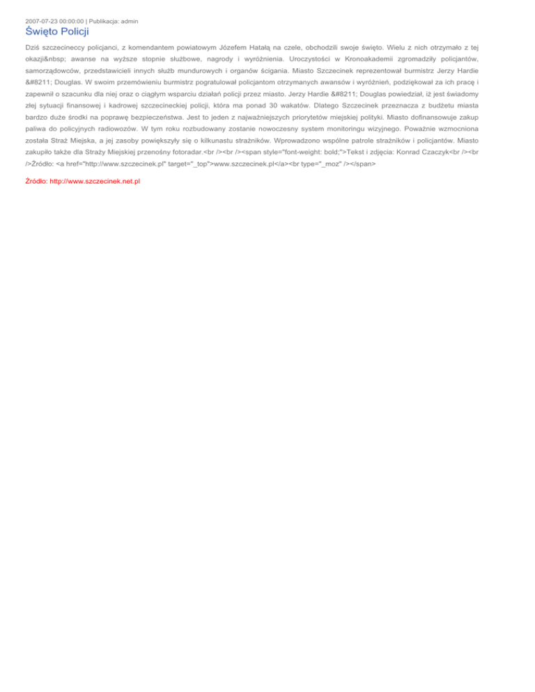 2007-07-23 00:00:00 | Publikacja: admin Święto Policji Dziś szczecineccy policjanci, z komendantem powiatowym Józefem Hatałą na czele, obchodzili swoje święto. Wielu z nich otrzymało z tej okazji awanse na wyższe stopnie służbowe, nagrody i wyróżnienia. Uroczystości w Kronoakademii zgromadziły policjantów, samorządowców, przedstawicieli innych służb mundurowych i organów ścigania. Miasto Szczecinek reprezentował burmistrz Jerzy Hardie – Douglas. W swoim przemówieniu burmistrz pogratulował policjantom otrzymanych awansów i wyróżnień, podziękował za ich pracę i zapewnił o szacunku dla niej oraz o ciągłym wsparciu działań policji przez miasto. Jerzy Hardie – Douglas powiedział, iż jest świadomy złej sytuacji finansowej i kadrowej szczecineckiej policji, która ma ponad 30 wakatów. Dlatego Szczecinek przeznacza z budżetu miasta bardzo duże środki na poprawę bezpieczeństwa. Jest to jeden z najważniejszych priorytetów miejskiej polityki. Miasto dofinansowuje zakup paliwa do policyjnych radiowozów. W tym roku rozbudowany zostanie nowoczesny system monitoringu wizyjnego. Poważnie wzmocniona została Straż Miejska, a jej zasoby powiększyły się o kilkunastu strażników. Wprowadzono wspólne patrole strażników i policjantów. Miasto zakupiło także dla Straży Miejskiej przenośny fotoradar.<br /><br /><span style="font-weight: bold;">Tekst i zdjęcia: Konrad Czaczyk<br /><br />Źródło: <a href="http://www.szczecinek.pl" target="_top">www.szczecinek.pl</a><br type="_moz" /></span> Źródło: http://www.szczecinek.net.pl